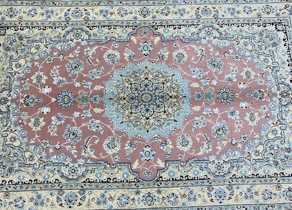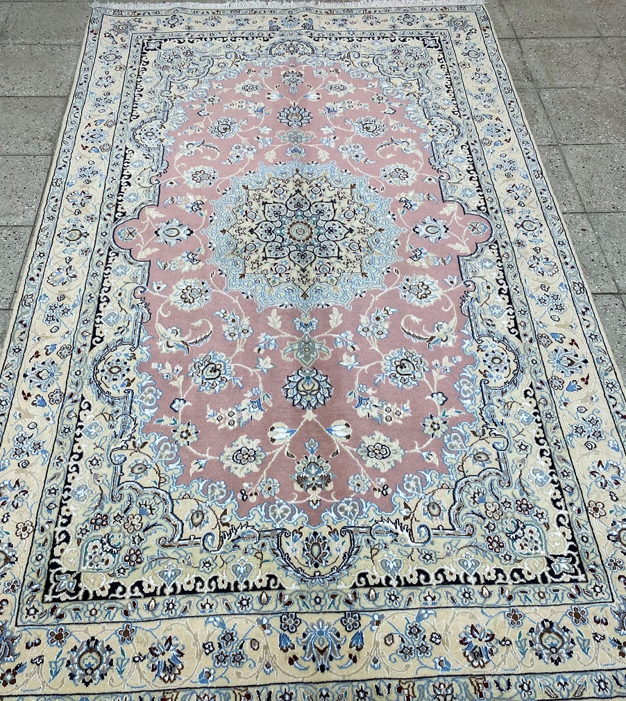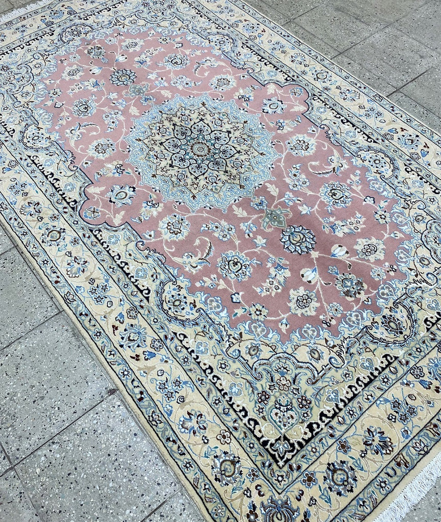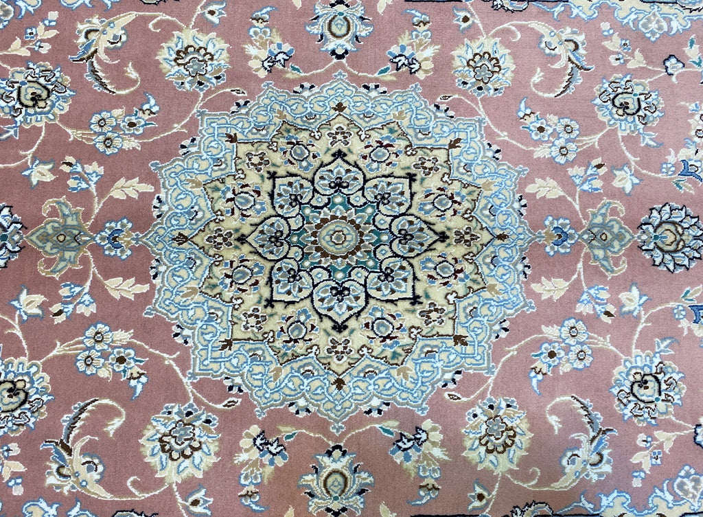 Superfine Room Size Authentic Hand Knotted Persian Nain Rug. Above All It Is Hard To Get This Quality Original Handmade Rugs In Such Unique Colours. Never The Less Its Pure Lamb’s Wool Pile on Cotton Base. Pastel Pink Background Dyed Using Traditional Methods.