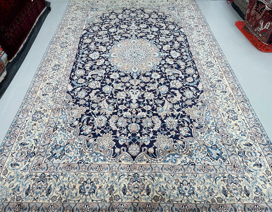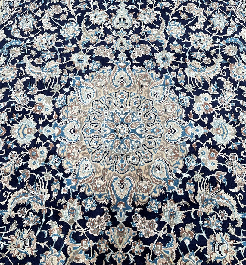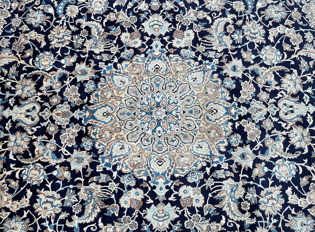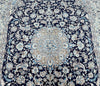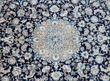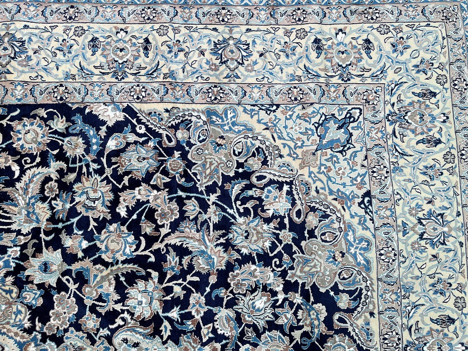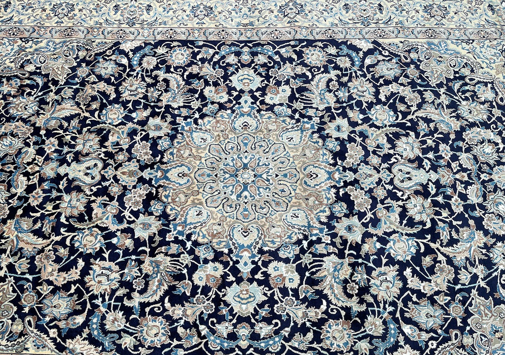 Superfine Large Room Size Authentic Hand Knotted Persian Nain Rug. Above All It Is A Fine Grade Of Nain Rug Woven On 9 Ply Base. Never The Less It Has a Lamb’s Wool And Silk Pile on Cotton Base. Indigo Blue, Beige, Light Blue And Brown Tones Dyed Using Traditional Methods.