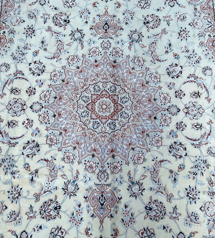 Superb Full Room Size Authentic Hand Knotted Persian Nain Carpet. Above All This Is A Finer Grade Of Nain Rugs Called 9 LA. It Also Has A Lamb’s Wool And Silk-Inlaid Pile On Cotton Base. Light Beige, Blue, Pink, Green And Touch Of Burgundy Tones Dyed Using Traditional Methods.
