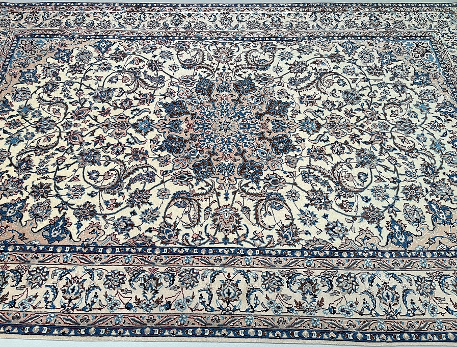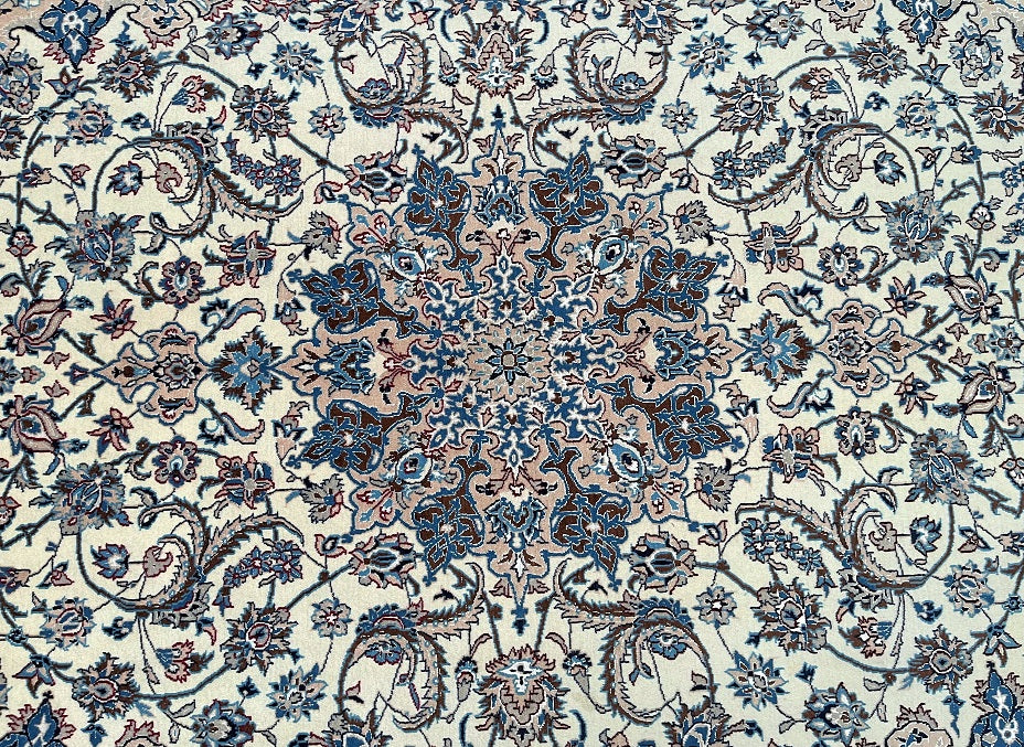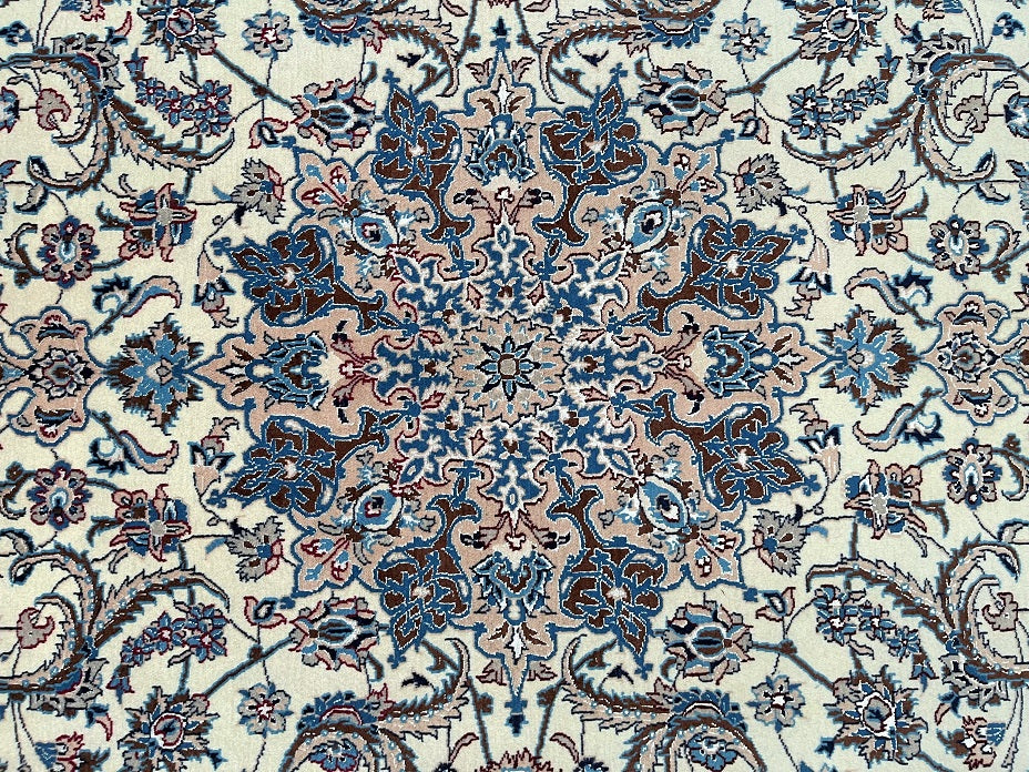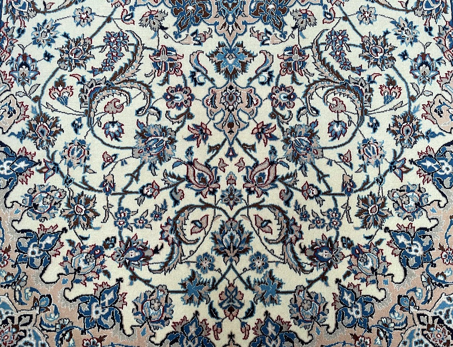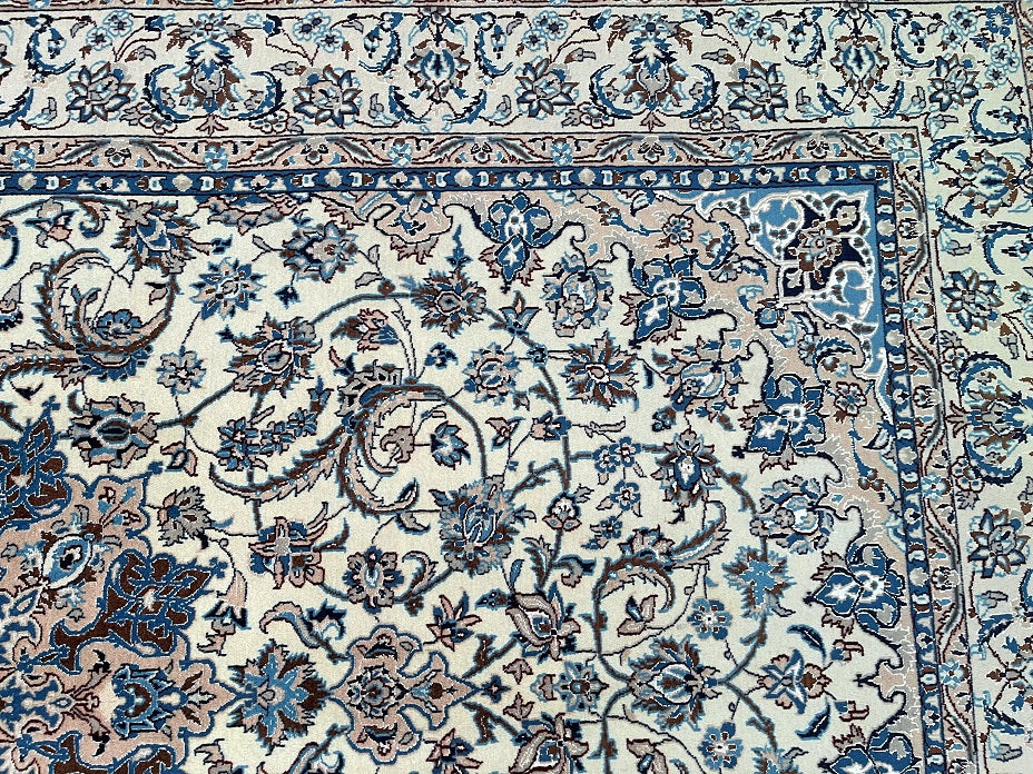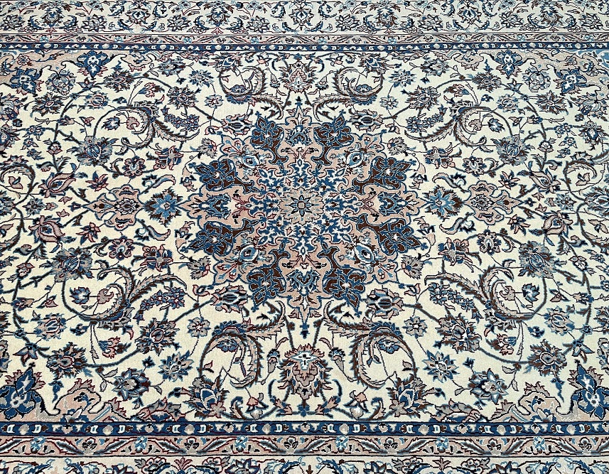 Superb Full Room Size Authentic Hand Knotted Persian Nain Carpet. Above All It Is Hard To Get This Quality Nain Rug In Larger Sizes. It Also Has A Lamb’s Wool And Silk-Inlaid Pile On Cotton Base. Beige, Blue, Black, Brown And Touch Of Maroon Tones Dyed Using Traditional Methods.