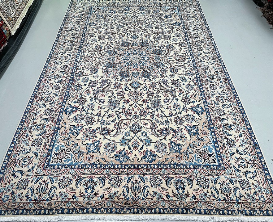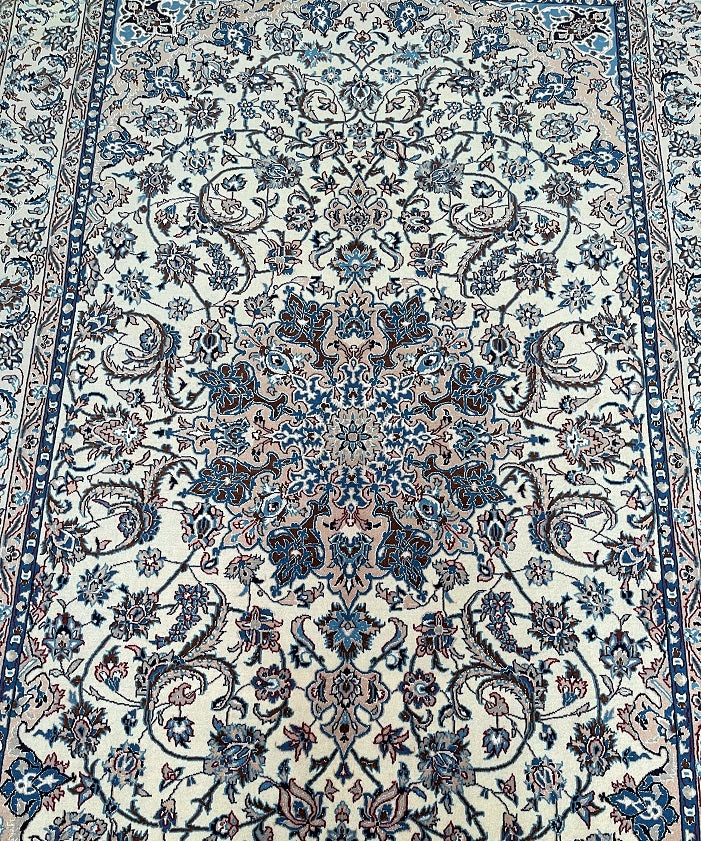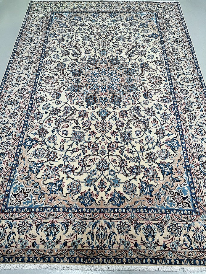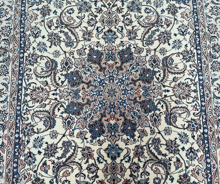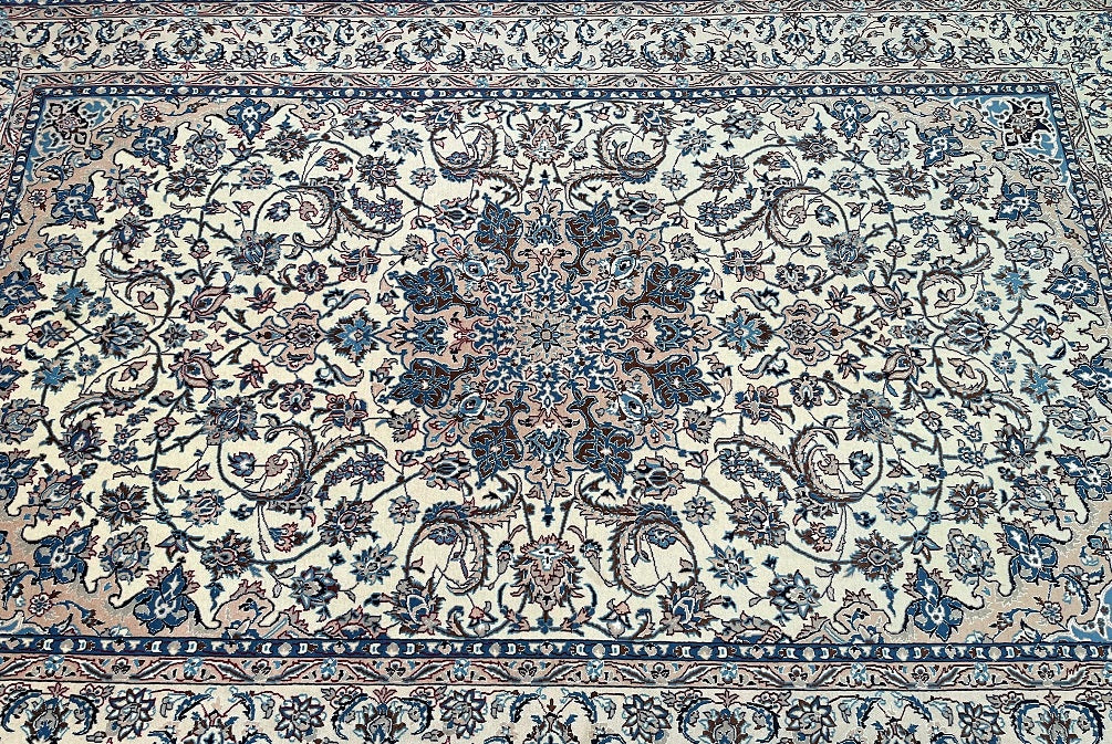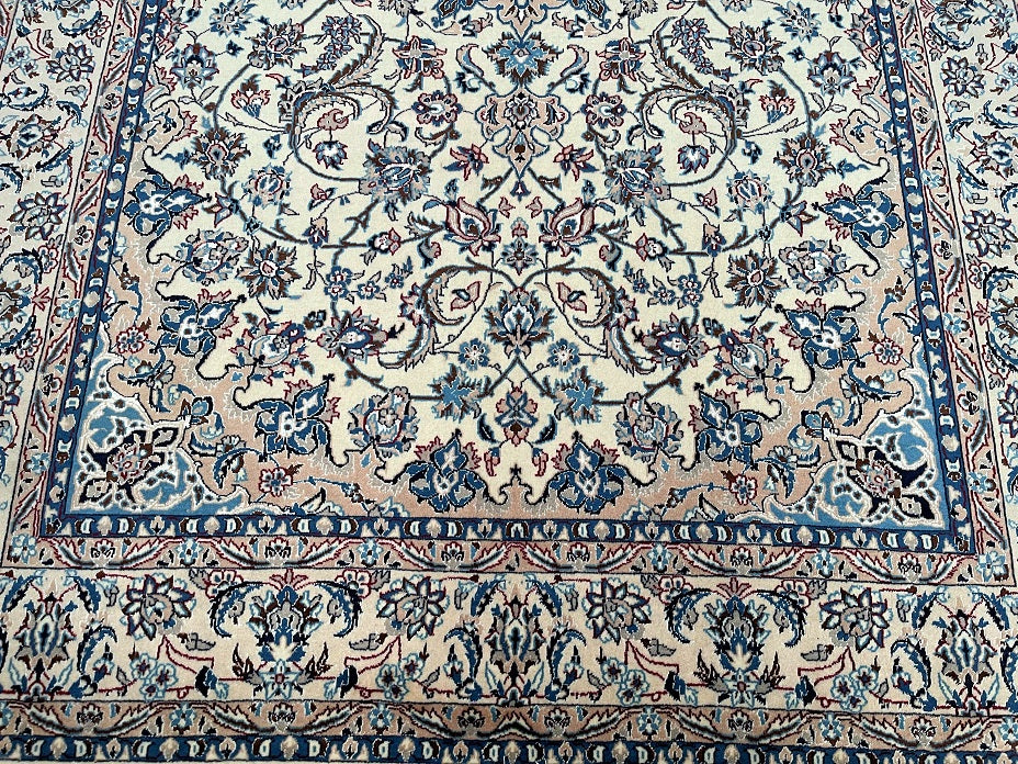 Superb Full Room Size Authentic Hand Knotted Persian Nain Carpet. Above All It Is Hard To Get This Quality Nain Rug In Larger Sizes. It Also Has A Lamb’s Wool And Silk-Inlaid Pile On Cotton Base. Beige, Blue, Black, Brown And Touch Of Maroon Tones Dyed Using Traditional Methods.