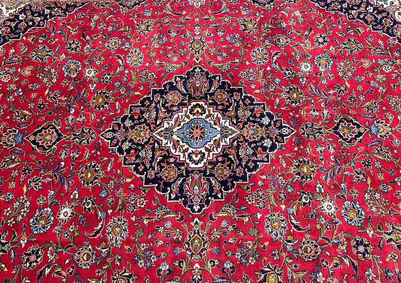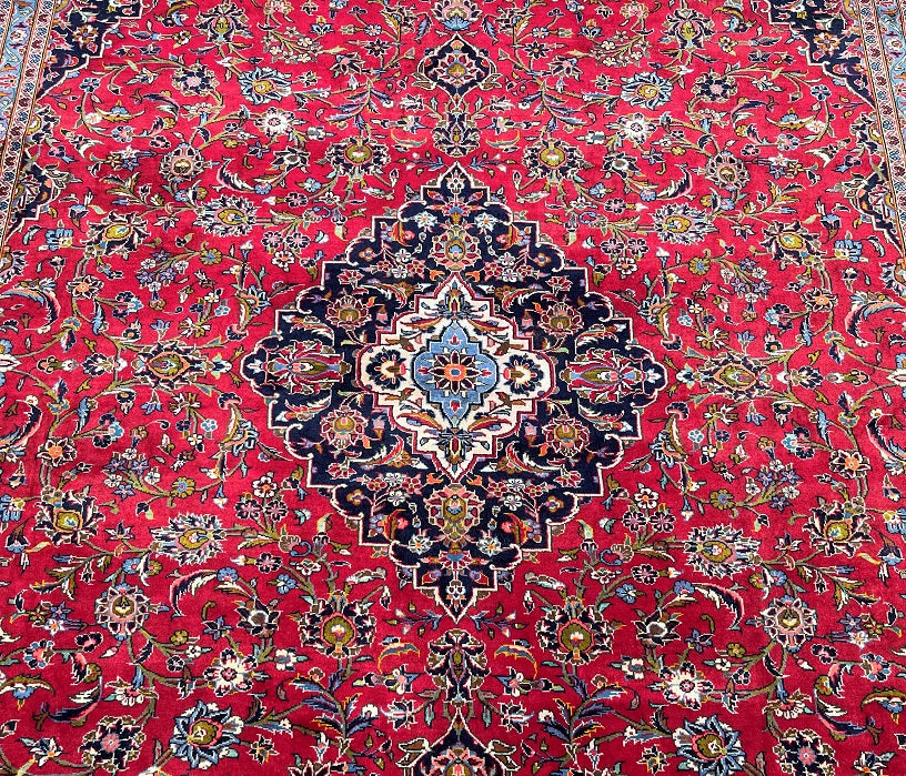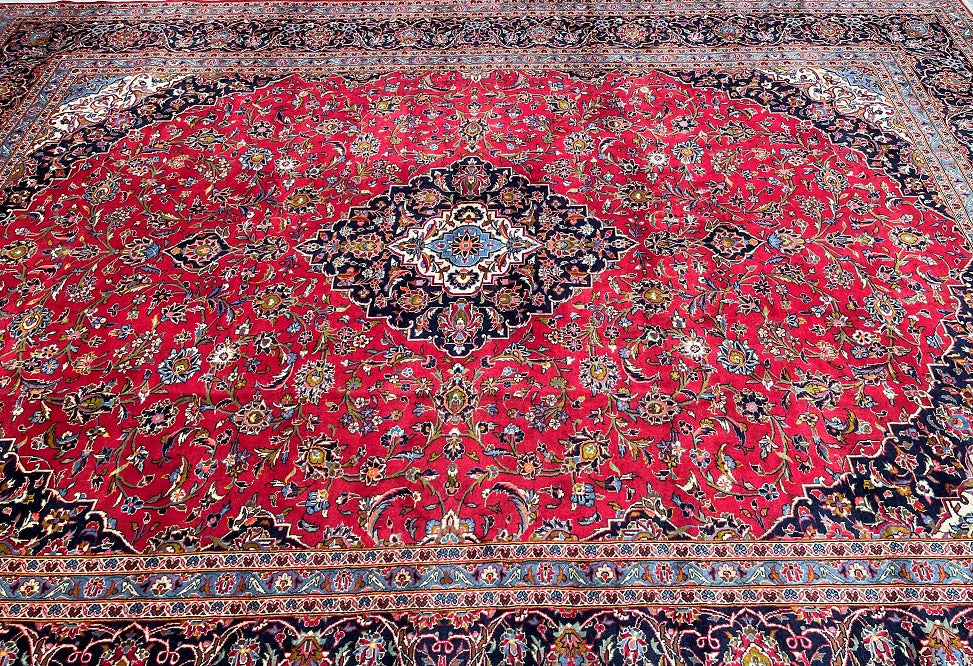 Superb Quality Large Room Size Authentic Handmade Persian Kashan Rug. Above All It Has a Pure Lamb’s Wool Pile on Cotton Base. Stunning Red, Blue, Beige, Green, Orange And Pink Tones Dyed Using Traditional Methods. Fine Quality Piece That Would Add Depth to Any Rug Collection.
