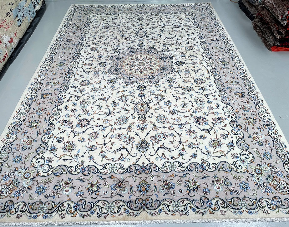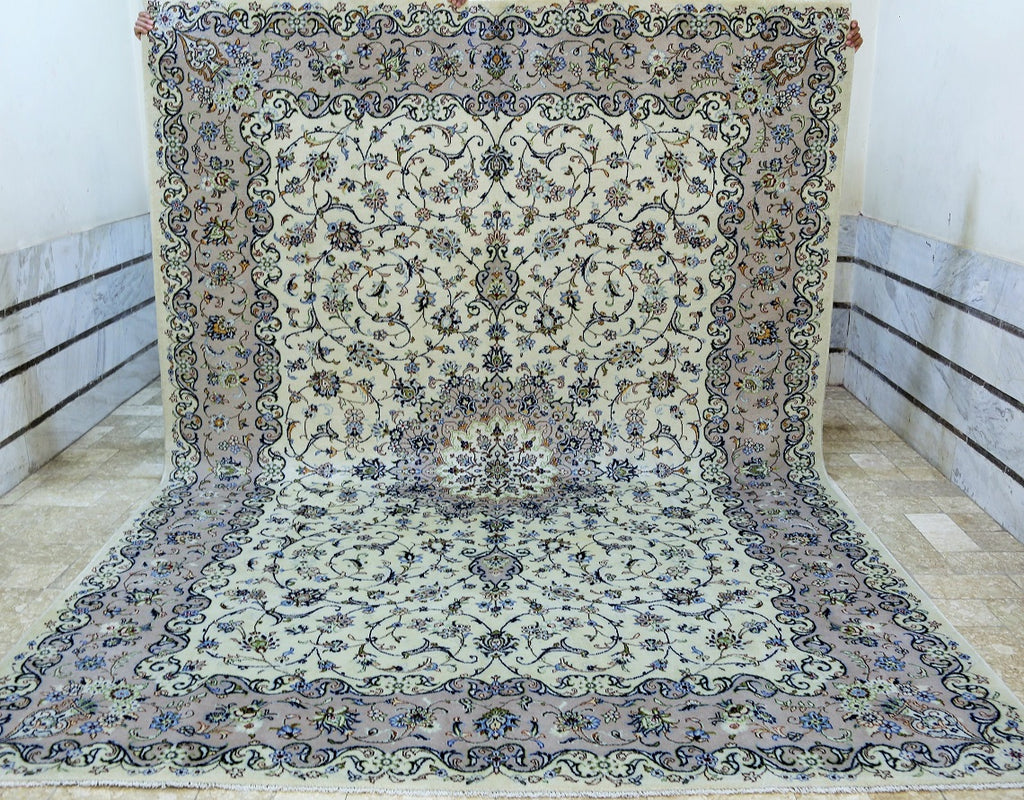Large Room Size Authentic Persian Traditional Kashan Rug. Above All It Has A Pure Lamb’s Wool Pile On Cotton Base. Soft Beige, Cream, Brown, Blue, Green And Red Tones Dyed Using Traditional Methods.