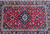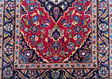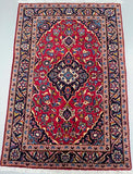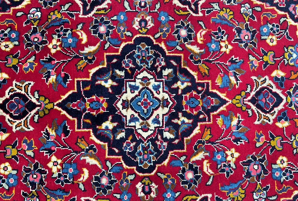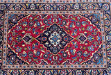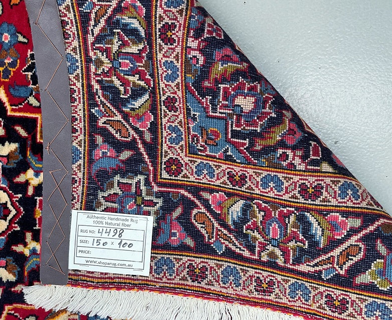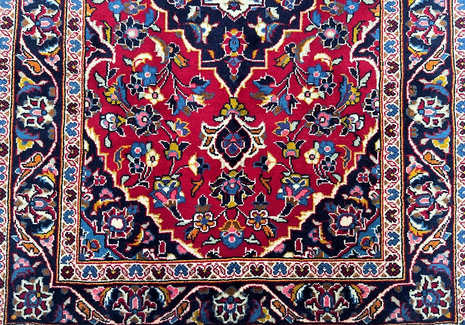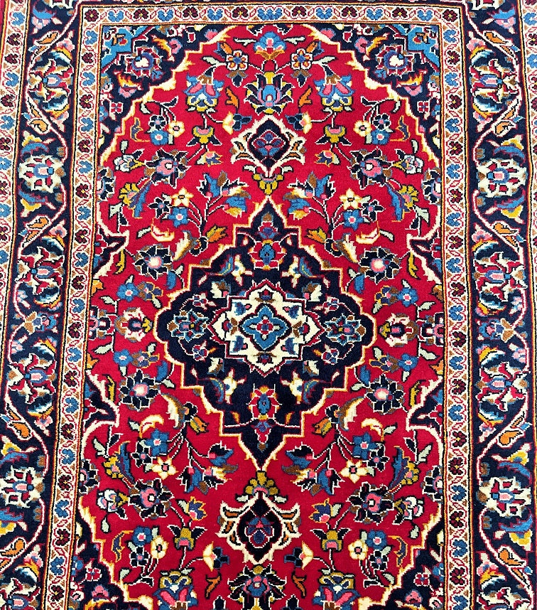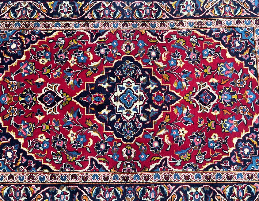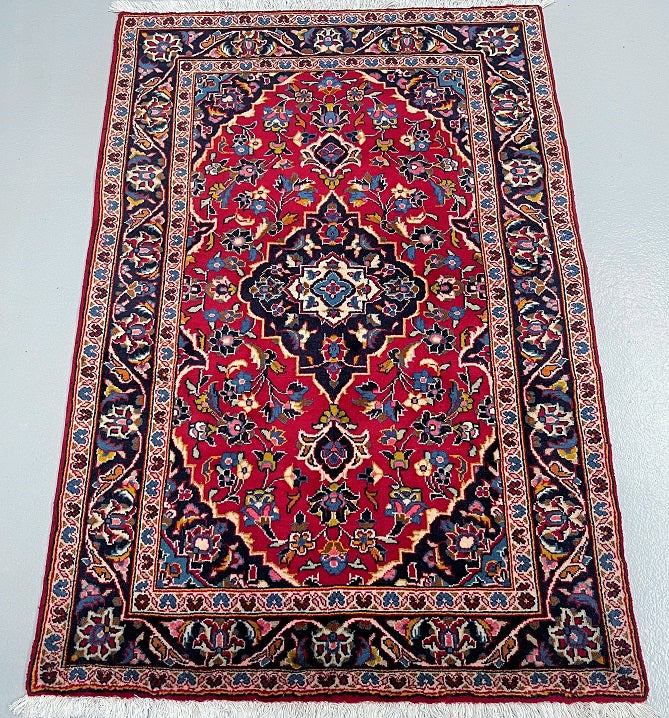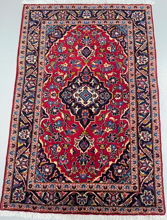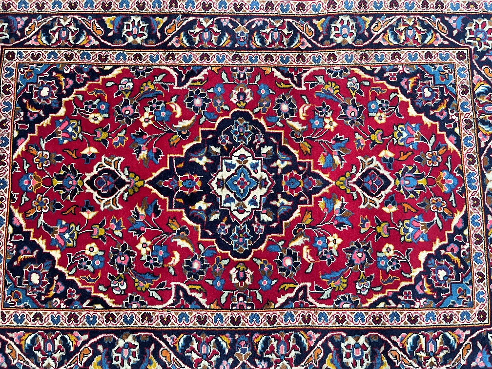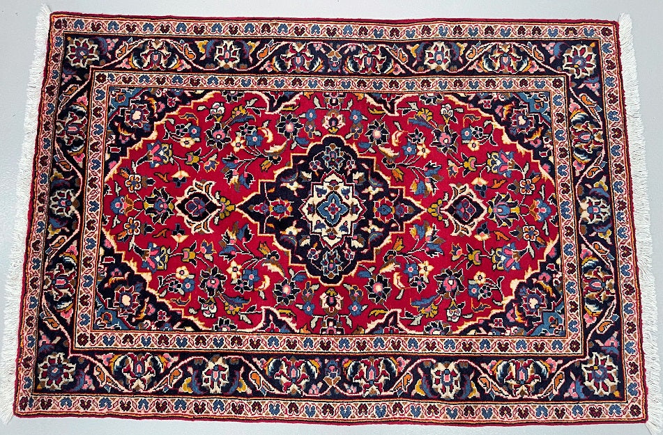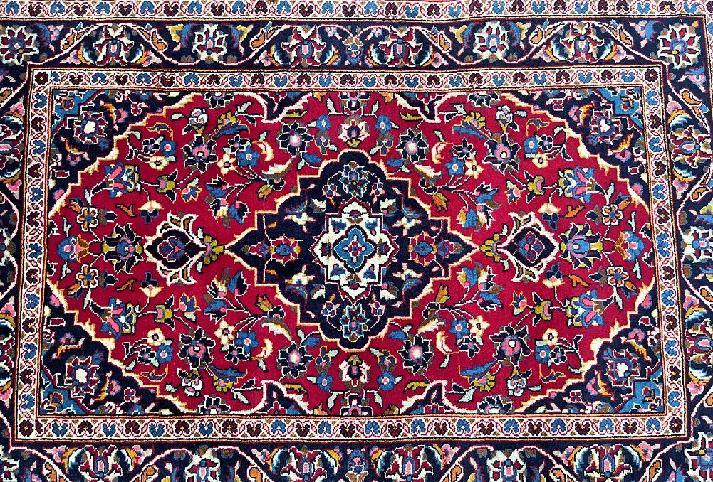 This Persian Kashan rug is the perfect size for a coffee table. It is an authentic handmade piece, crafted with precision and care. The rug features a pure lamb's wool pile on a cotton base, ensuring both softness and durability. The vibrant color palette includes shades of red, beige, aqua, green, pink, and indigo blue, all dyed using traditional methods. The central medallion floral design, known as the Royal pattern, adds a touch of elegance to the rug. The weaving process for this piece would have taken approximately 3 months, showcasing the skill and dedication of the weaver. Hand-woven in the central region of Persia, specifically in the city of Kashan, this rug measures 150 x 100 cm. Its gallery replacement value is estimated at $1790.