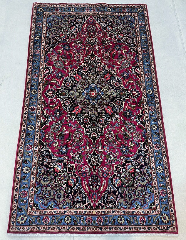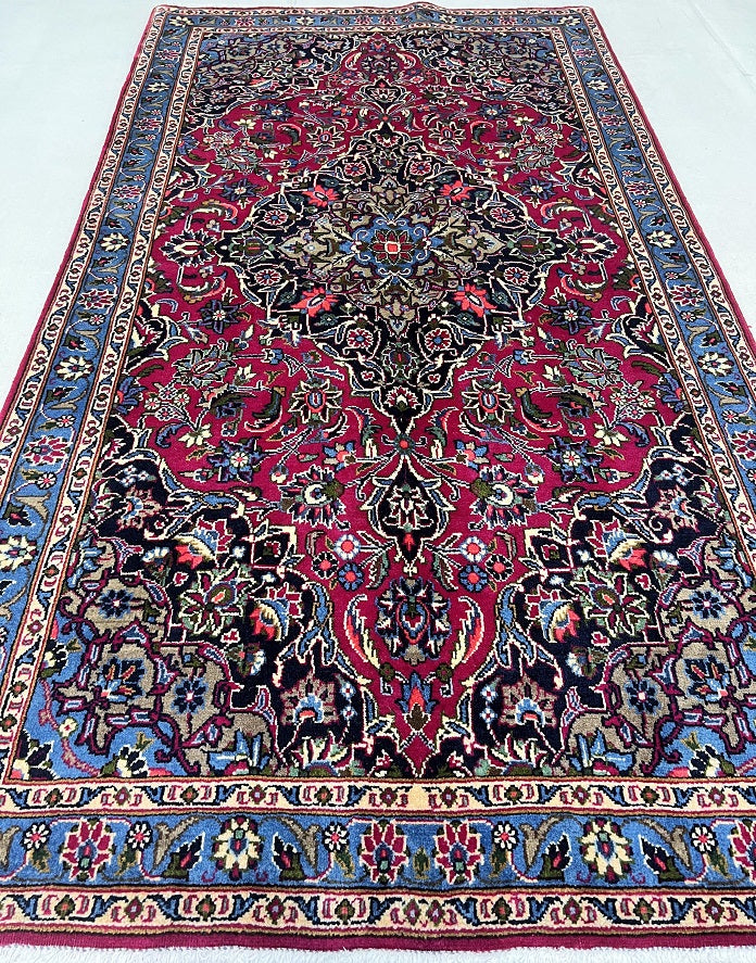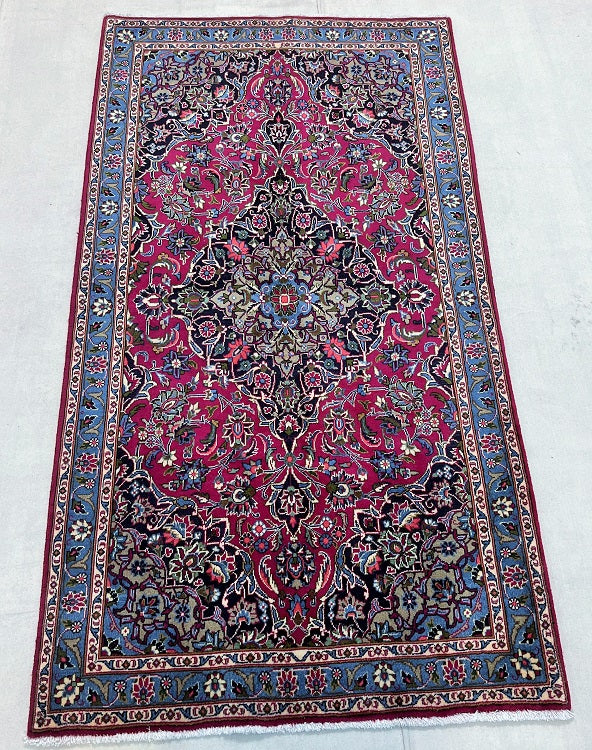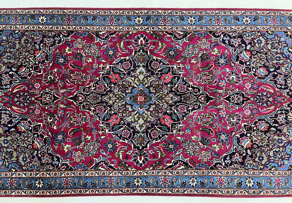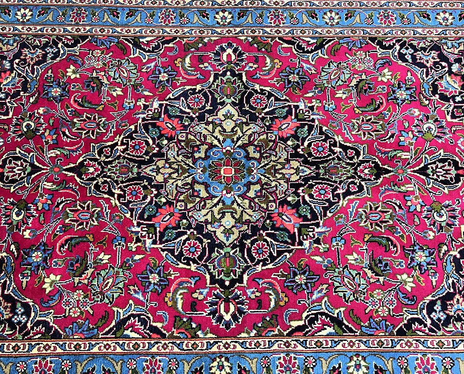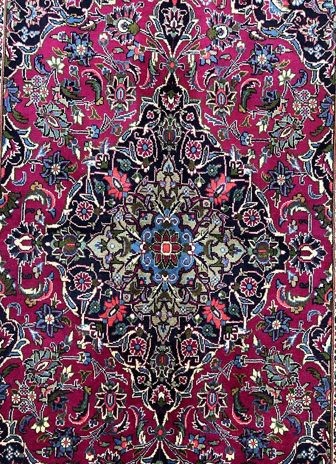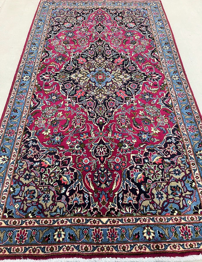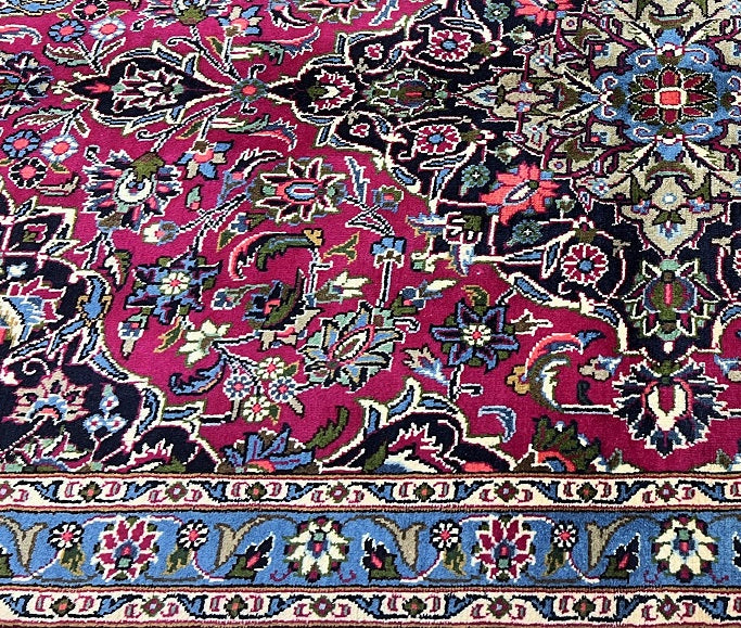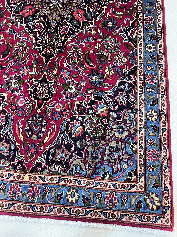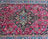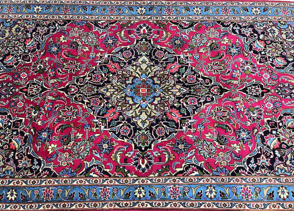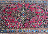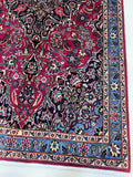 Rare Authentic Hand Knotted Persian Kashmar Rug. Above All It Has A Pure Lamb’s Wool Pile On Cotton Base. It Also Has A Magenta Red, Pink, Blue, Black And Green Tones Dyed Using Traditional Methods.