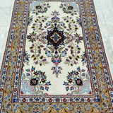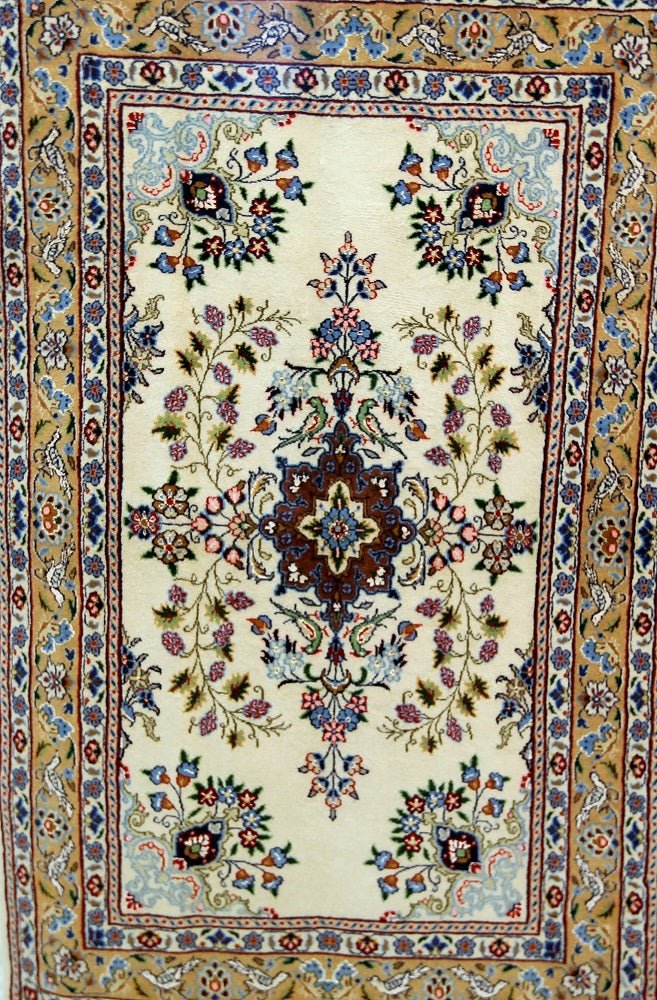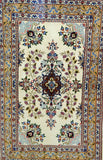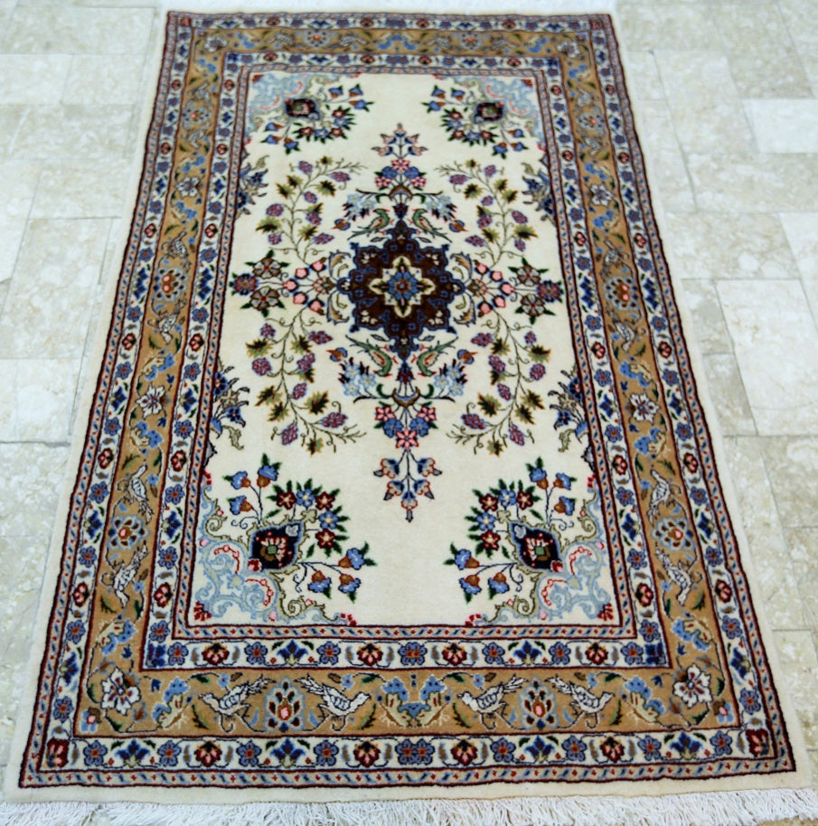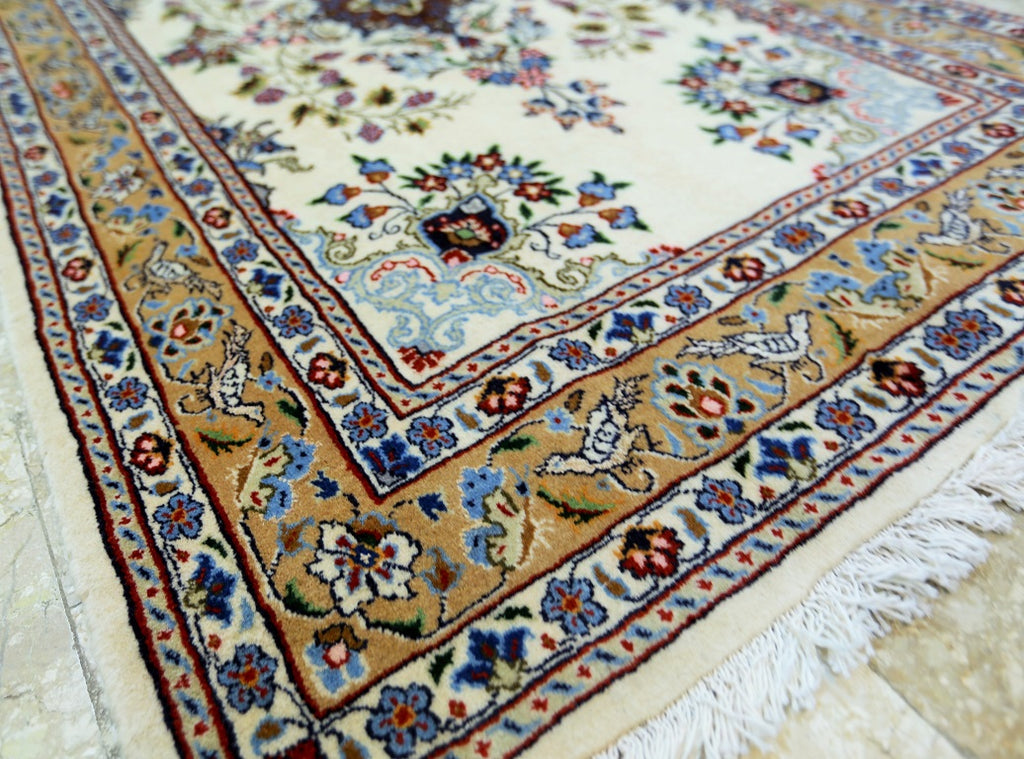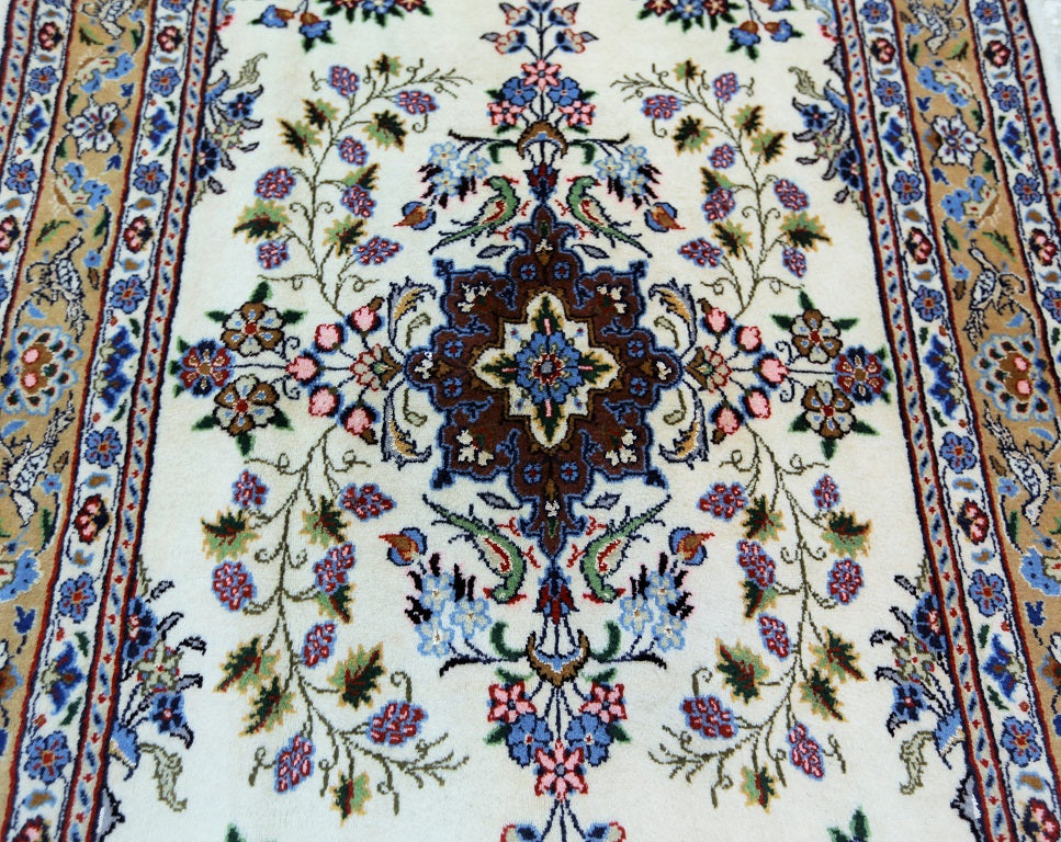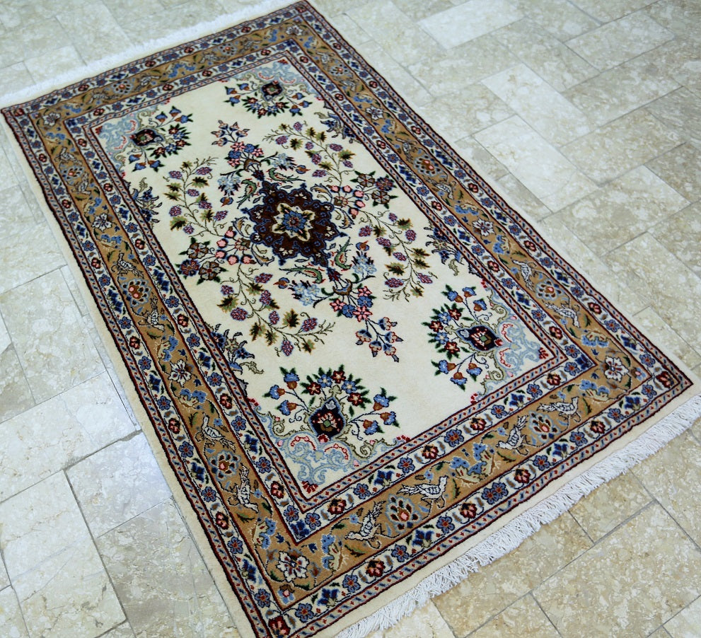Superb Silk inlay Hand Knotted Persian Mood Rug. Above All It Has a Lamb’s Wool + Touch of Silk Pile on Fine Cotton. It Also Has A Beige Background Dyed Using Traditional Methods. Very Fine Quality from City Of Birjand.