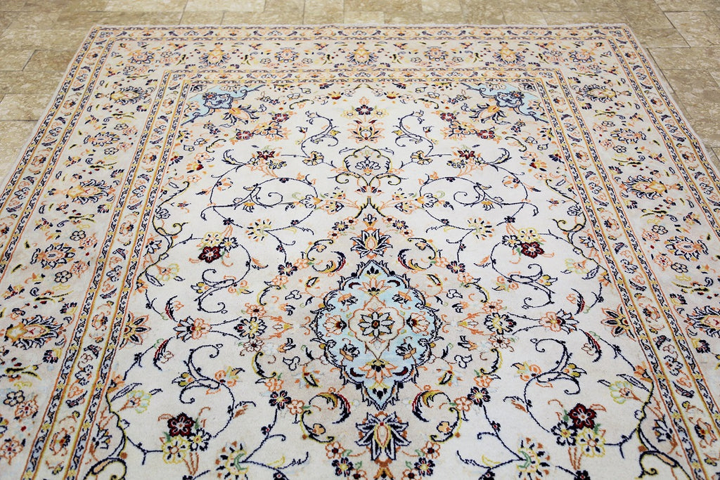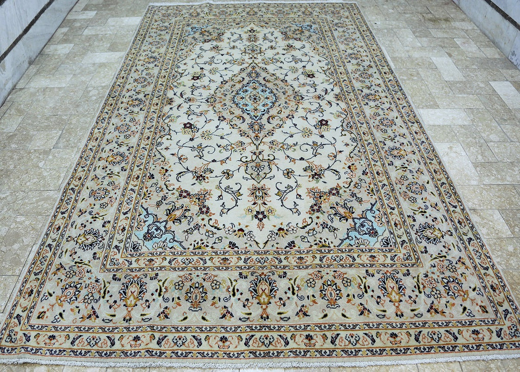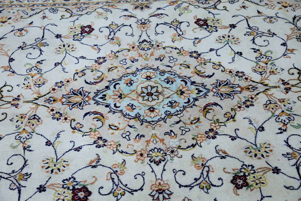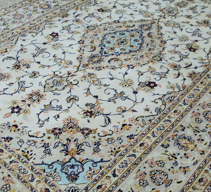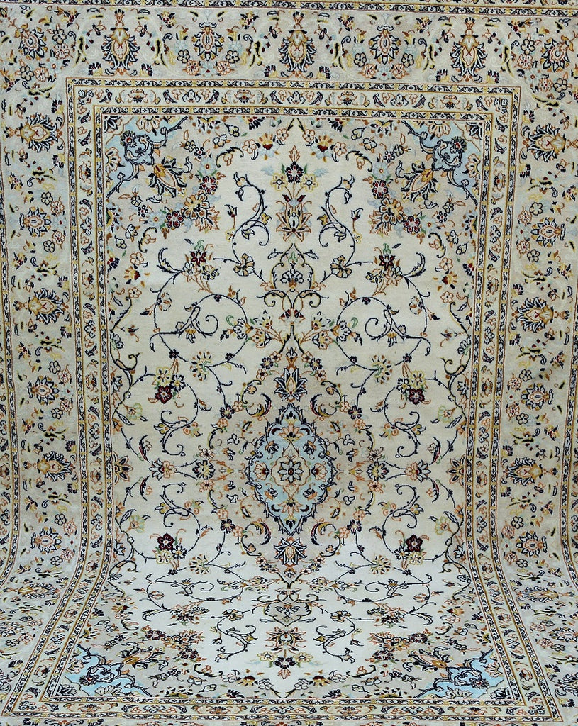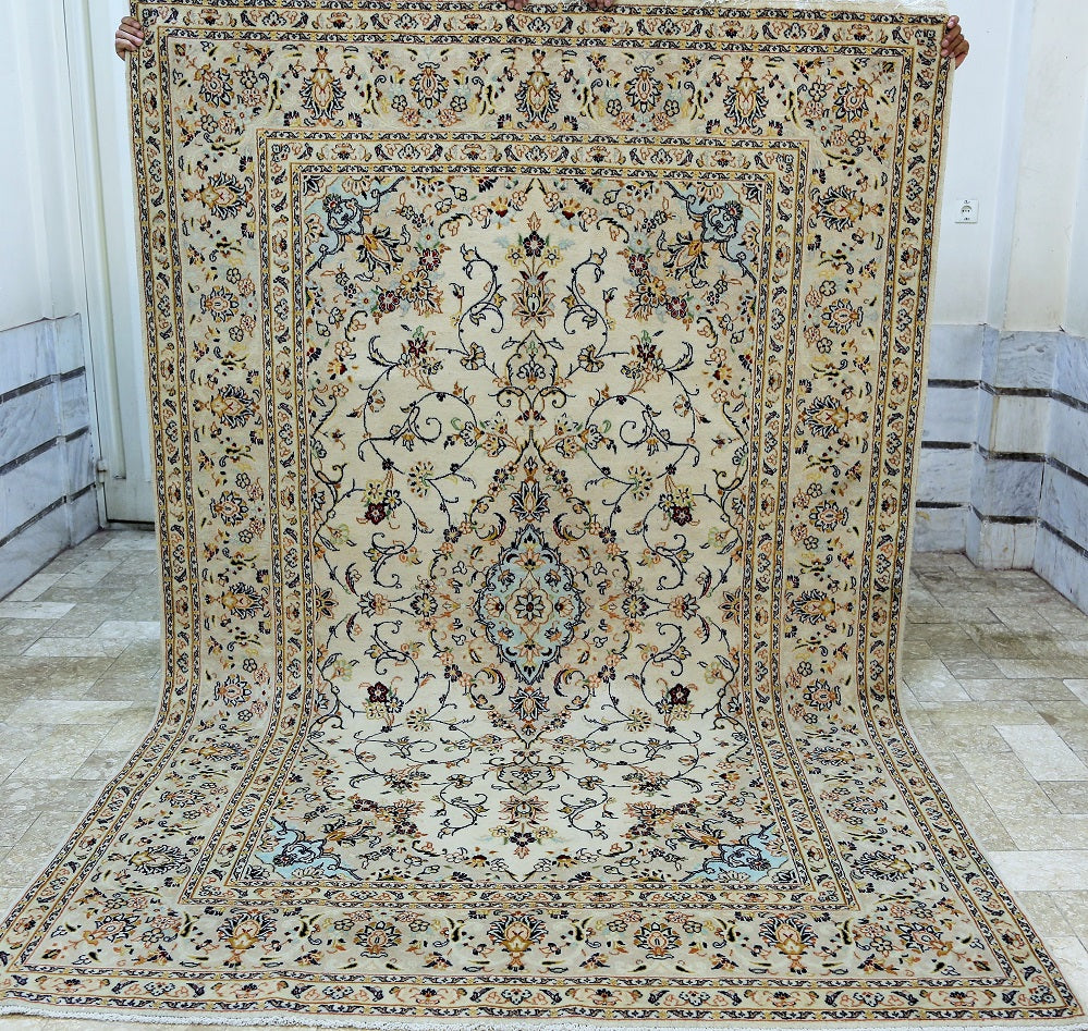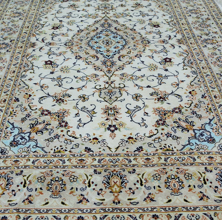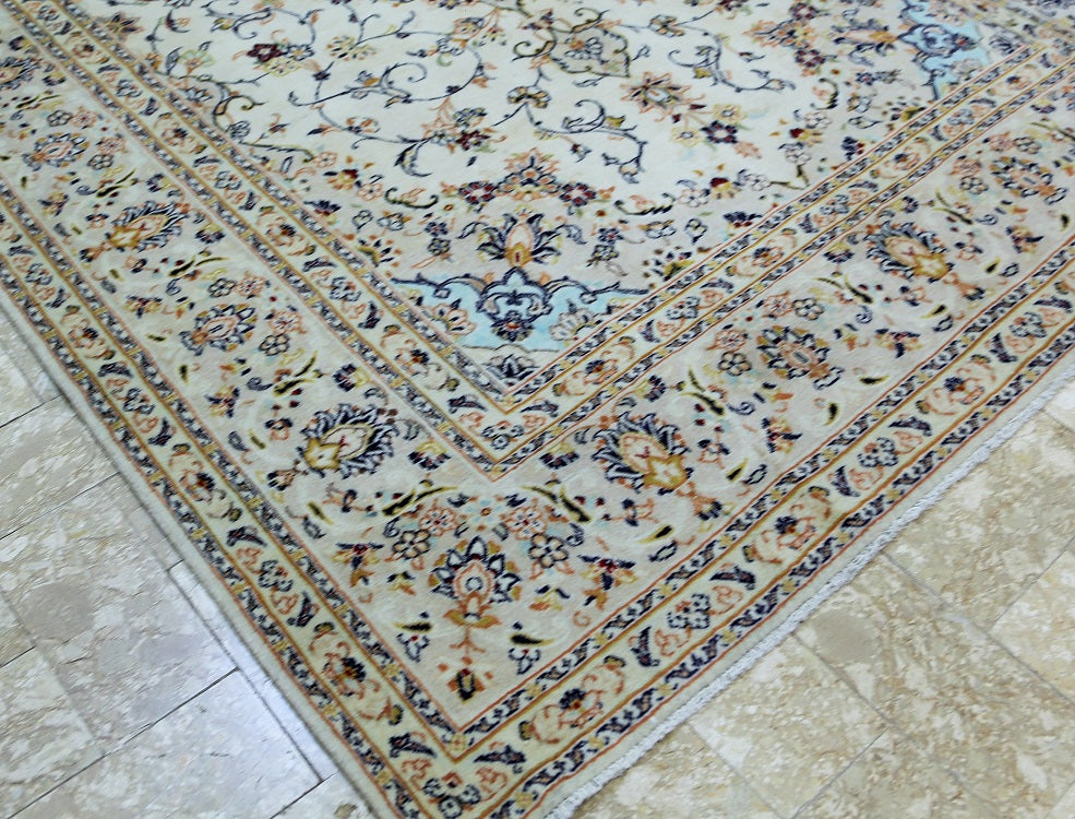 Full room size authentic persian Kashan carpet. First of all it is hard to weave this quality hand made rug in larger sizes. Above all it is pure lamb’s pile on cotton base. Beige tones dyed using traditional methods, dense quality piece from city of Kashan.
