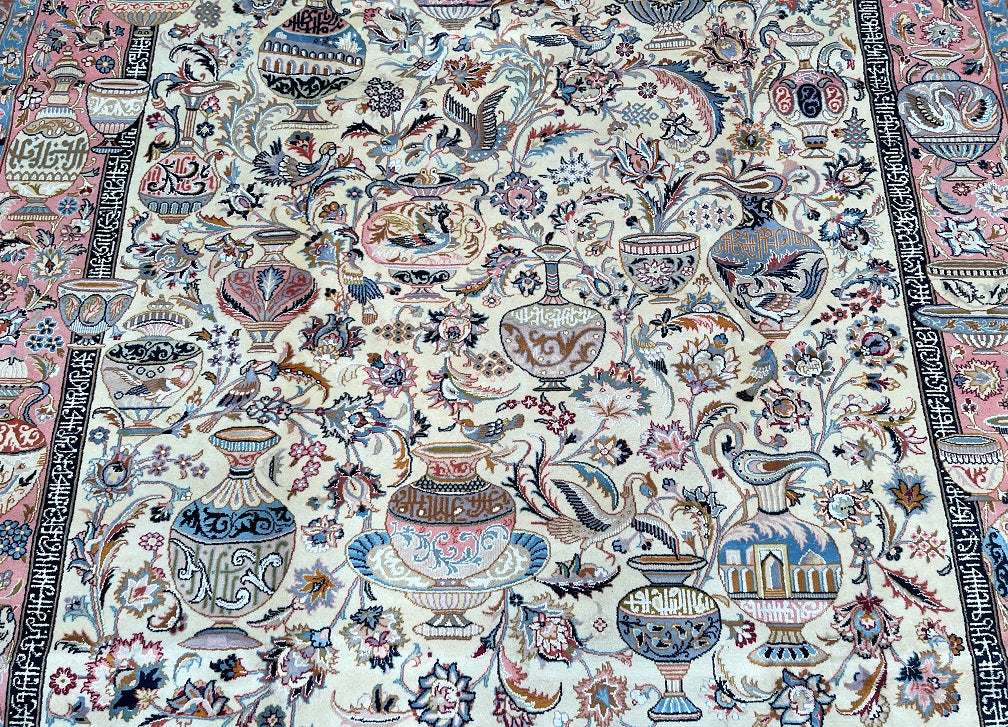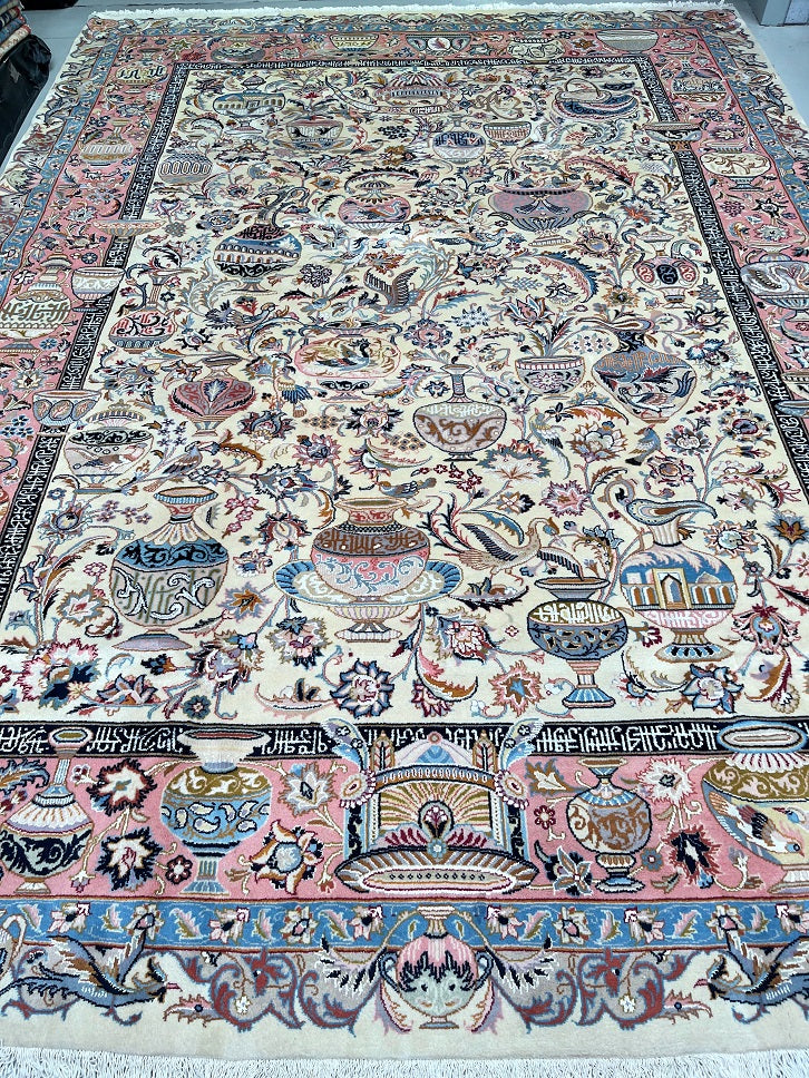 This exquisite Persian Kashmar rug a true gem, boasting a large room size and authentic handmade craftsmanship. Its unique pattern is a rarity, making it difficult to find another rug of this quality. The rug features a blend of lamb's wool and silk intricately woven onto a cotton base, showcasing beautiful tones of beige, blue, pink, black, and green. The dyes used in the rug are derived from traditional methods, adding to its authenticity. The design itself is a rare pictorial treasure, also known as the Archaeological pattern. The meticulous weaving process took two skilled weavers approximately 12 months to complete, highlighting the dedication and artistry involved. This masterpiece was hand-woven in the city of Kashmar, located in East Persia. With its impressive size measuring 400 x 290 cm, this carpet holds a gallery replacement value of $14,900.
