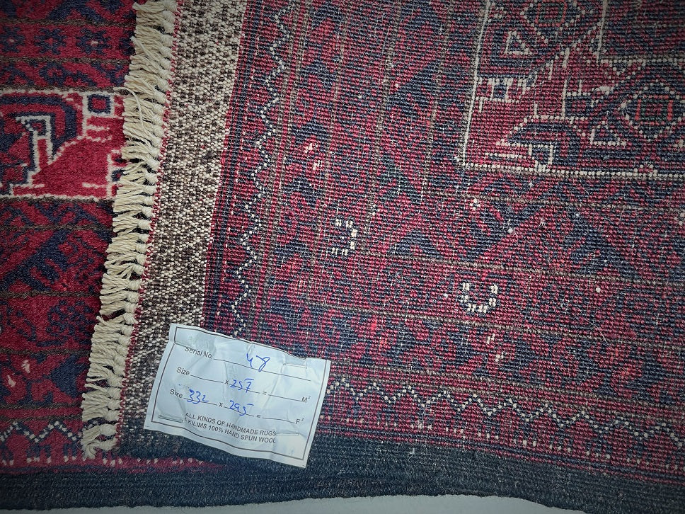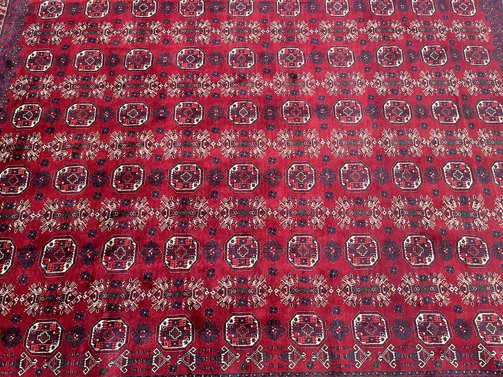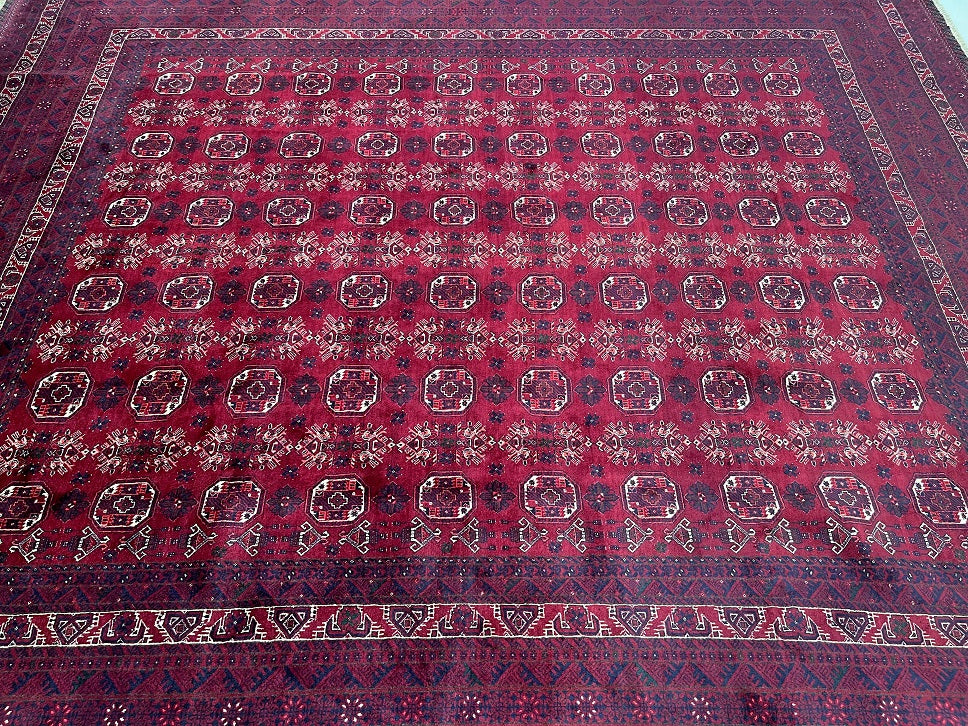 Almost Square Large Room Size Authentic Hand Knotted Afghan Bashiri Rug. Above All It Has A Lamb’s Wool Pile On Wool Base. It Also Has A Deep Burgundy/Maroon Tone Dyed Using Traditional Methods.
