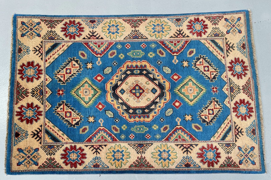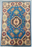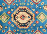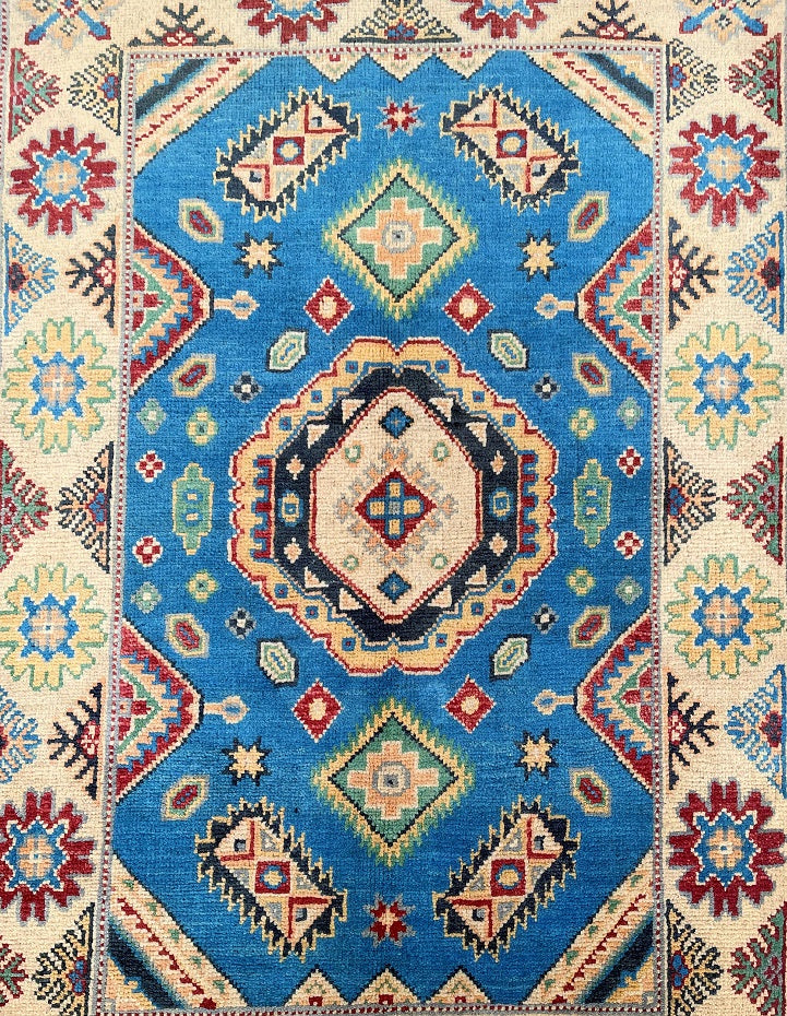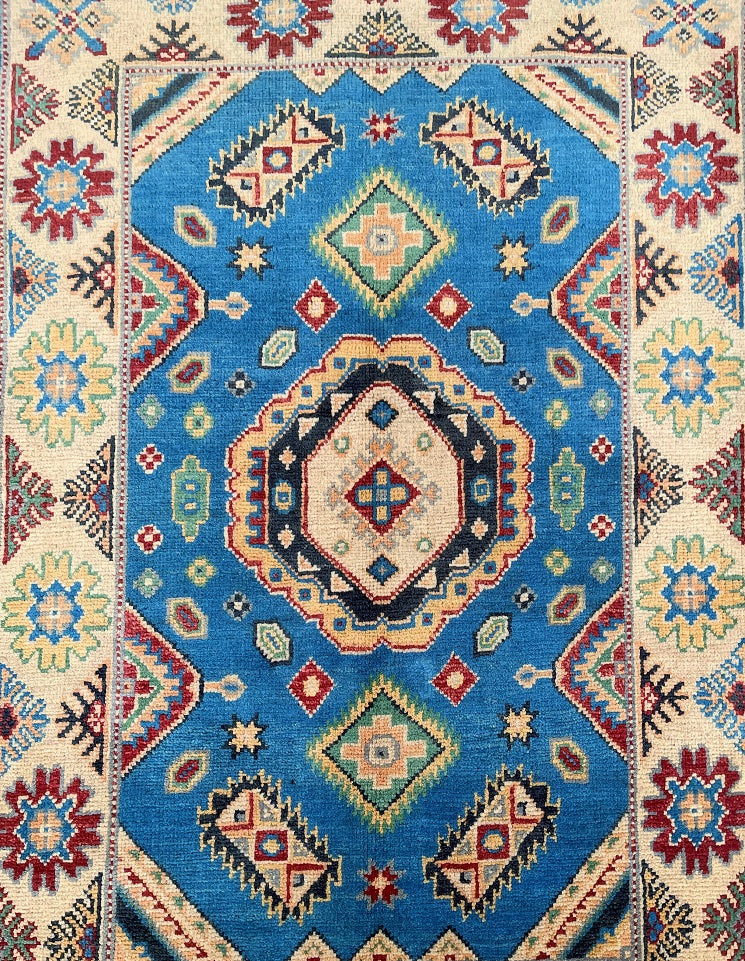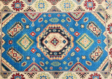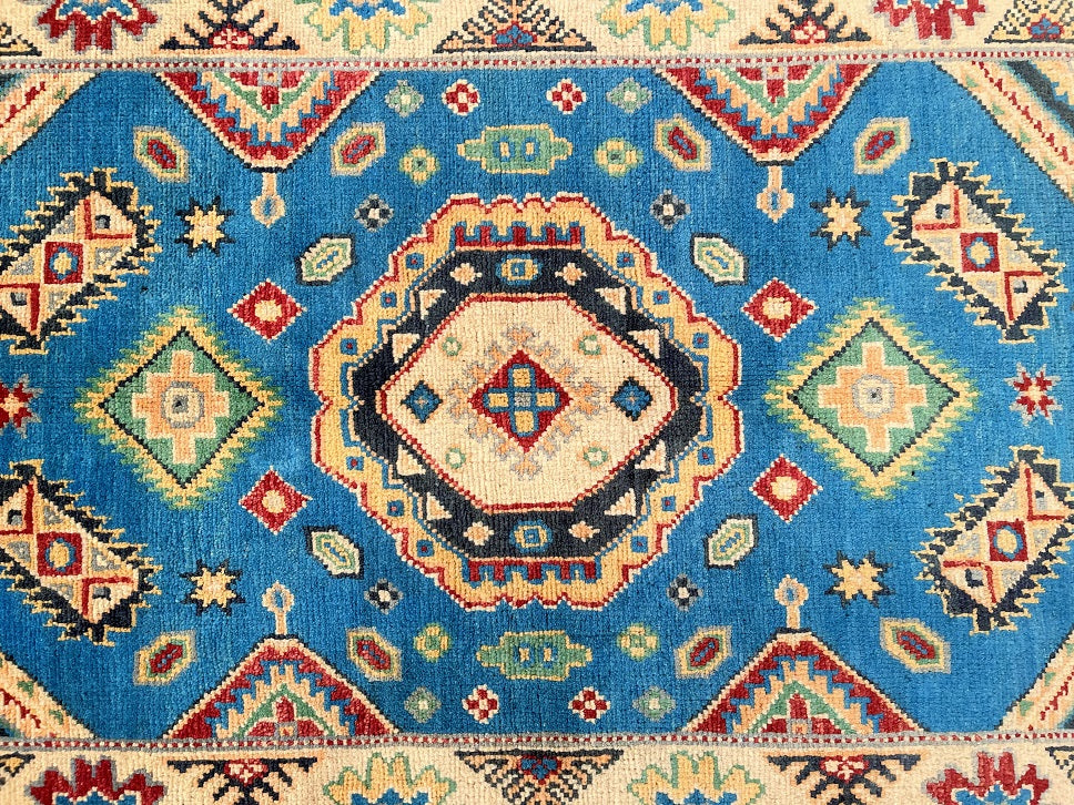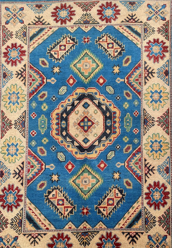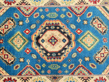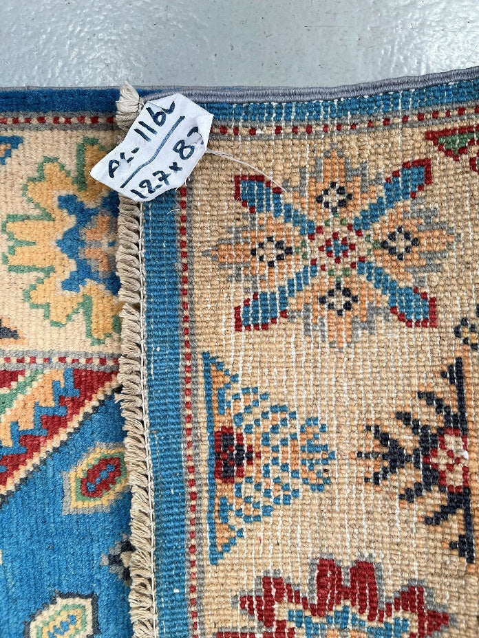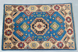 Durable Coffee Table Size Hand Knotted Afghan Kazak Rug. Above All It Is Pure Hand Spun Wool Pile On Cotton Base. Blue, Beige, Yellow, Green And Red Tones Dyed Using Traditional Methods (Vegetable Dyes). Last of True Woven Tribal Art.
