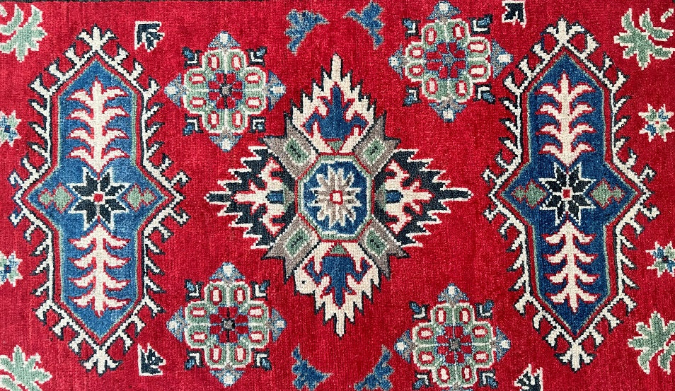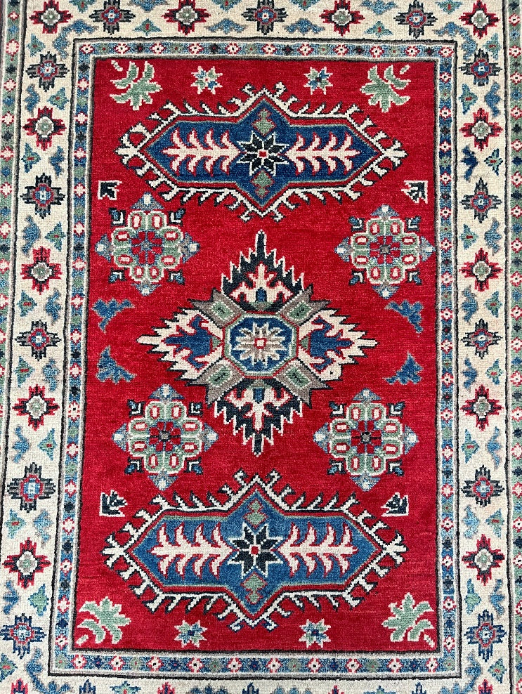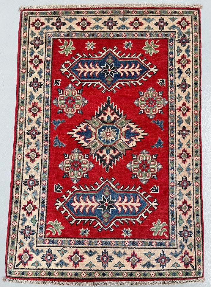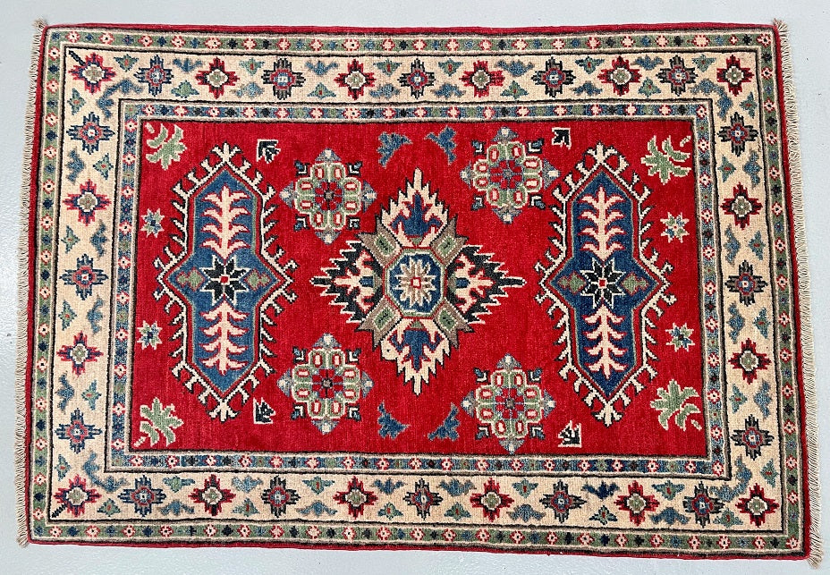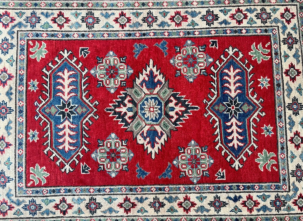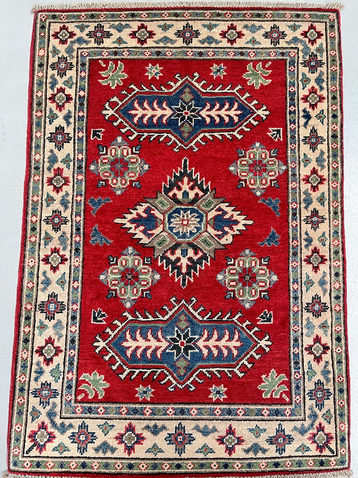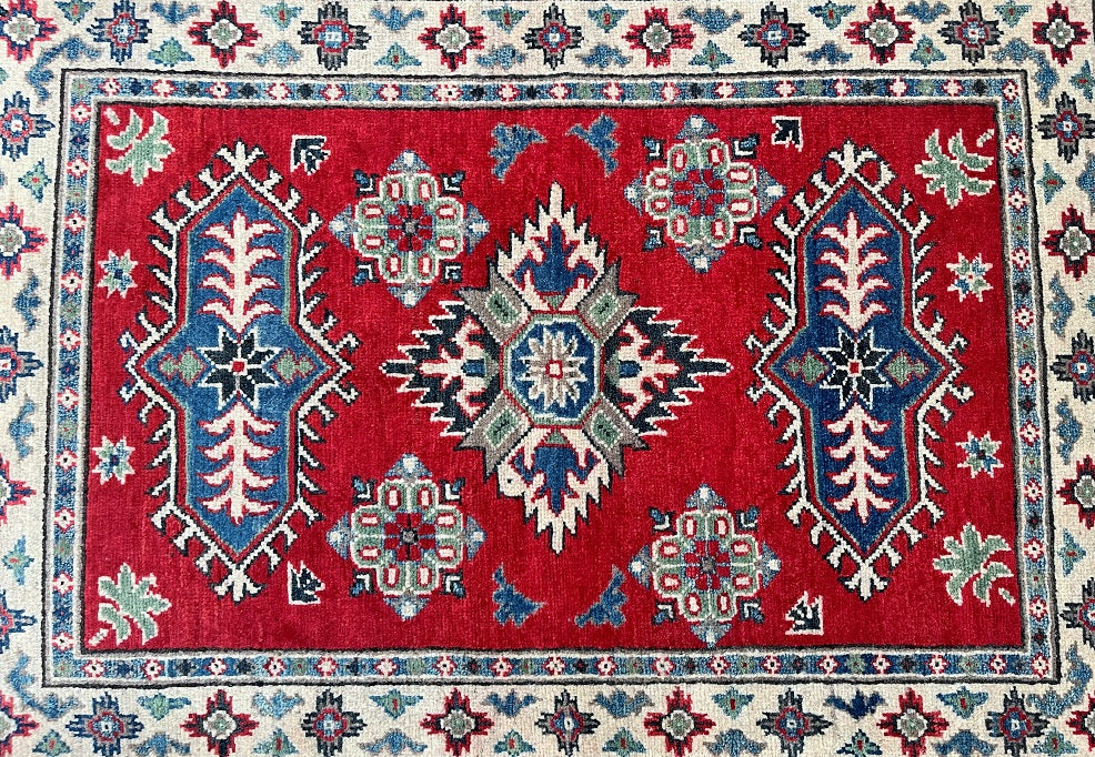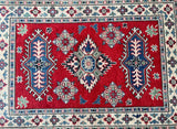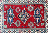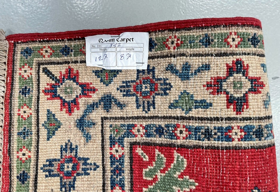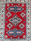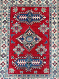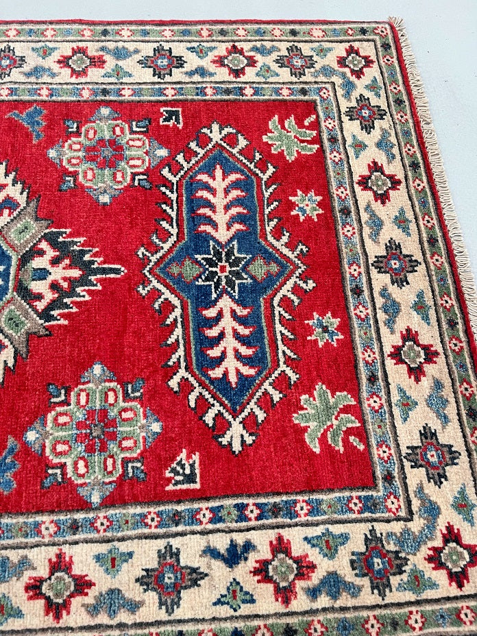 Decorative Coffee Table Size Hand Knotted Afghan Kazak Rug. Above All It Is Pure Hand Spun Wool Pile On Cotton Base. Beige, Red, Blue And Green Tones Dyed Using Traditional Methods (Vegetable Dyes). Last of True Woven Tribal Art.