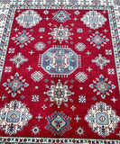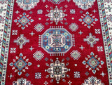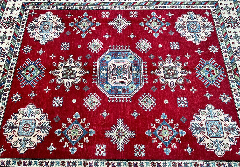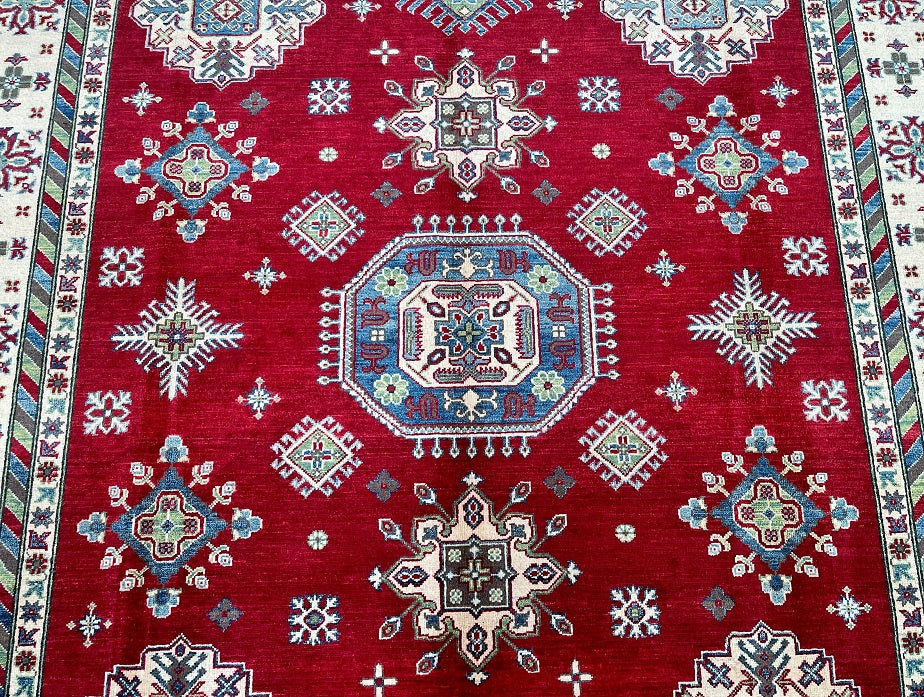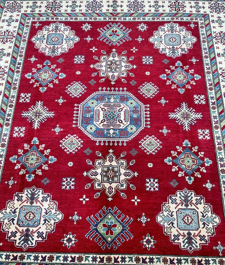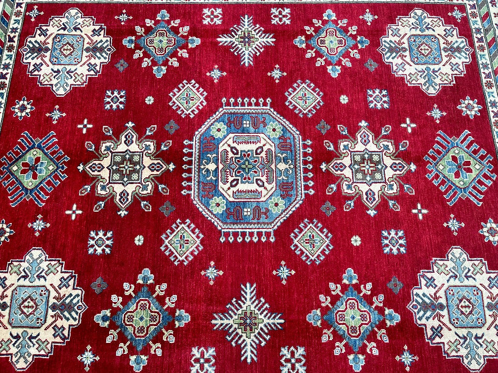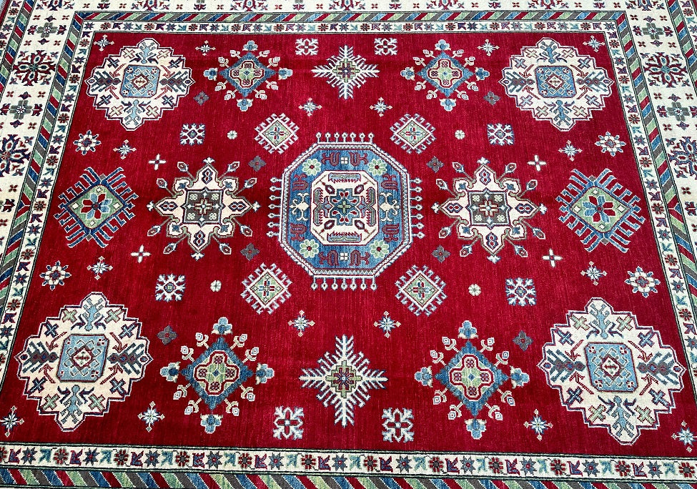Large Room Size Caucasian Design Hand Knotted Afghan Kazak rug. Above All It Is Pure Hand Spun Wool Pile On Cotton Base. Maroon Red, Beige, Blue And Green Tones Dyed Using Traditional Methods (Vegetable Dyes). Last Of True Woven Tribal Art.