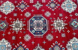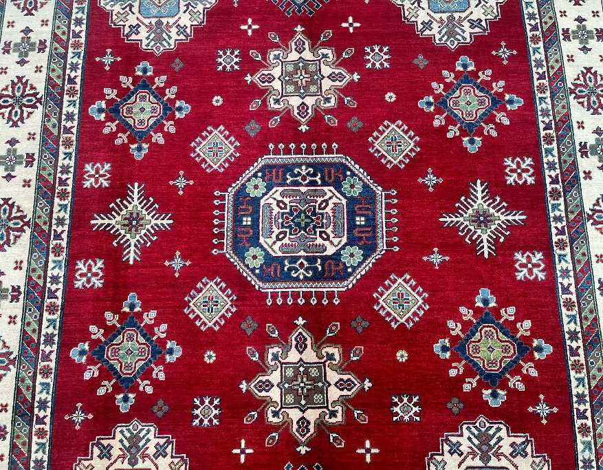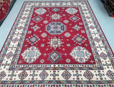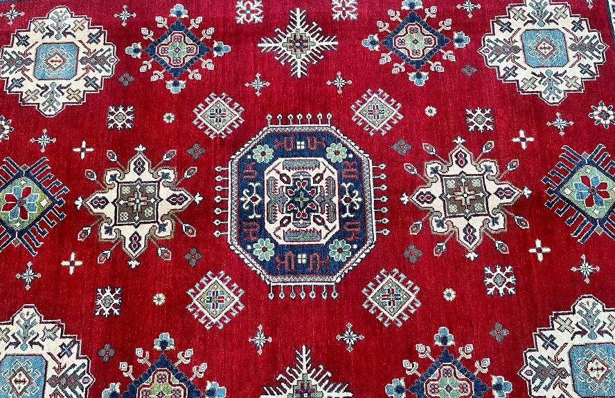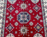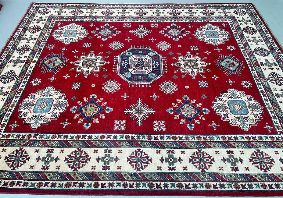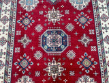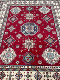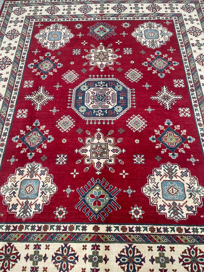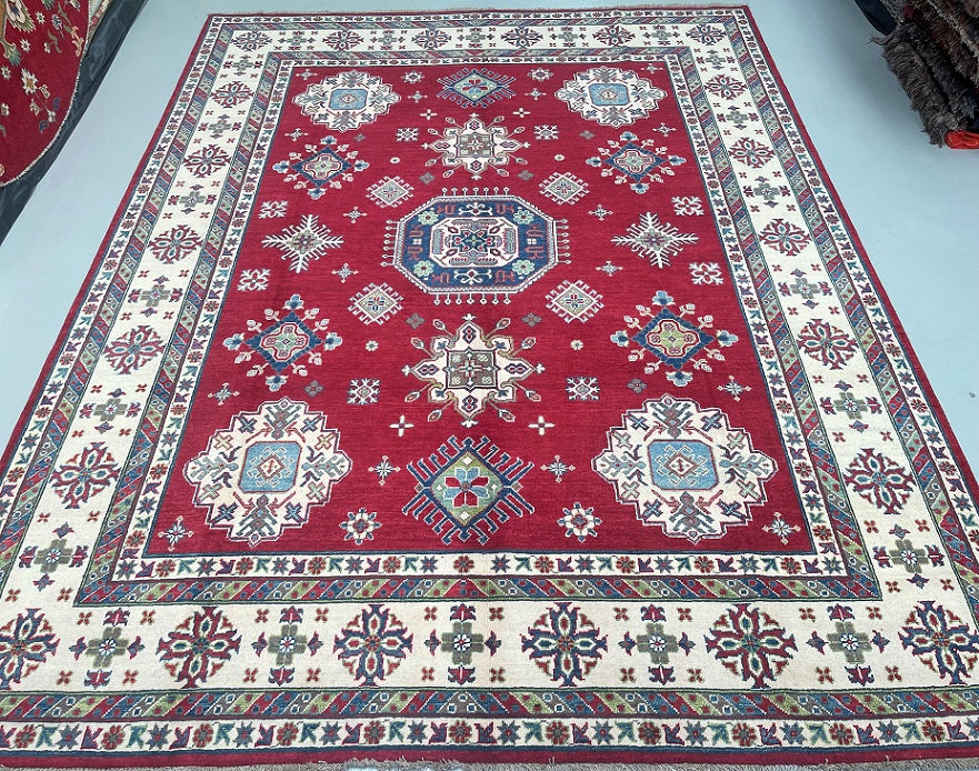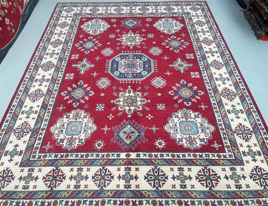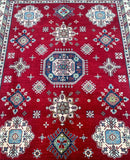 Large Room Size Authentic Hand Knotted Afghan Kazak rug. Above All It Is Pure Hand Spun Wool Pile On Cotton Base. Red, Beige, Blue And Green Tones Dyed Using Traditional Methods (Vegetable Dyes). Last Of True Woven Tribal Art.