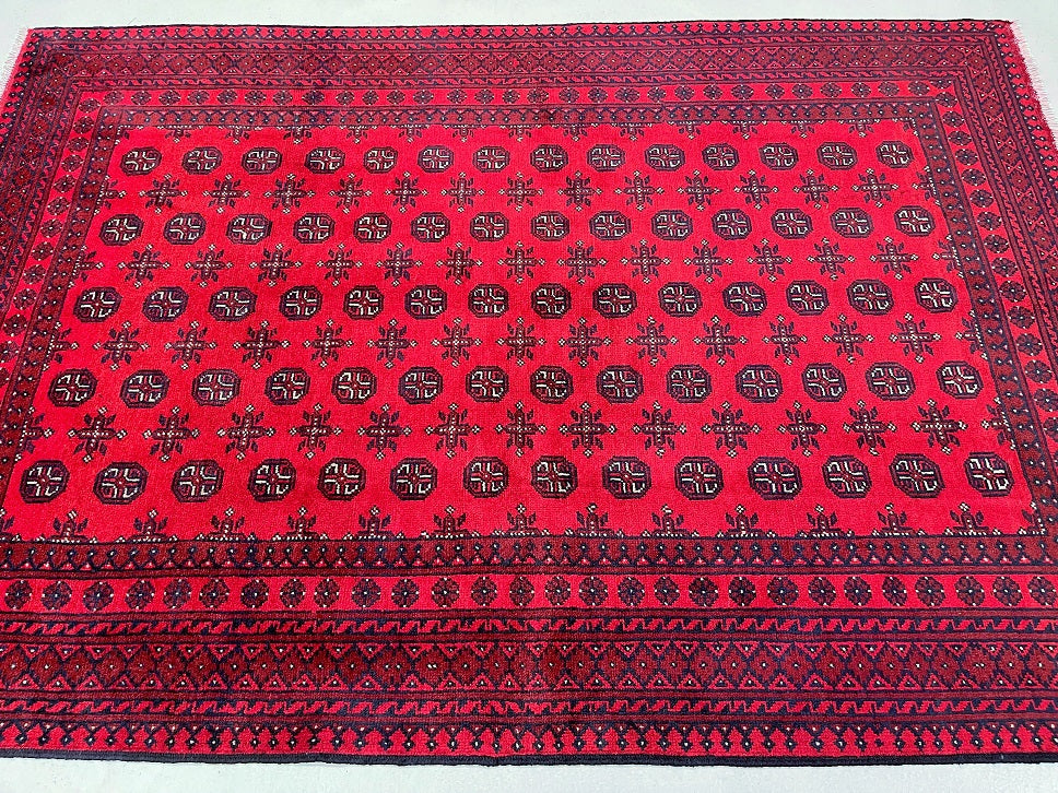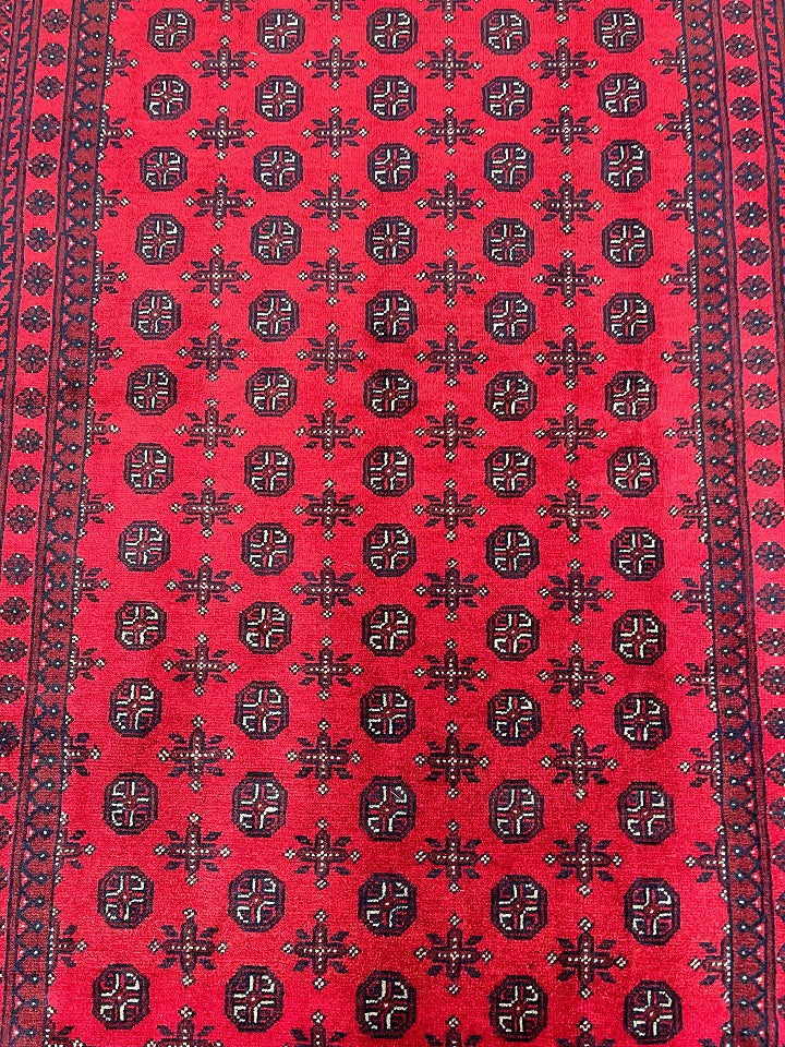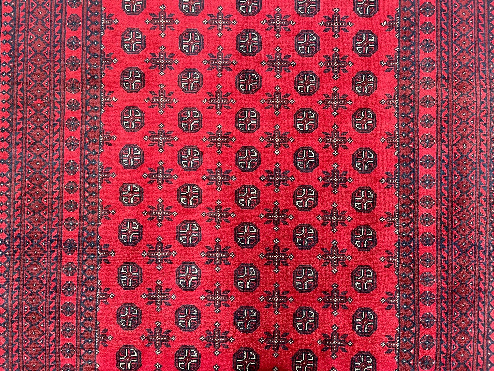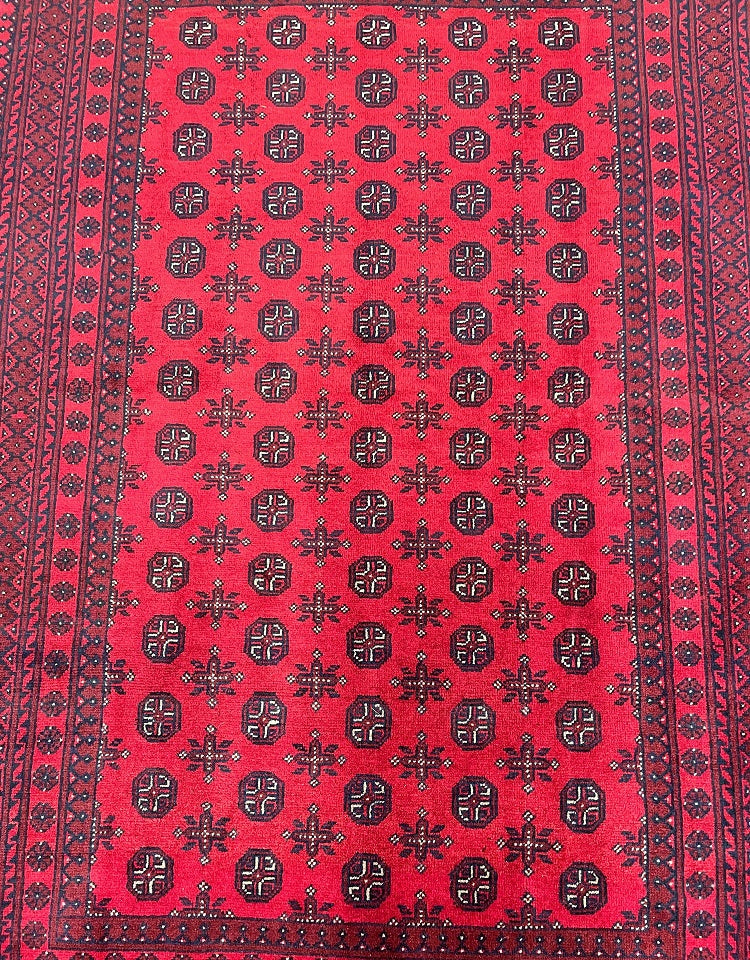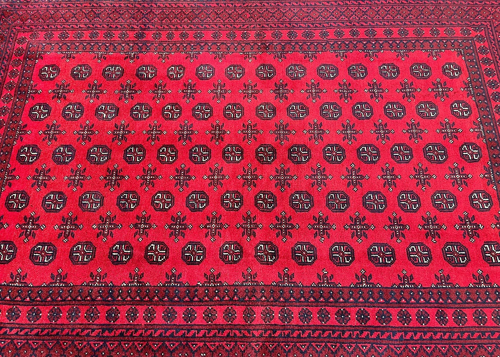 Durable Room Size Handmade Afghan Mazar Rug. Above All It Has A Pure Wool Pile On Cotton Base. It Also Has A Rich Red Tone Dyed Using Traditional Methods.