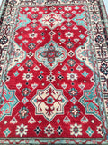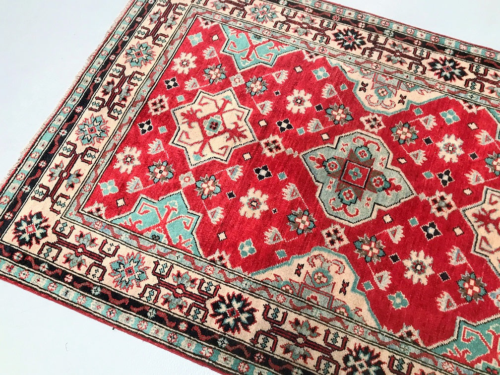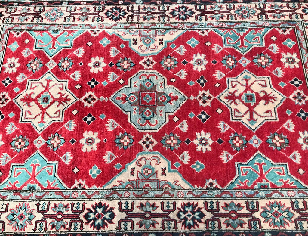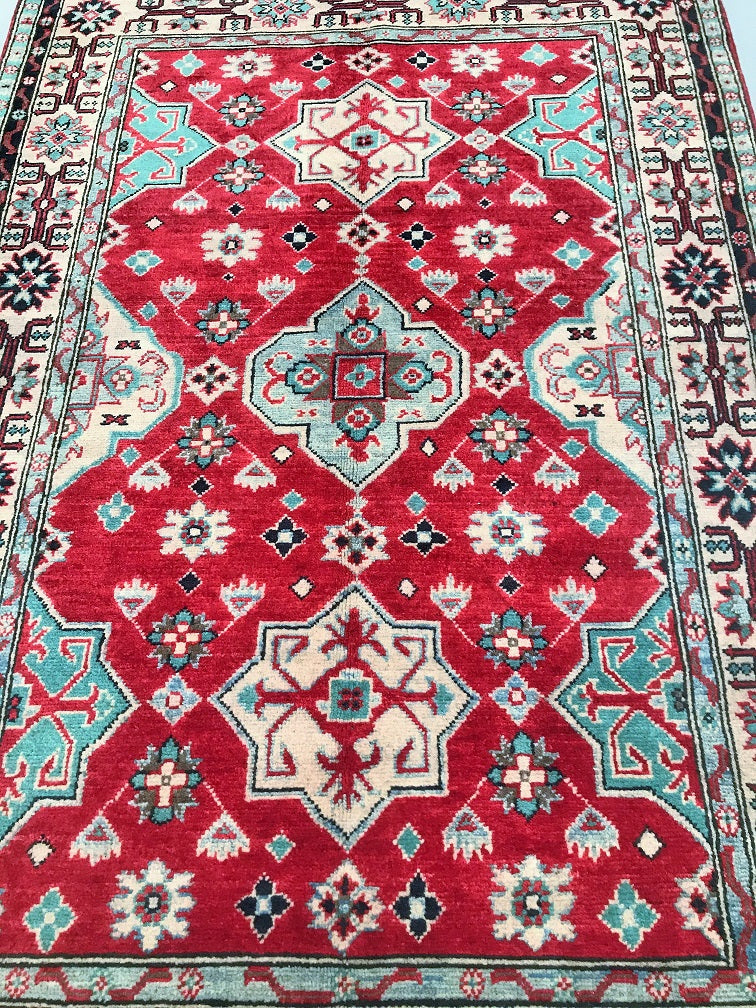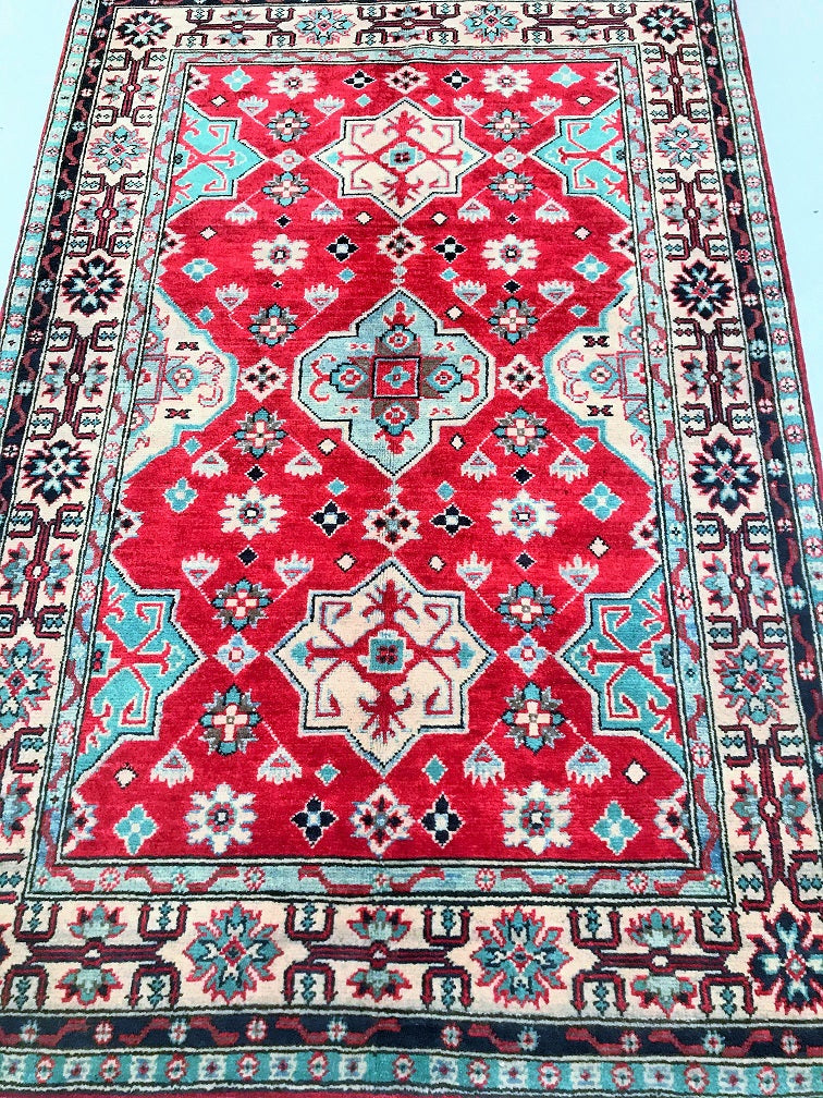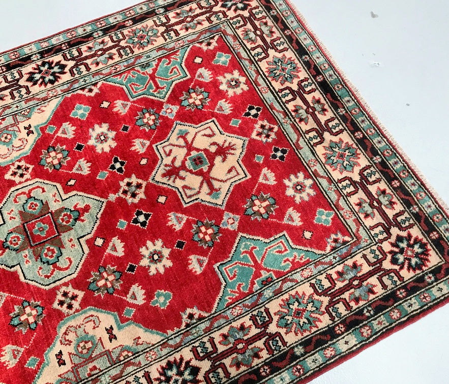 Coffee Table Size Hand Knotted Afghan Kazak Rug. Above All It Is Pure Hand Spun Wool Pile On Cotton Base. Gorgeous Red, Blue, Beige and Green Tone Dyed Using Traditional Methods (Vegetable Dyes). Last Of True Woven Tribal Art.