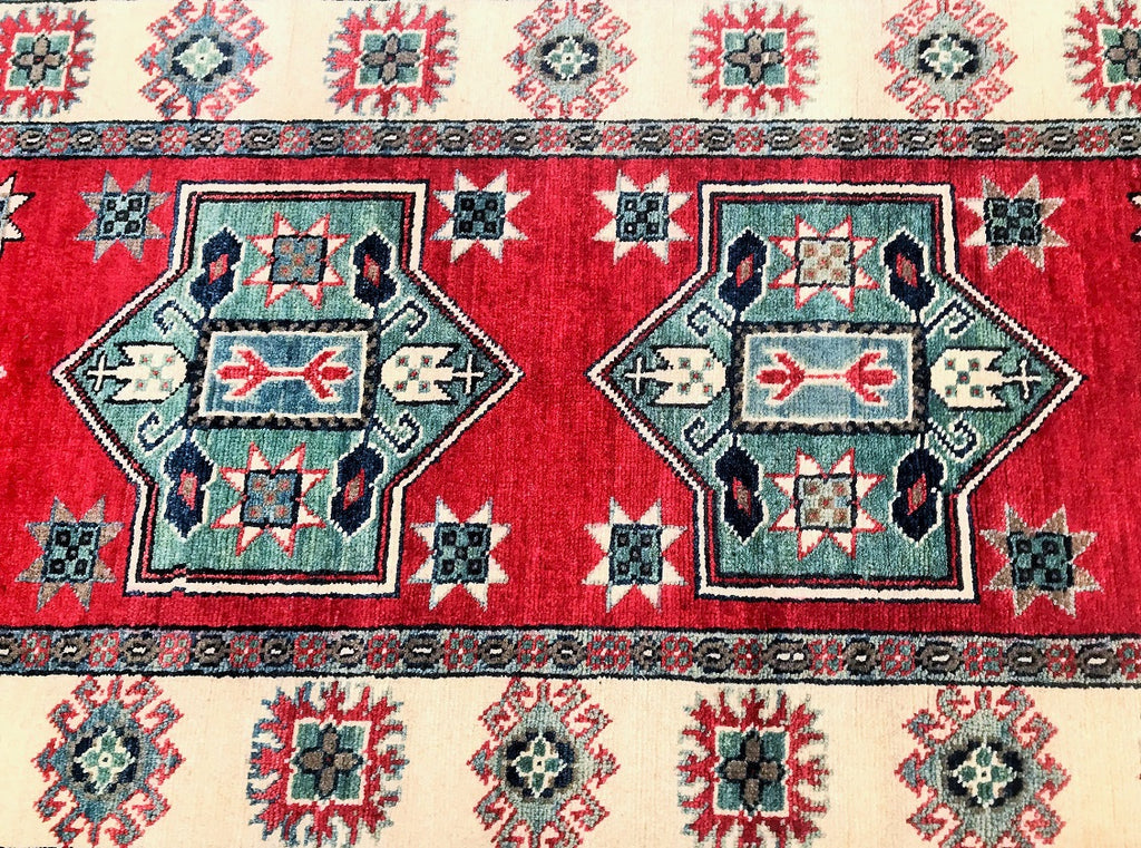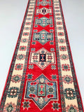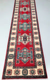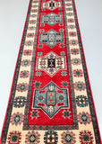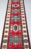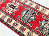 Decorative Handmade Afghan Kazak Hall Runner. Above All It Is Pure Hand Spun Wool Pile On Cotton Base. Gorgeous Red Tone Dyed Using Traditional Methods (Vegetable Dyes). Last Of True Woven Tribal Art.