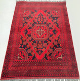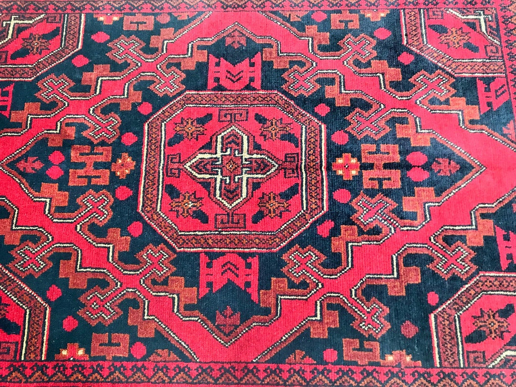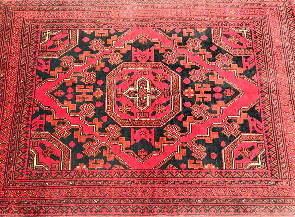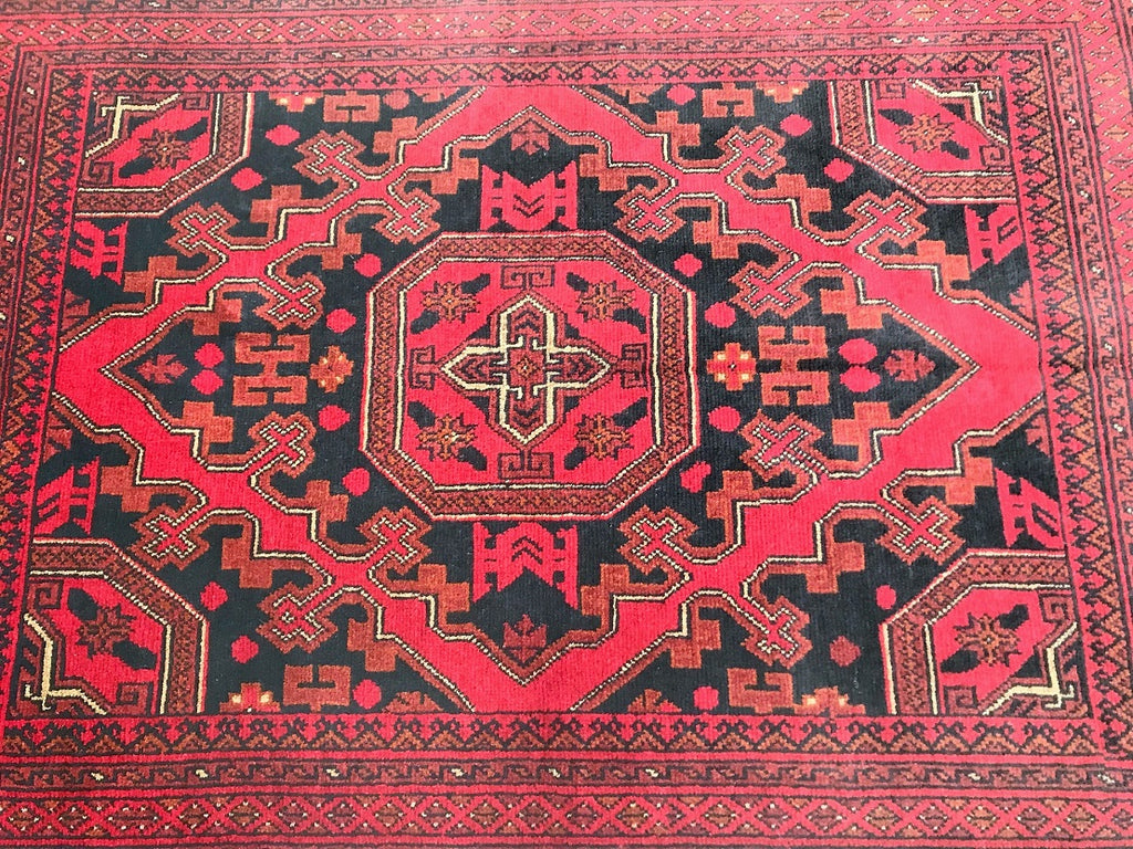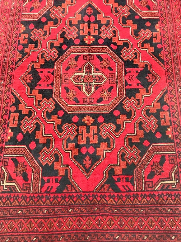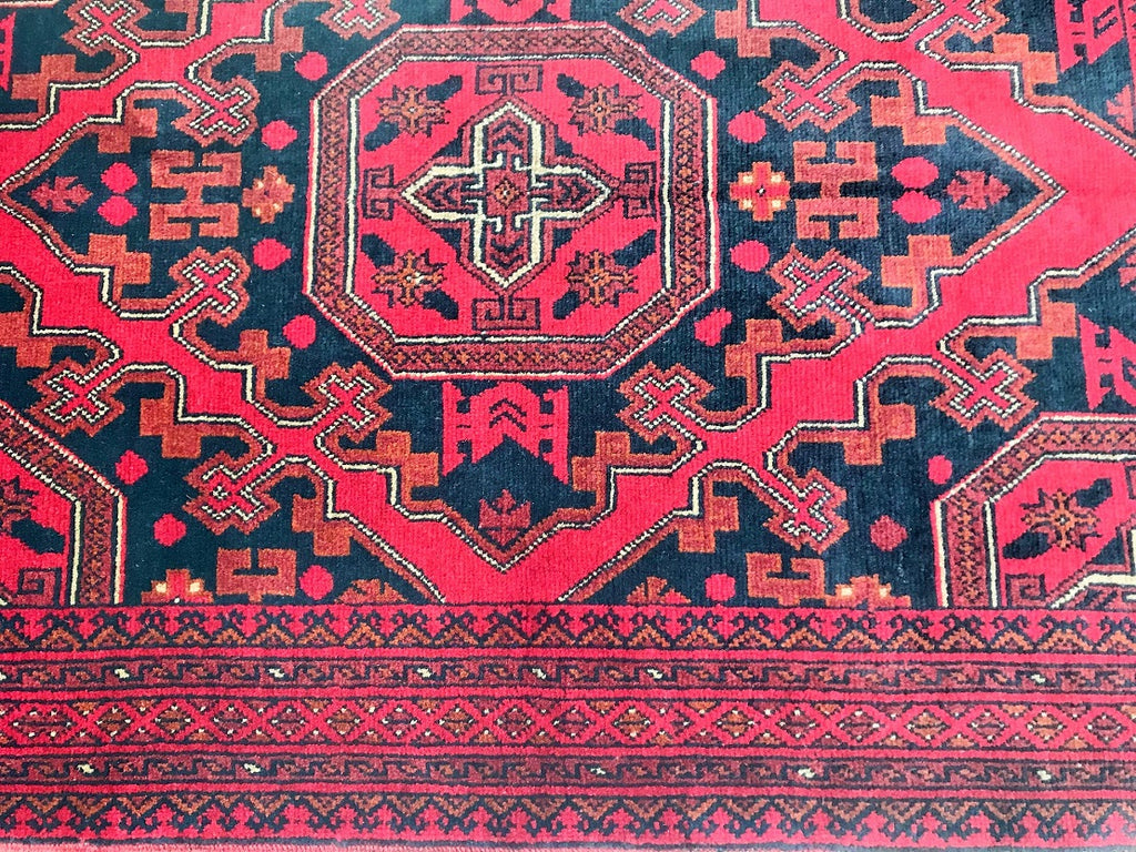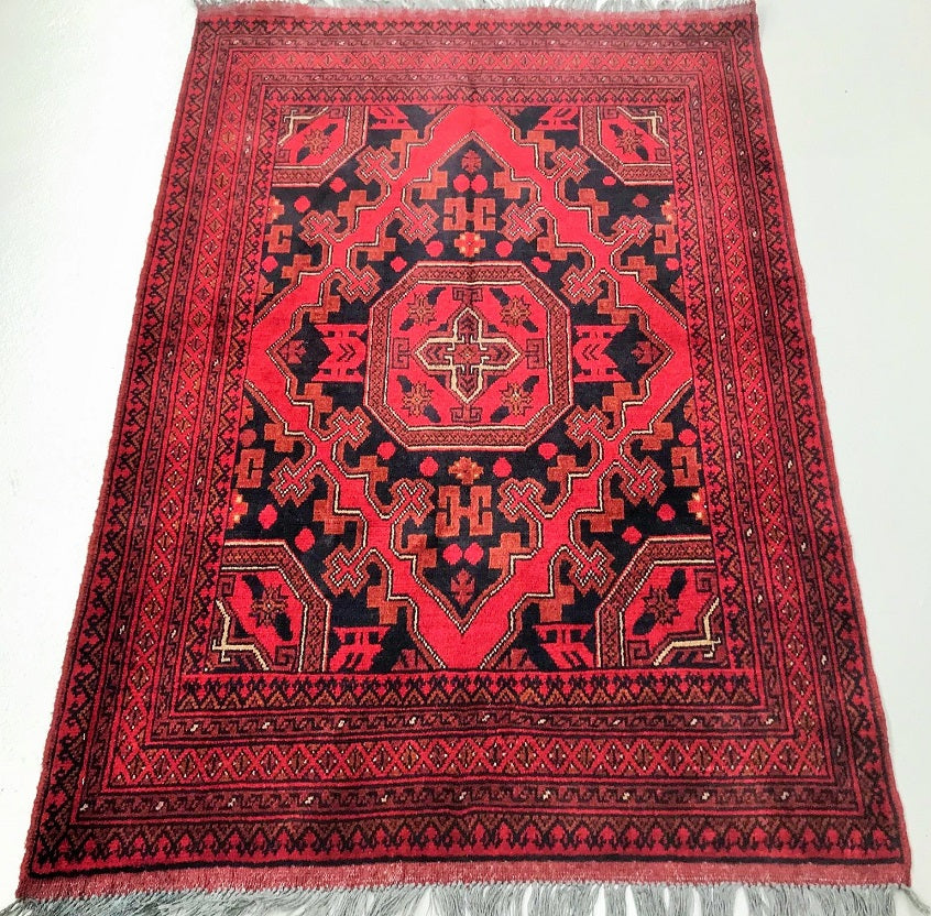 Coffee Table Size Hand Knotted Nomadic Afghan Khal Rug. Above All It Has A Pure Hand Spun Wool Pile On Wool Base. It Also Has A Burgundy Tone Dyed Using Traditional Methods.