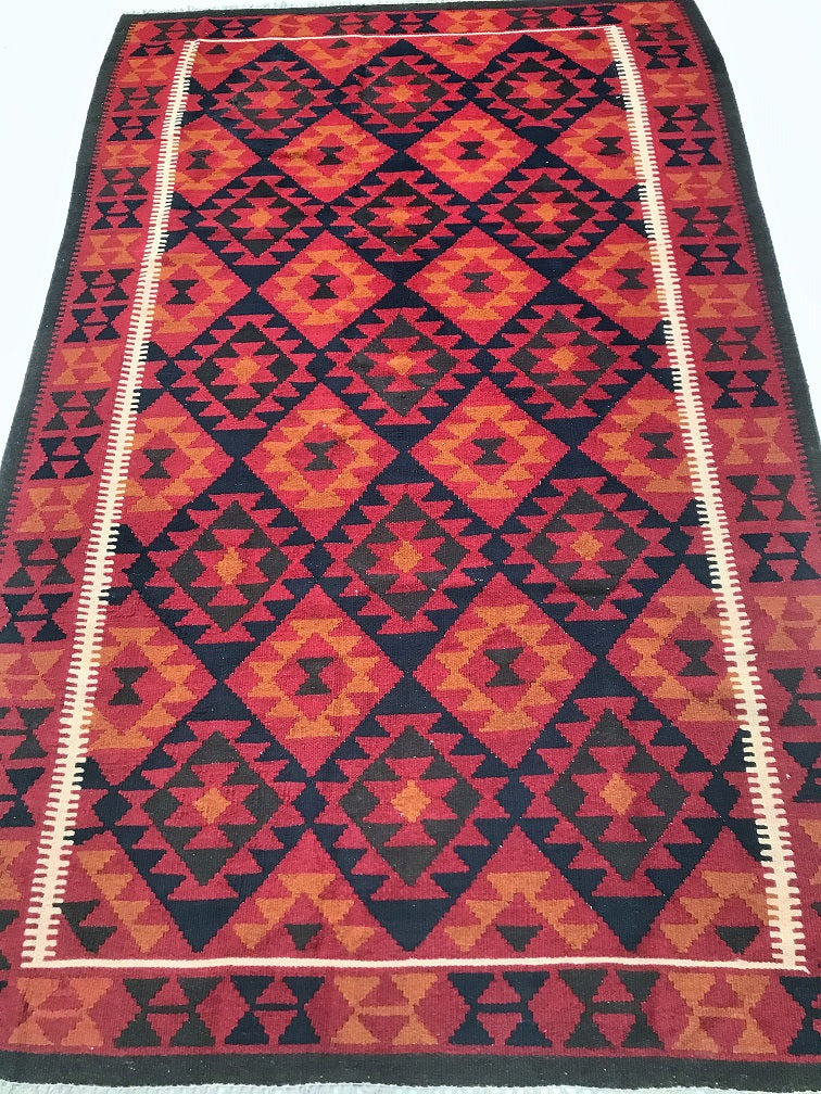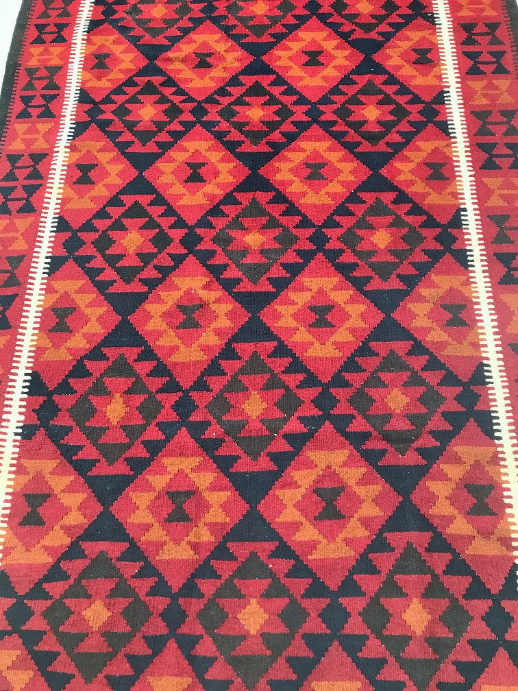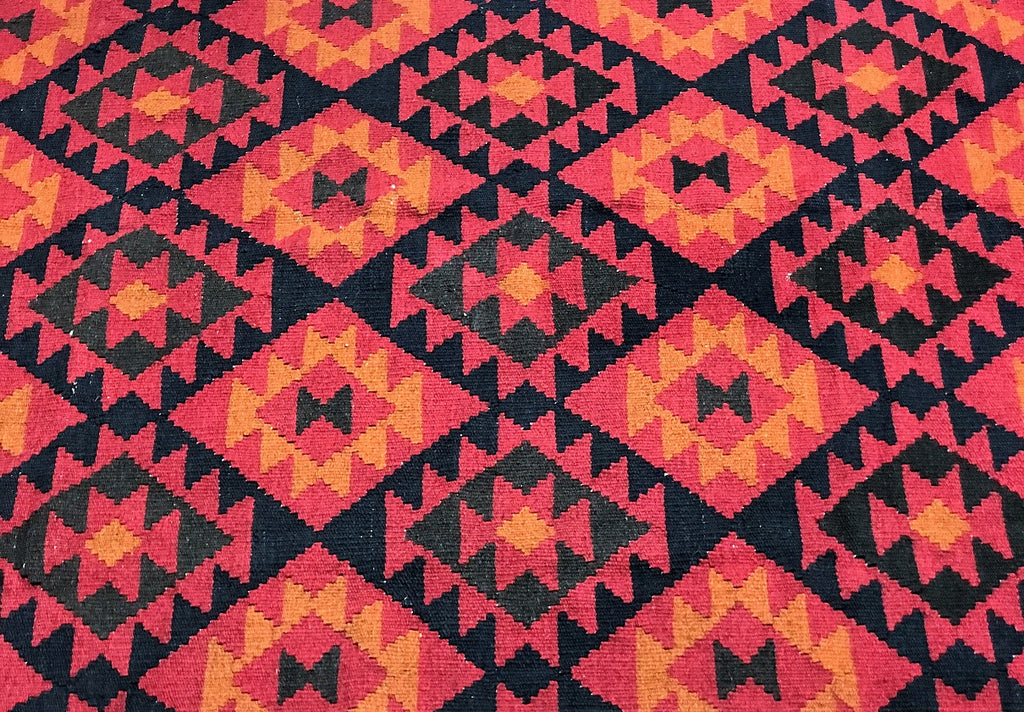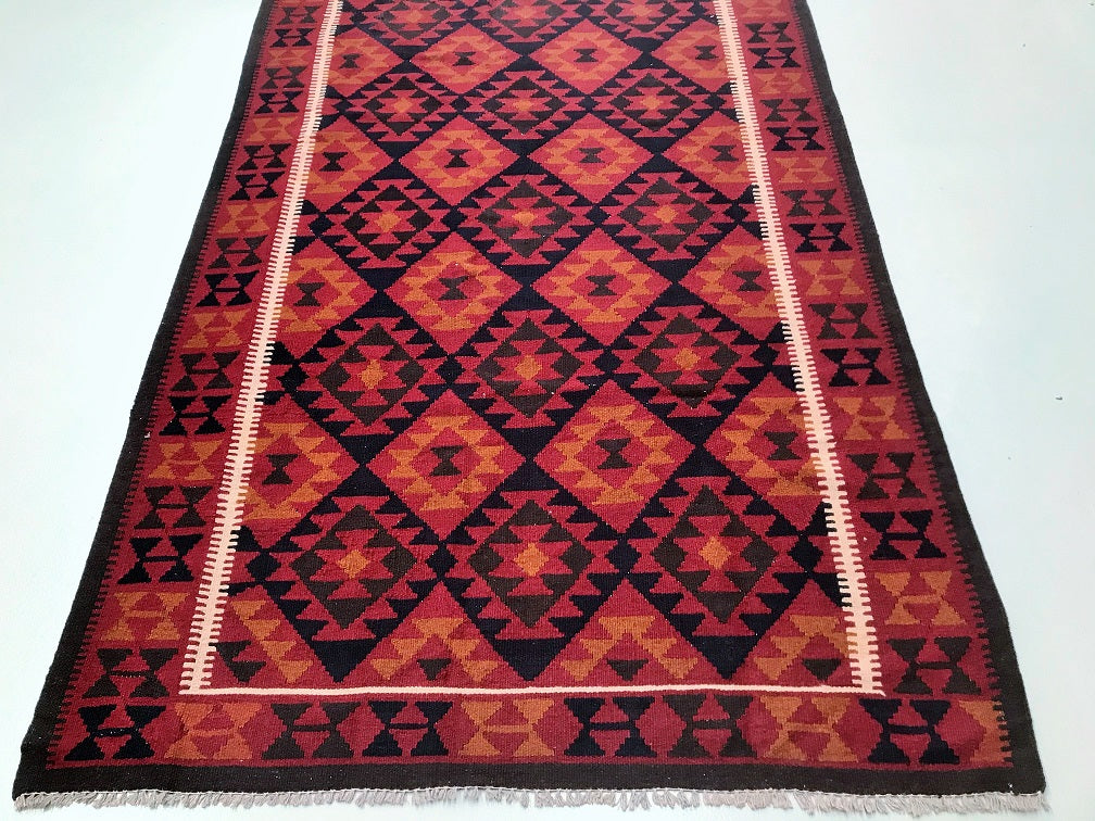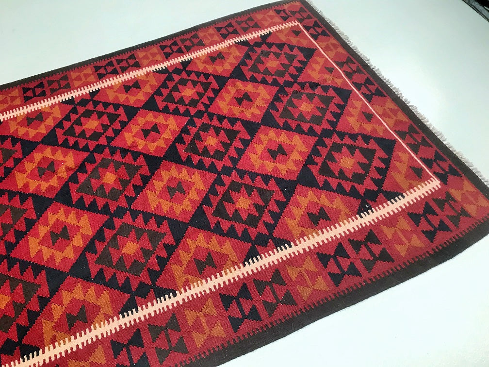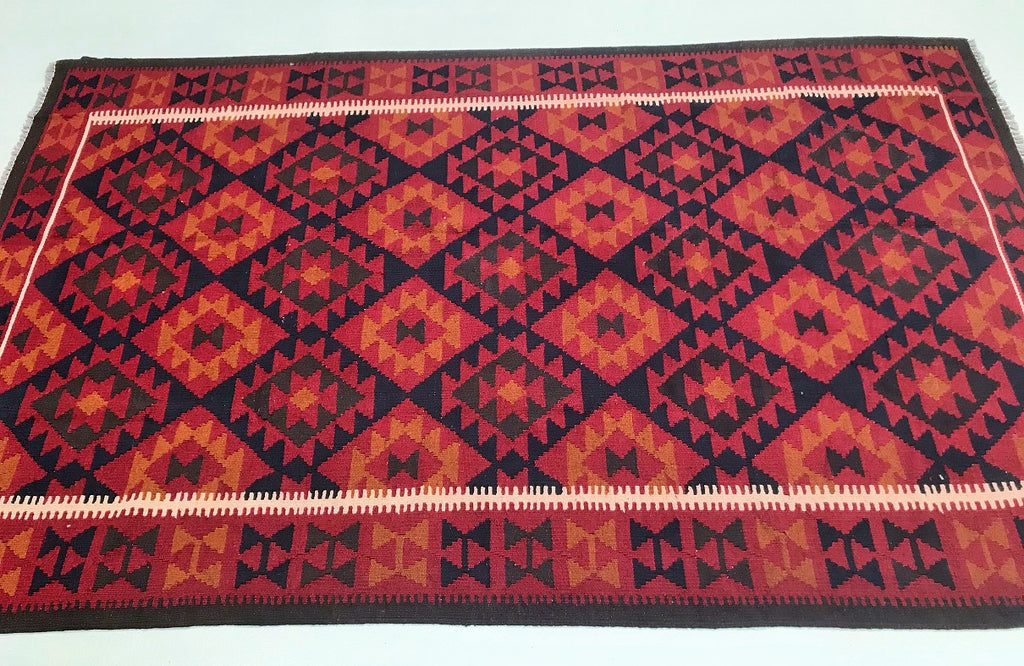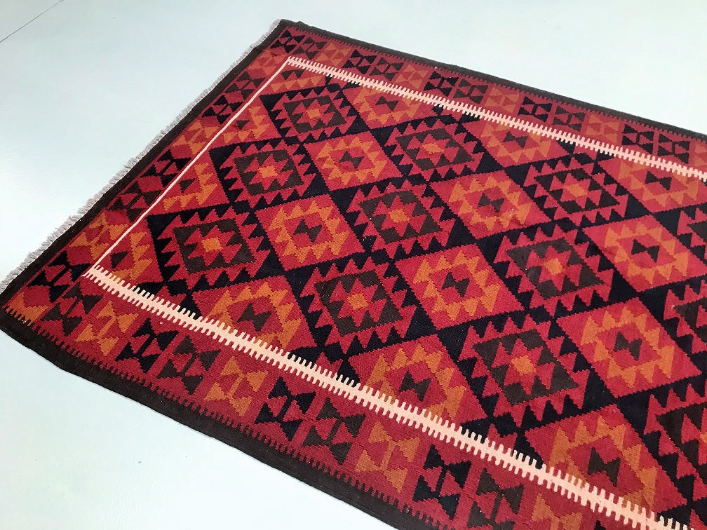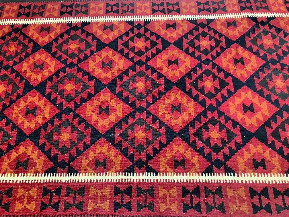 Room Size Tribal Design Hand Woven Afghan Ghalmori Kilim Rug. Above All It Has A Pure Hand Spun Wool Pile On Wool Base. Rustic Red, Burnt Orange and Black Tone Dyed Using Traditional Methods.
