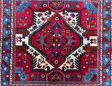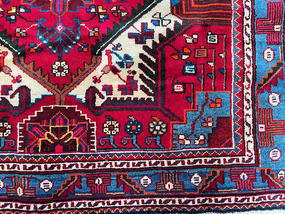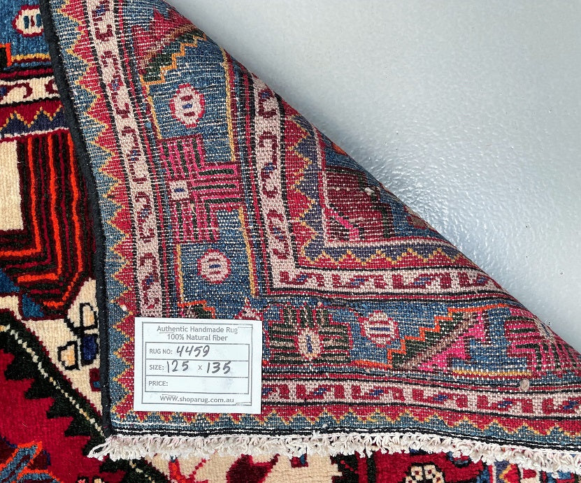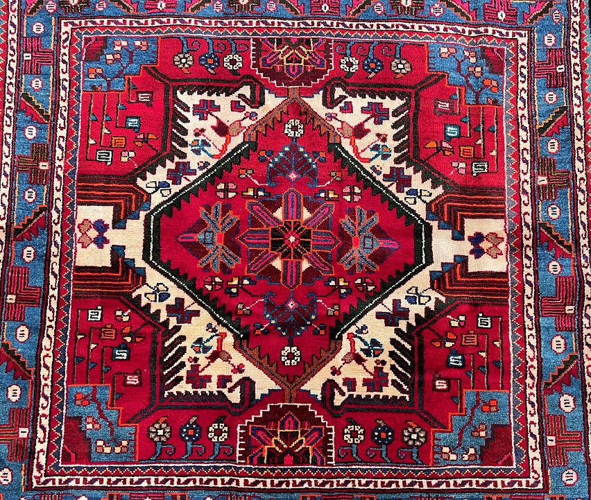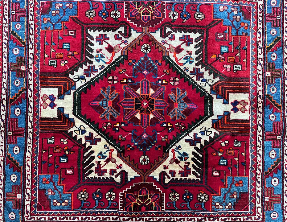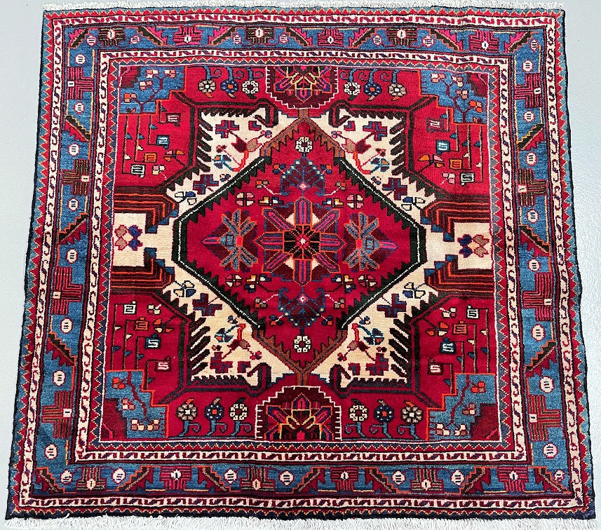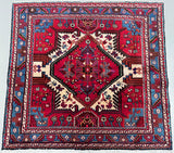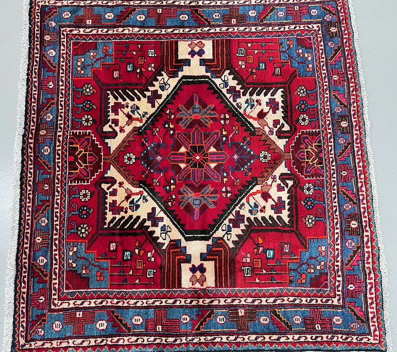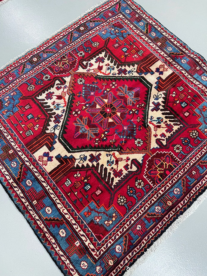 Rare Square Coffee Table Size Authentic Handmade Tribal Persian Hamedan Rug. Above All It Is Hard To Find Handmade Rugs In Square Sizes. It Also Has A Pure Hand Spun Wool Pile On Cotton Base. It Also Has A Beige, Blue, Red, Pink, Orange and Brown Tones Dyed Using Traditional Methods.