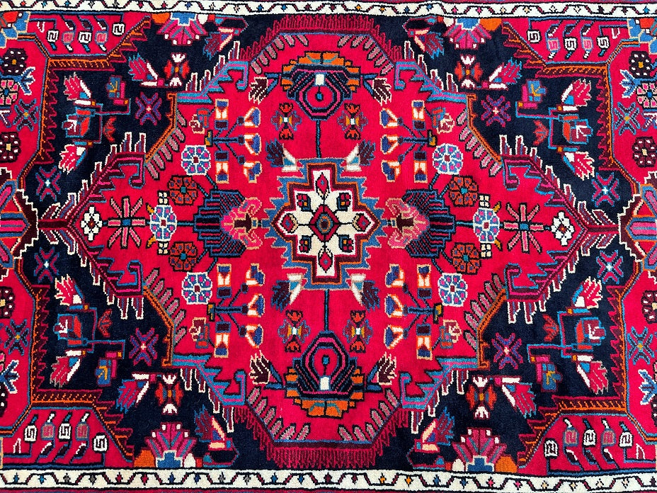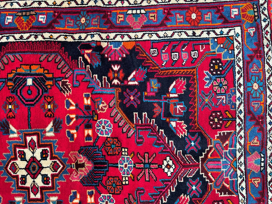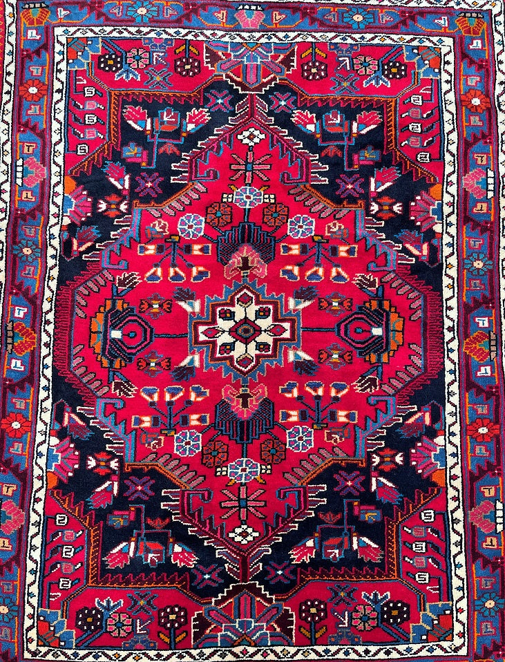 Authentic handmade Persian Village Malayer rug, a remarkable piece known for its durability. This rug is crafted to withstand heavy use, making it an excellent choice for high-traffic areas. It features a pure hand-spun wool pile skillfully woven onto a cotton base, ensuring both comfort and longevity. The color palette is a captivating combination of indigo blue/black, red, pink, orange, brown and light blue tones, achieved through traditional dyeing methods. The design showcases a central medallion with broken branches in a semi floral, semi geometric pattern, adding a touch of sophistication to the rug. The level of craftsmanship is evident, with a weaver dedicating around 4 months to complete this rural handcraft.