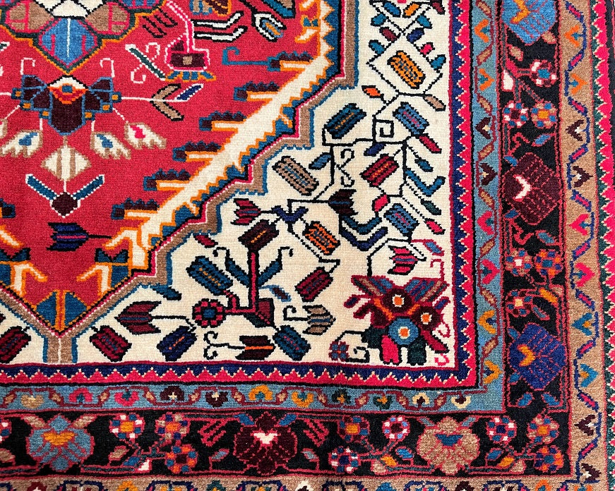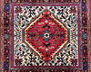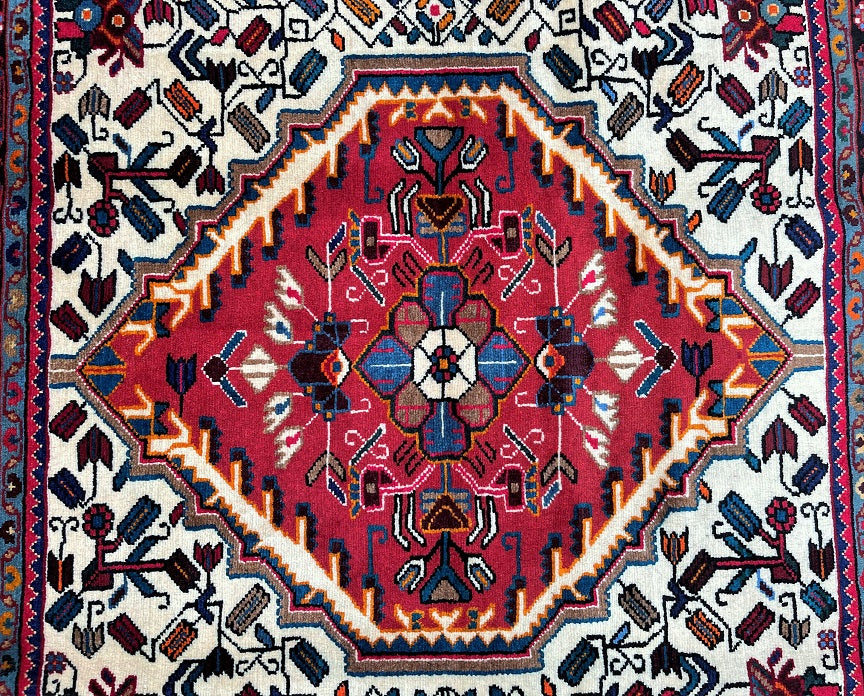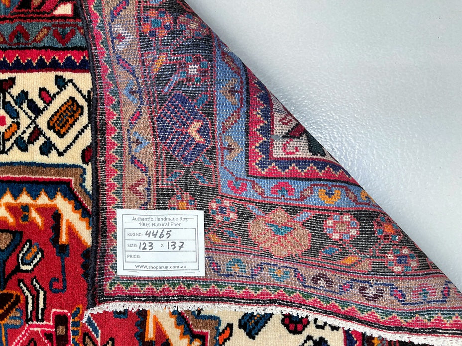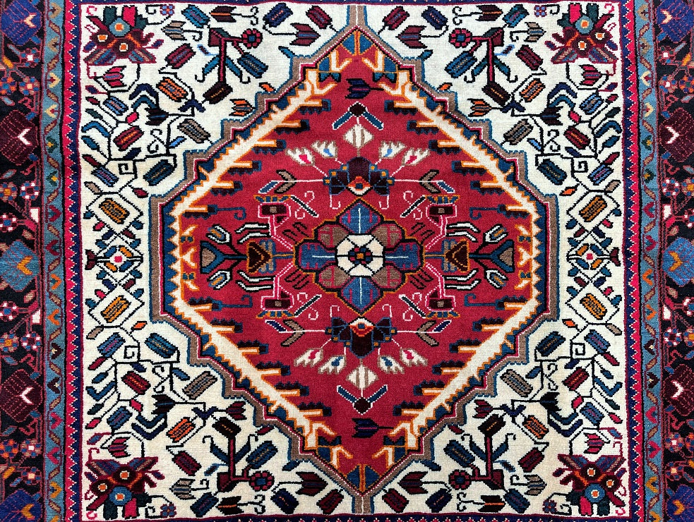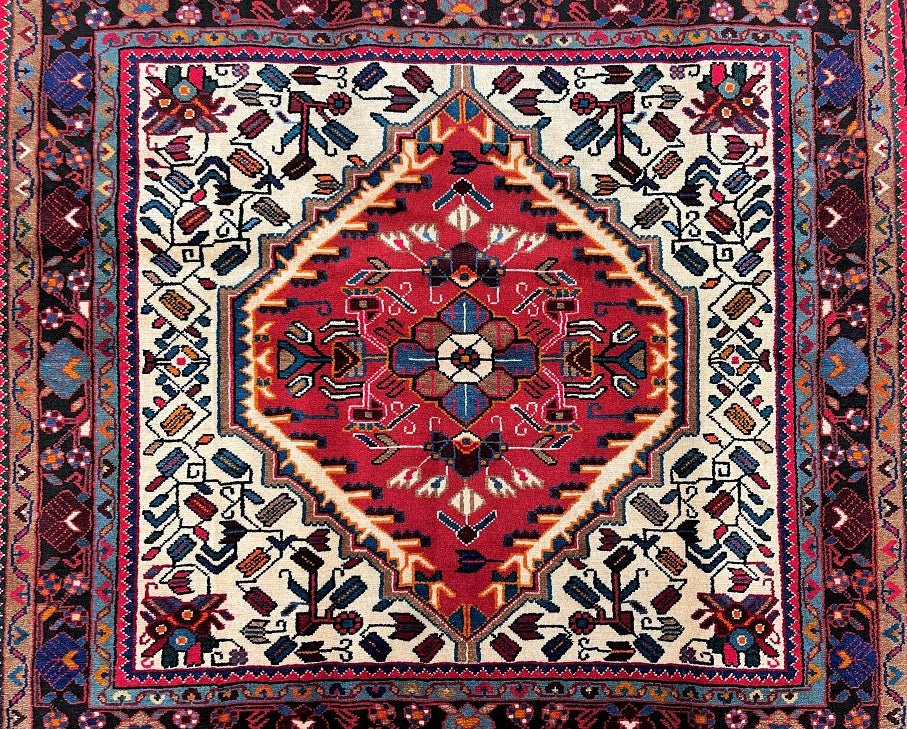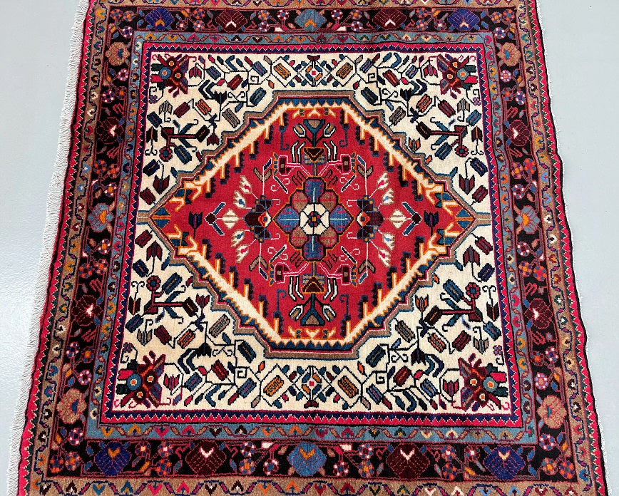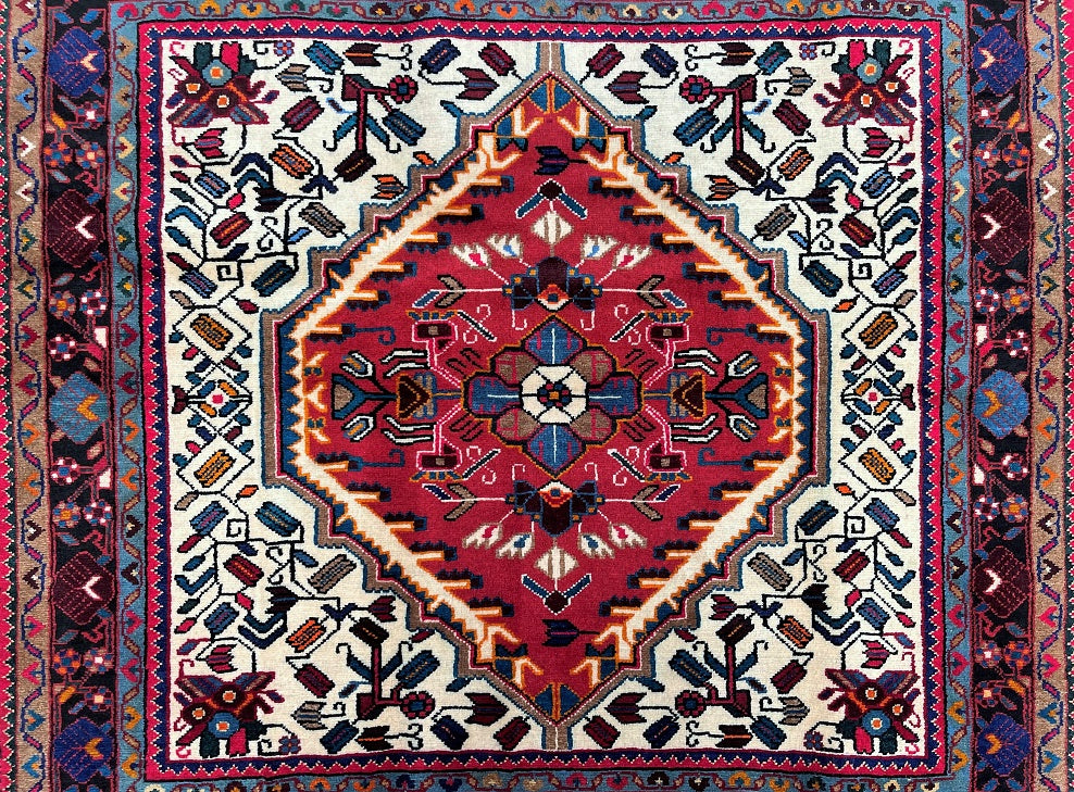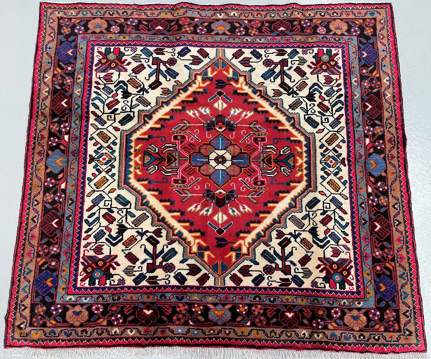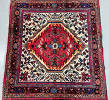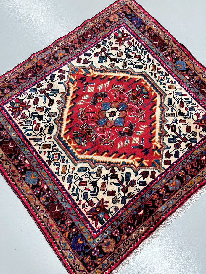 Rare Squarish Coffee Table Size Authentic Handmade Tribal Persian Nahavand Rug. Above All It Is Hard To Find Handmade Rugs In Square Sizes. It Also Has A Pure Hand Spun Wool Pile On Cotton Base. It Also Has A Beige, Blue, Red, Pink, Orange and Brown Tones Dyed Using Traditional Methods.