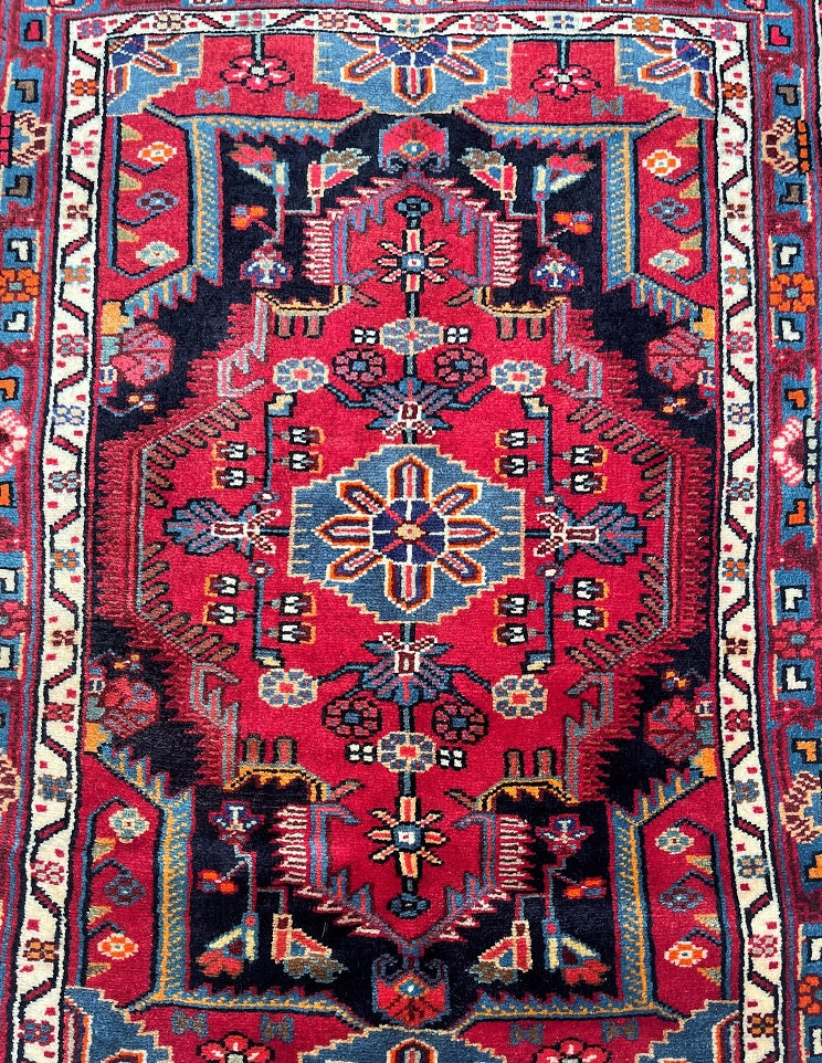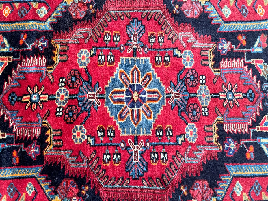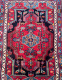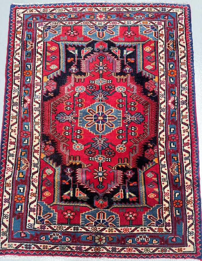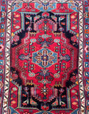 Collectible Coffee Table Size Genuine Handmade Persian Village Nahavand Rug. Above All It Has A Pure Hand Spun Wool Pile On Cotton Base. It Also Has A Red, Indigo Blue/Black, Beige, Green, Orange And Light Blue Tones Dyed Using Traditional Methods.