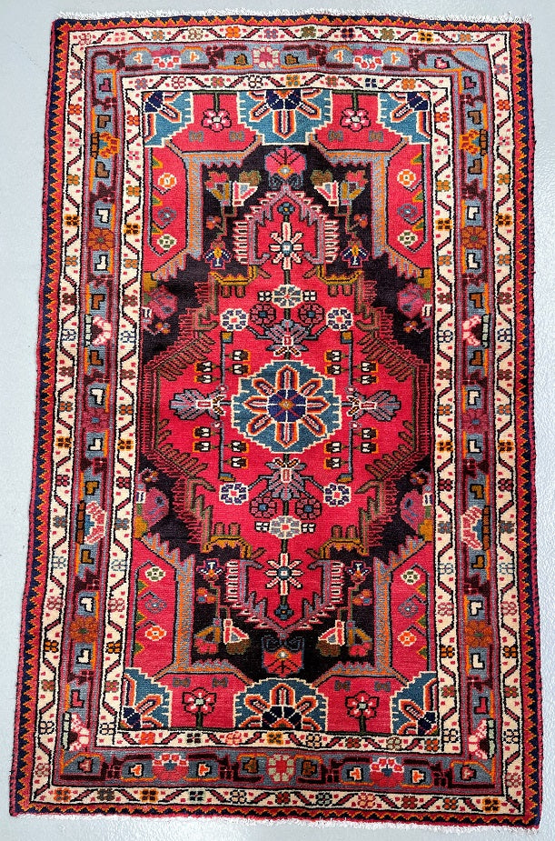 Collectible Coffee Table Size Genuine Handmade Persian Village Nahavand Rug. Above All It Has A Pure Hand Spun Wool Pile On Cotton Base. It Also Has An Indigo Blue/Black, Beige, Green, Orange, Light Blue And Red Tone Dyed Using Traditional Methods.