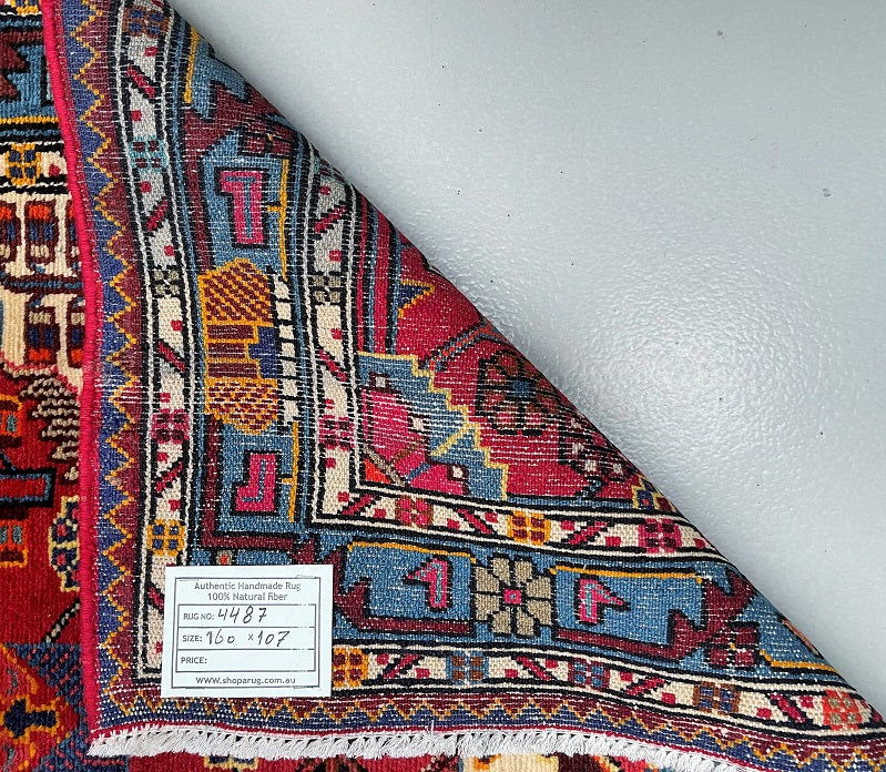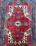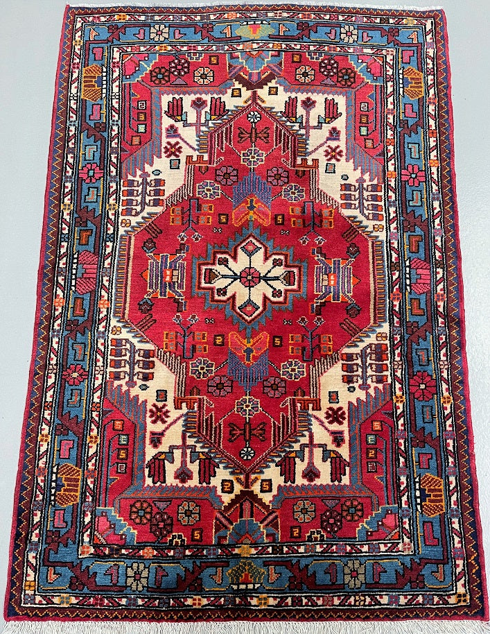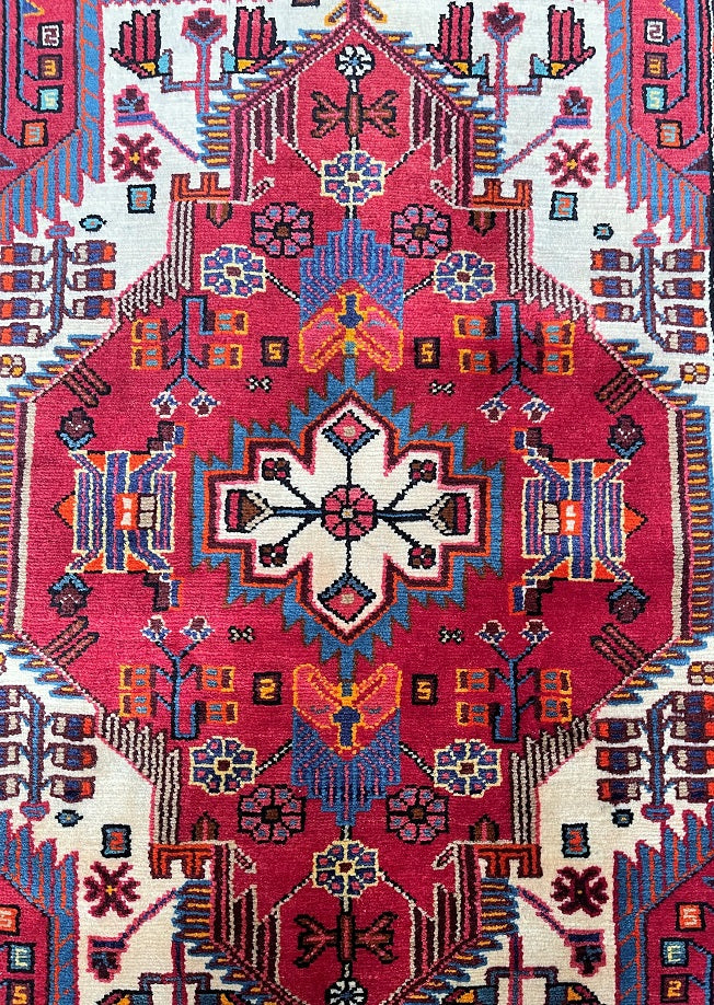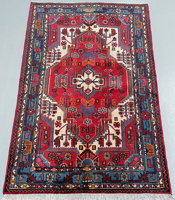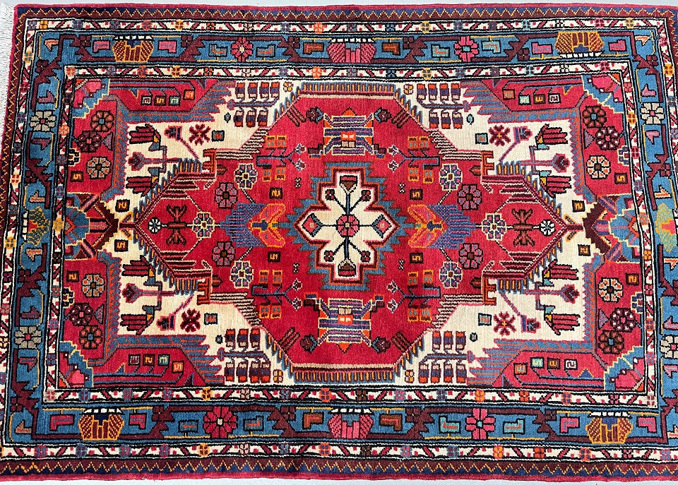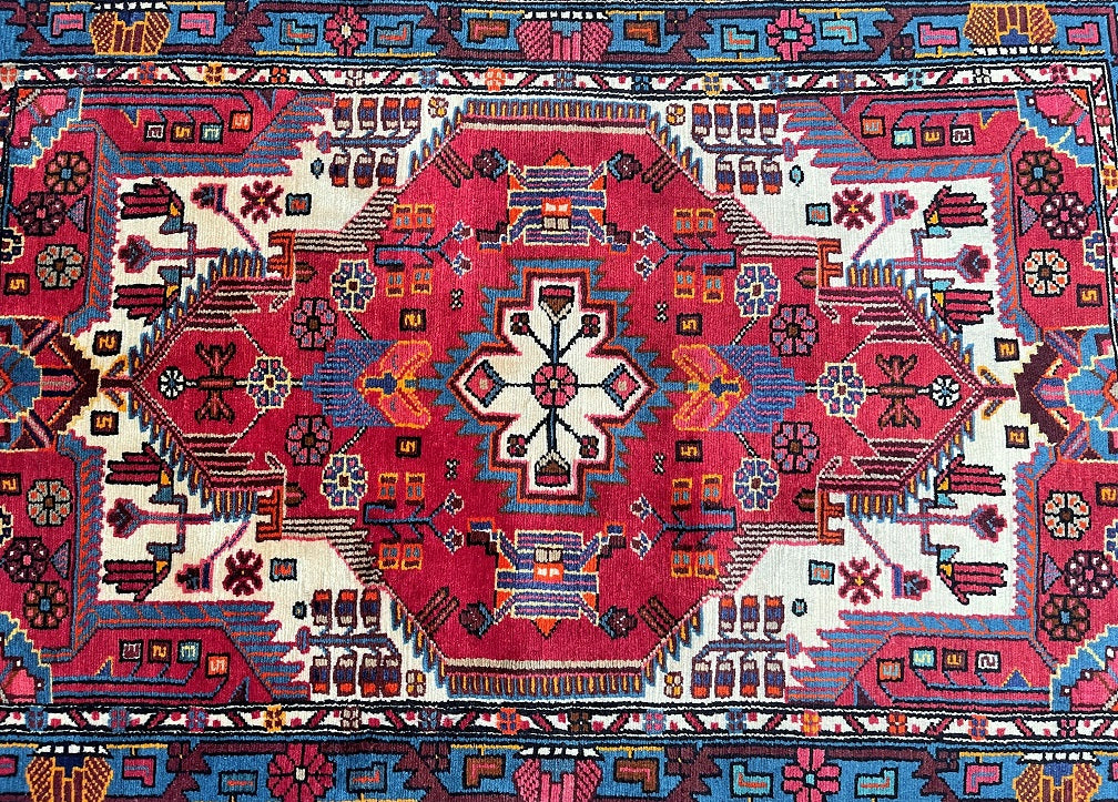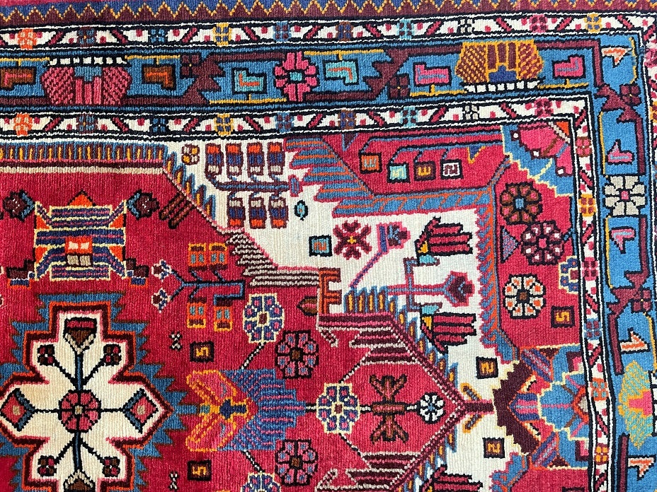 Rare Authentic Handmade Tribal Persian Nahavand Rug. Above All It Also Has A Pure Hand Spun Wool Pile On Cotton Base. It Also Has A Beige, Blue, Red, Brown, Pink, And Orange Tones Dyed Using Traditional Methods.