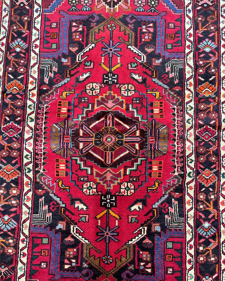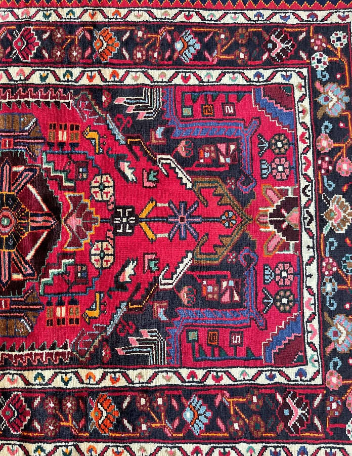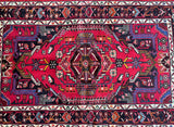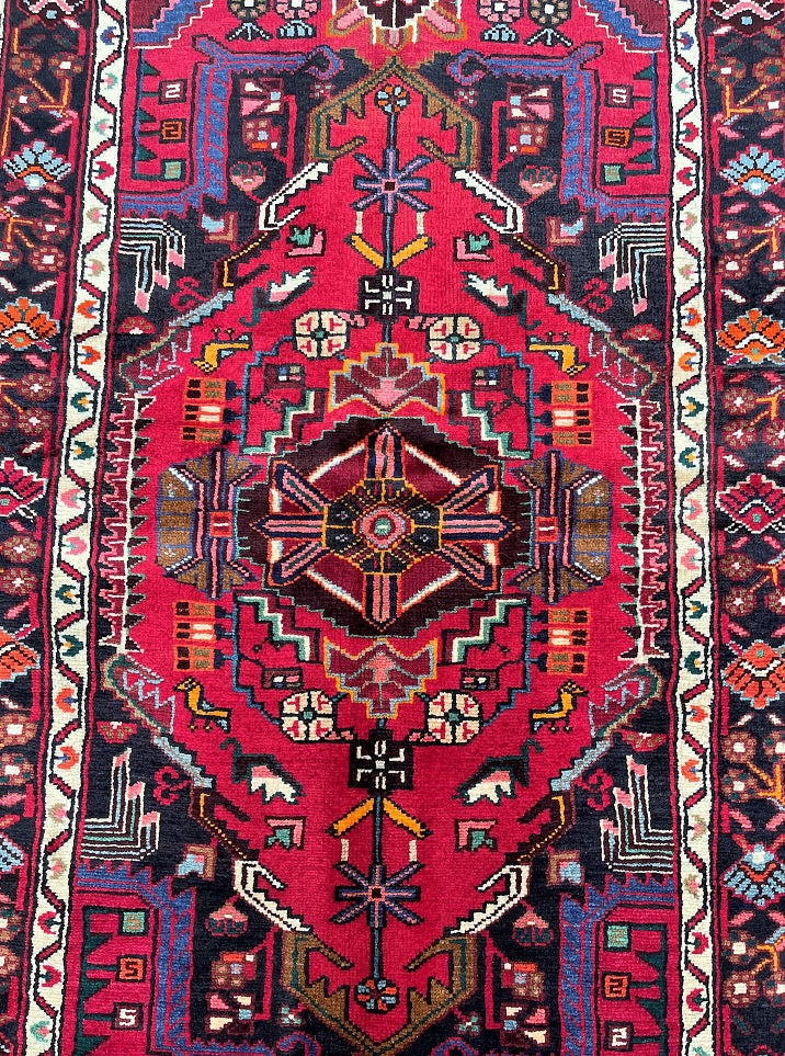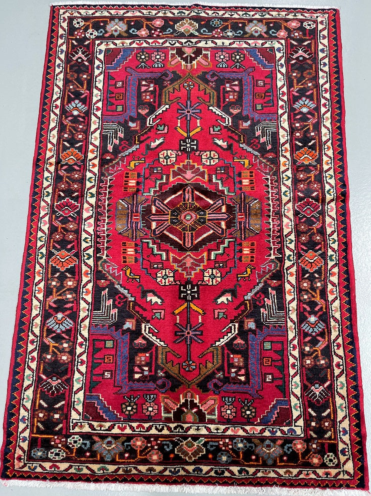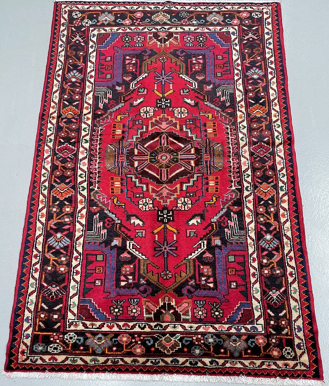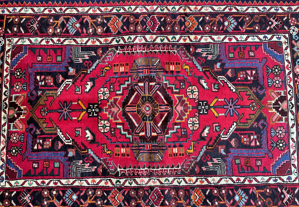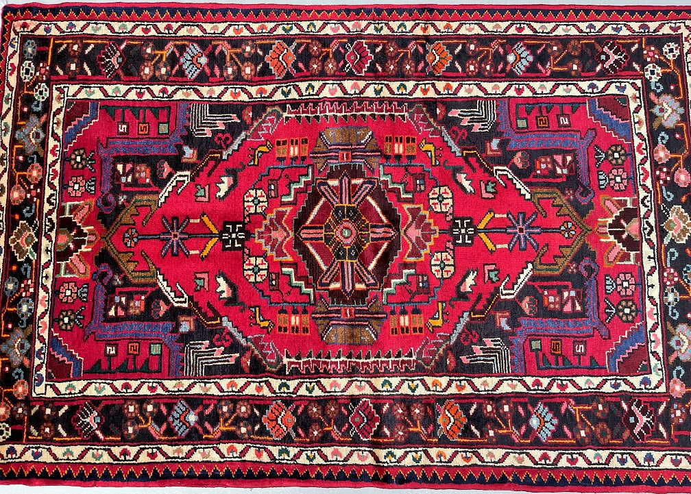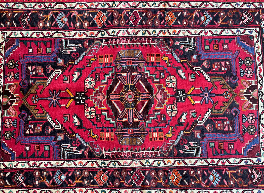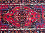 Collectible Coffee Table Size Genuine Handmade Persian Village Nahavand Rug. Above All It Is A Very Hard Wearing Rug. Pure Hand Spun Wool Pile On Cotton Base. It Also Has a Deep Indigo Blue/Black, Beige, Green, Orange And Red Tone Dyed Using Traditional Methods.