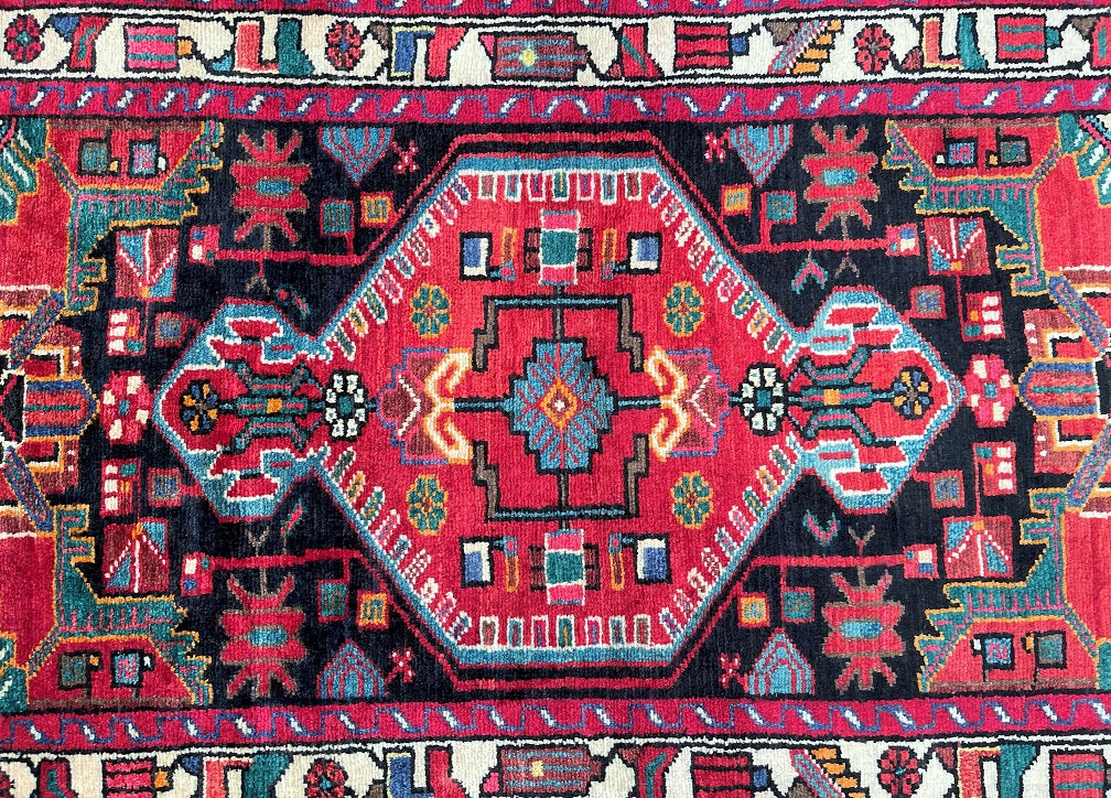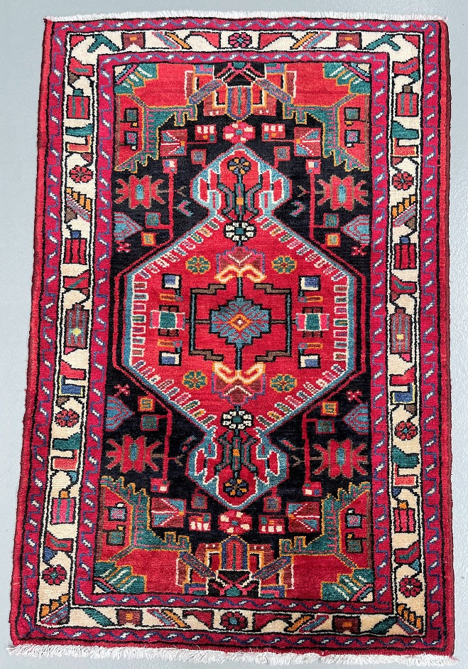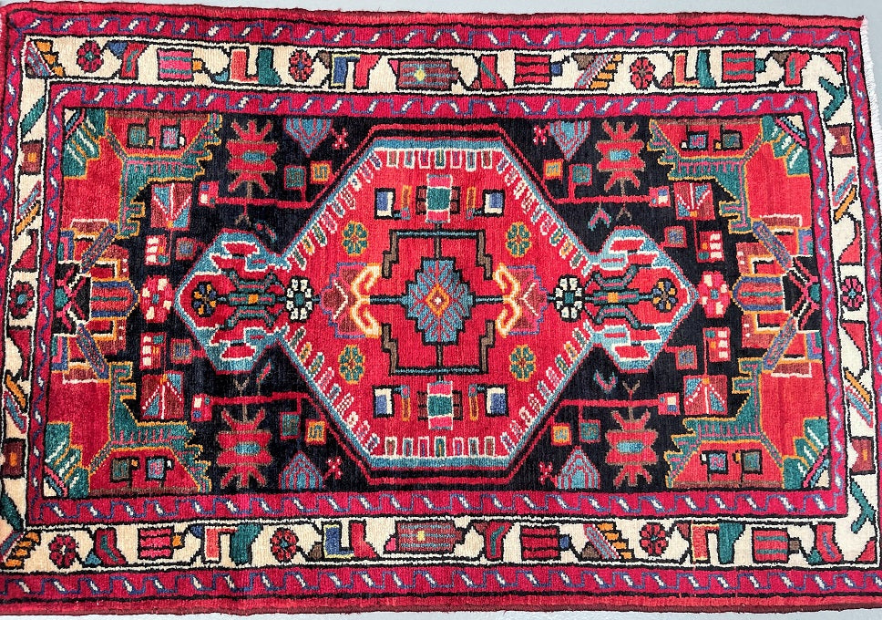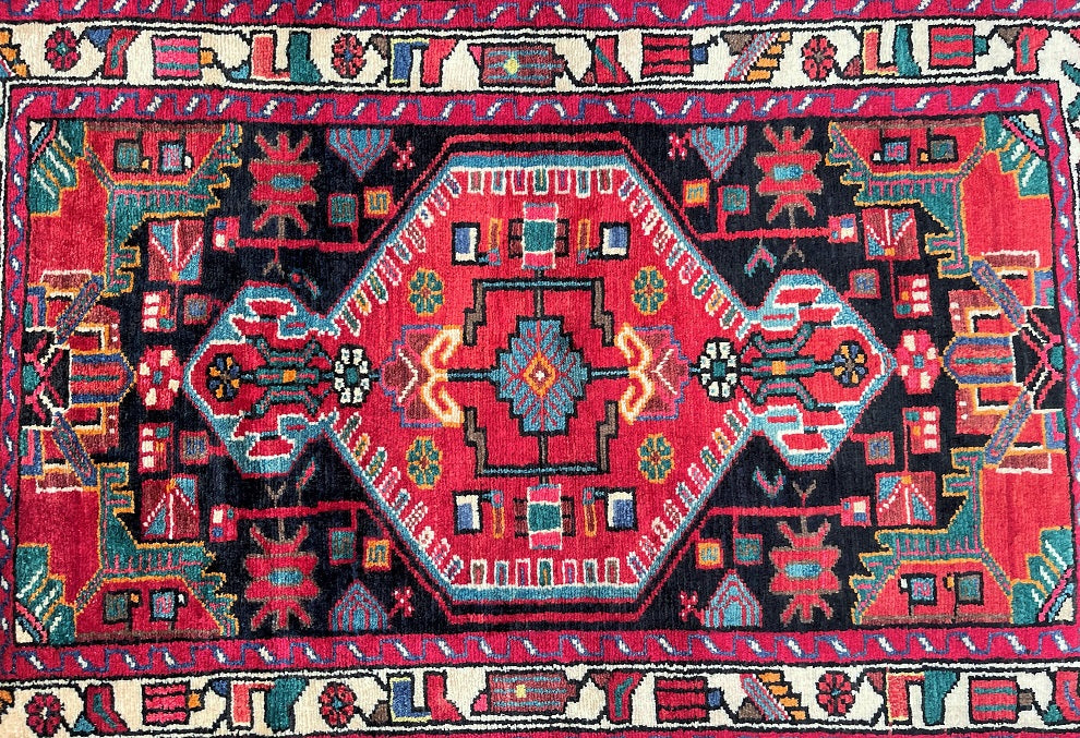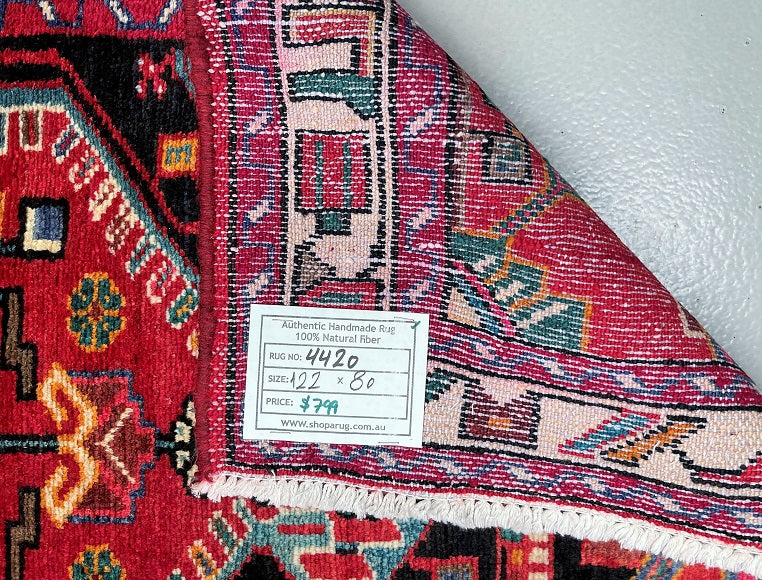 Coffee Table Size Genuine Handmade Persian Tuserkan Rug. Above All It Has A Pure Hand Spun Wool Pile On Cotton Base. It Also Has A Red, Blue, Pink, Beige, Green, Brown And Orange Tone Dyed Using Traditional Methods.