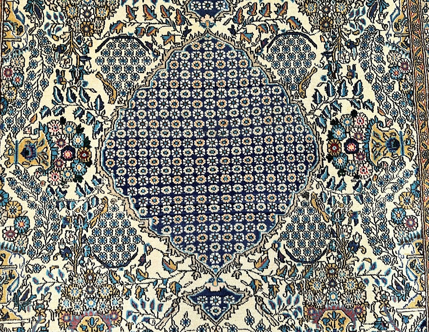 Rare Coffee Table Size Vase Design Handmade Vintage Persian Qum Rug. Above All It Has A Pure Lamb’s Wool Pile on Cotton Base. Beige, Gold, Brown And Blue Tones Dyed Using Traditional Methods.