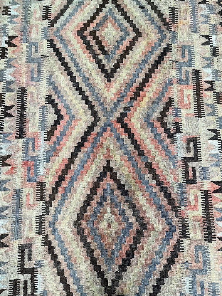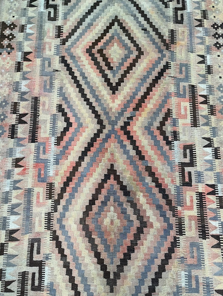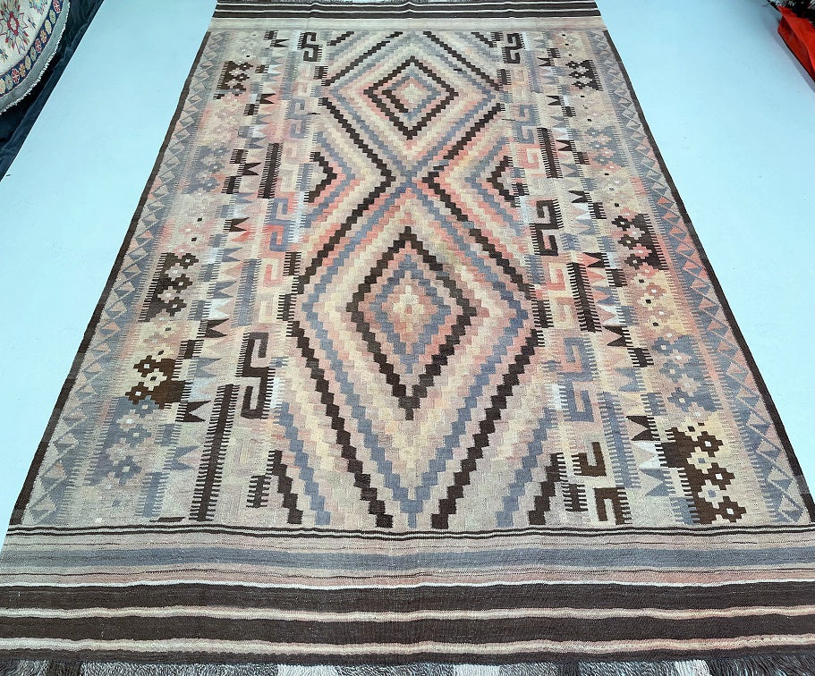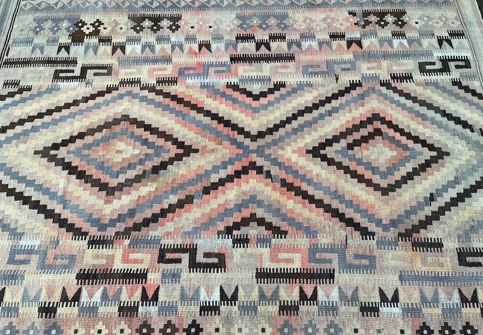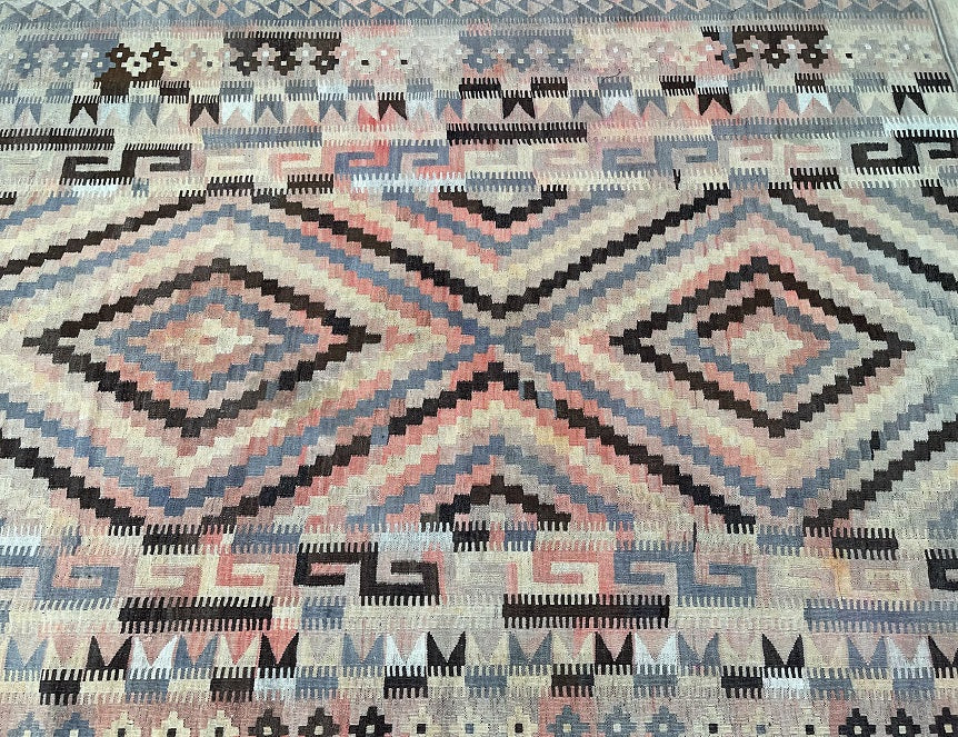 Full Room Size Authentic Hand Woven Vintage Afghan Meymaneh Kilim Rug Circa 1980’s. Above All It Has A Pure Wool Pile On Wool Base. Faded Charcoal, Antique Pink, Beige And Brown Tone Dyed Using Traditional Methods.