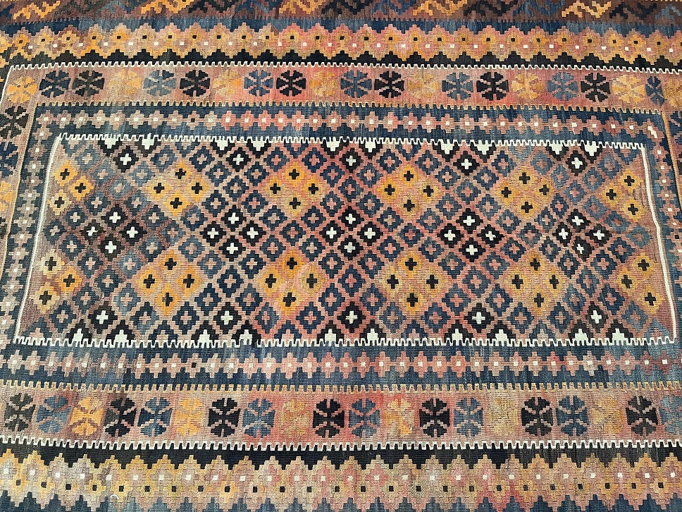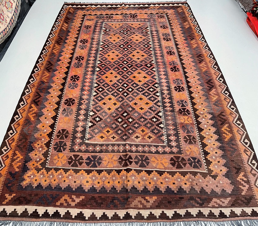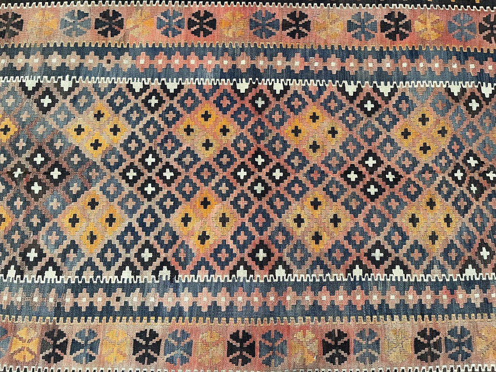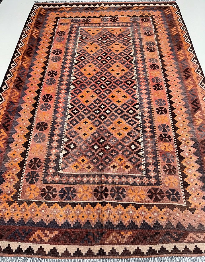 Full Room Size Authentic Hand Woven Vintage Afghan Meymaneh Kilim Rug. Above All It Has A Pure Wool Pile On Wool Base. Faded Terracotta, Antique Pink, Beige, Indigo Blue, Charcoal And Brown Tone Dyed Using Traditional Methods.