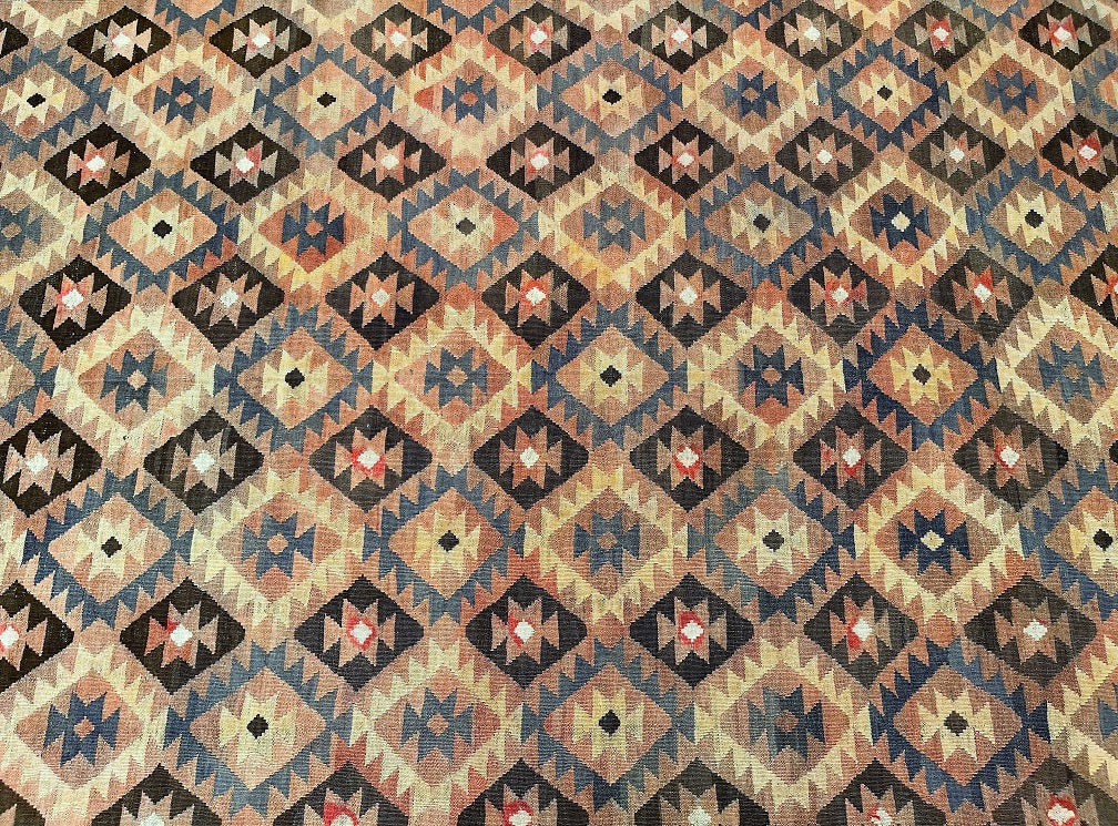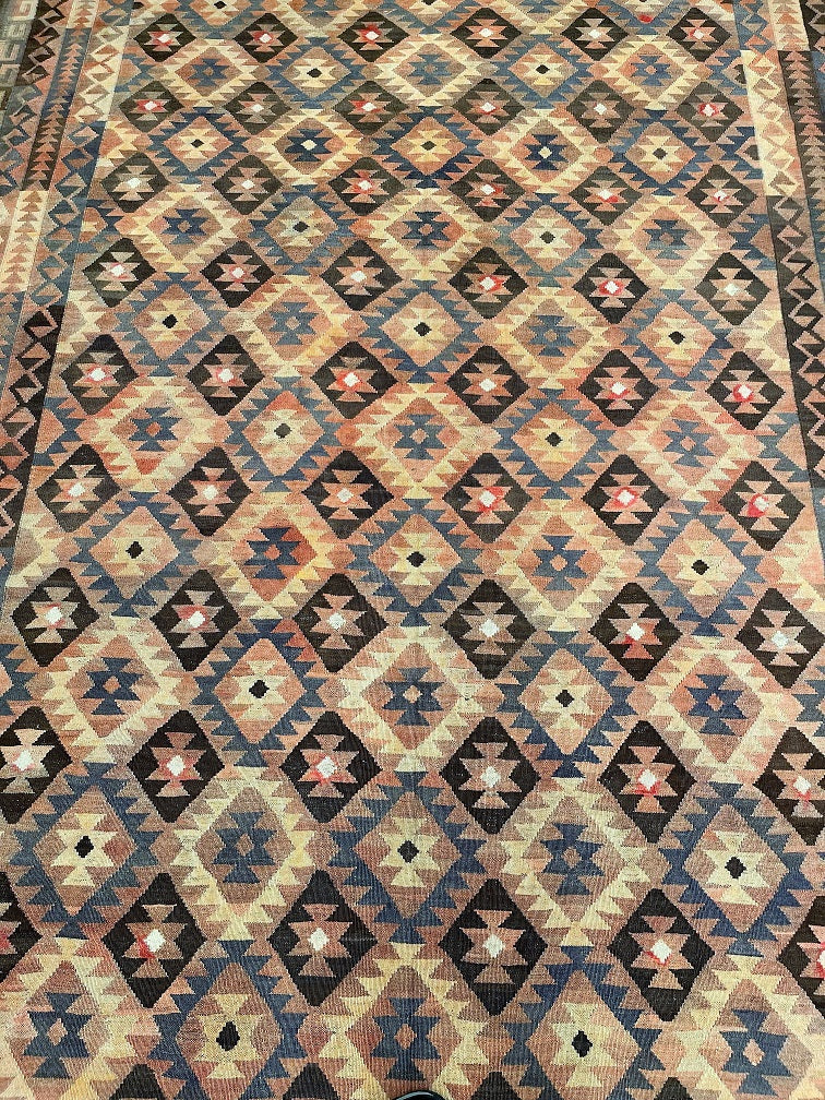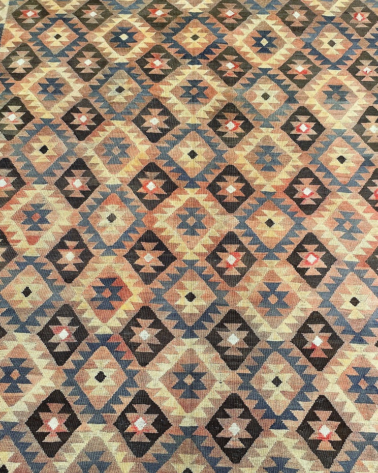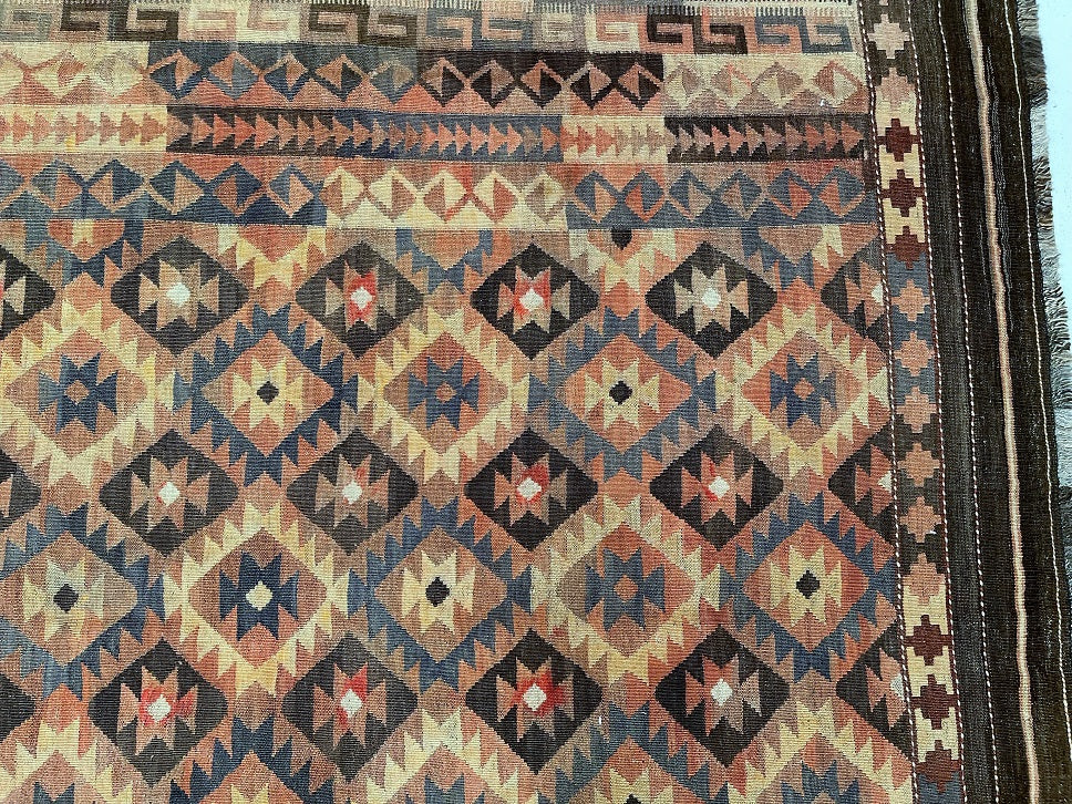 Authentic hand woven Afghan Meymaneh kilim rug, crafted from pure wool. This striking vintage piece features a classic geometric diamond lattice design, showcasing earthy tone of sand beige, camel, warm terracotta, muted rust, slate blue and chocolate brown, beautifully balanced with soft ivory and subtle red accents throughout. The bold tribal motifs and multi-layered borders highlight the traditional Meymaneh weaving style, creating a warm, timeless statement ideal for large living or dining spaces.