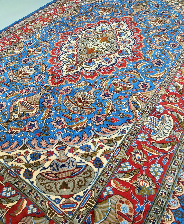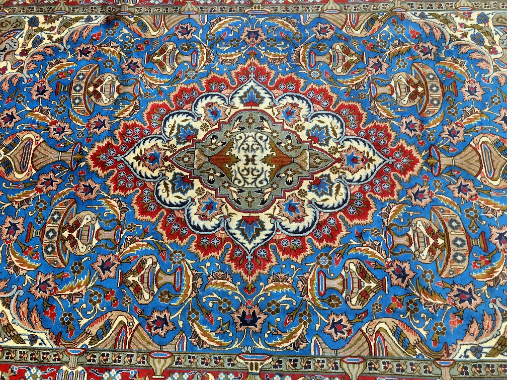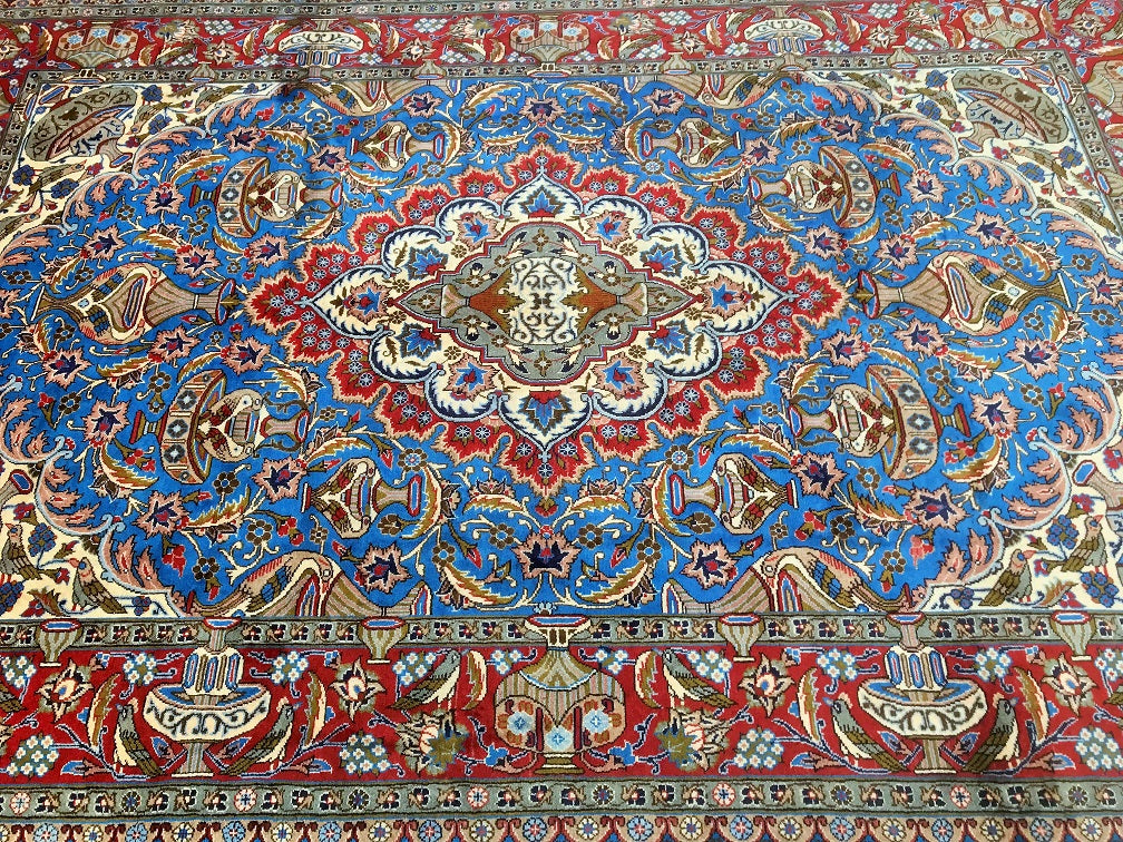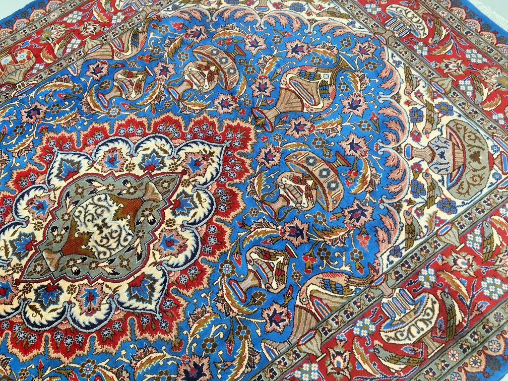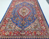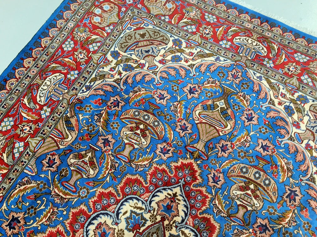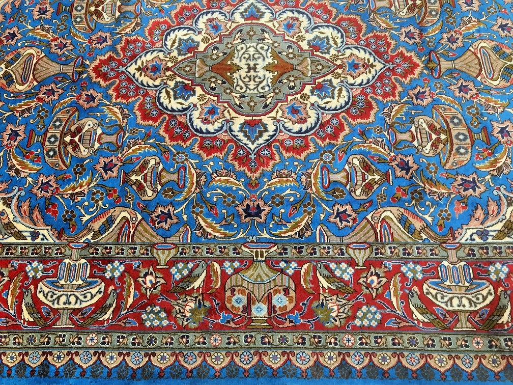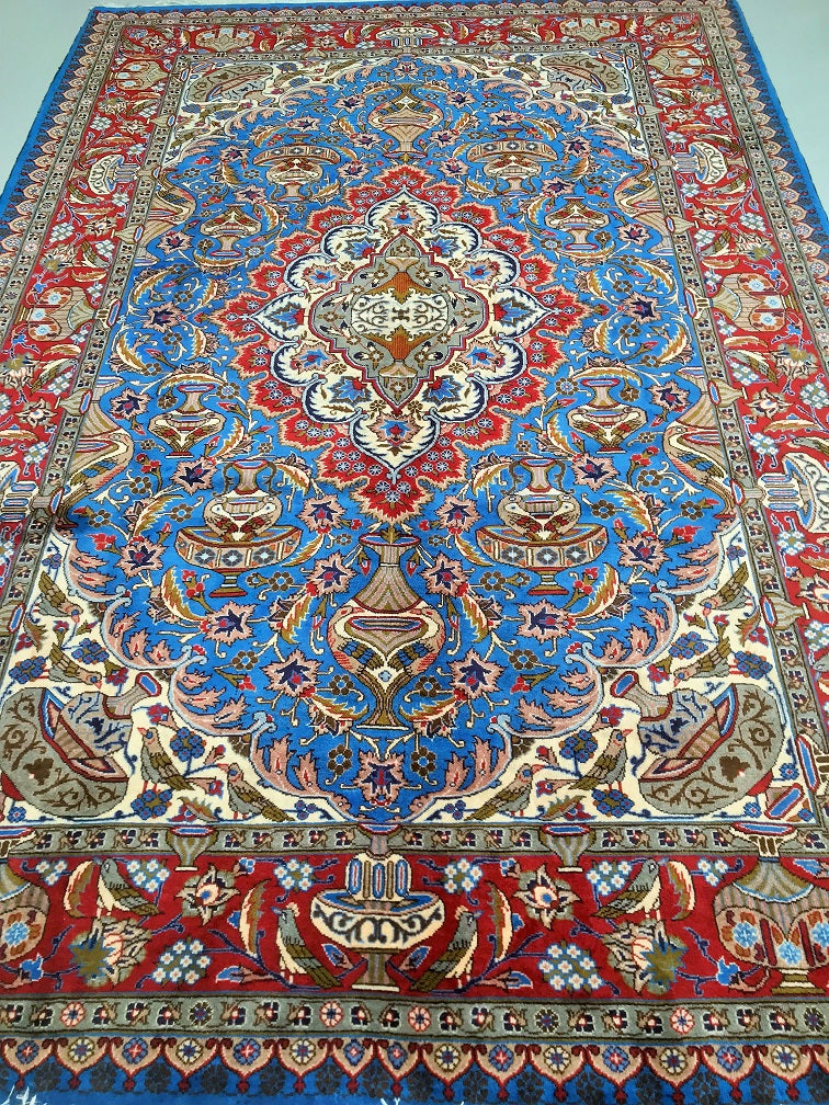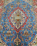 Full Room Size Vintage Treasure Design Persian Kashmar Carpet. Above All Hard To Get This Quality Hand Made Rug In Larger Sizes, Pure Lamb’s Pile On Cotton Base. It Also Has A French Blue & Burnt Orange Tones Dyed Using Traditional Methods. Dense Quality Piece, It Would Last A Life Time.