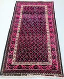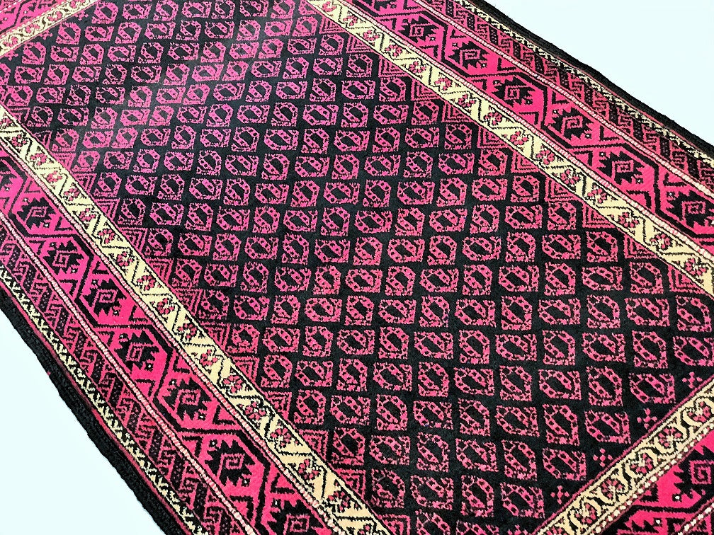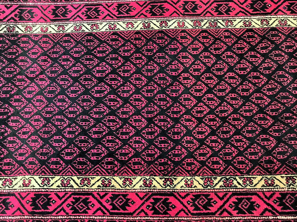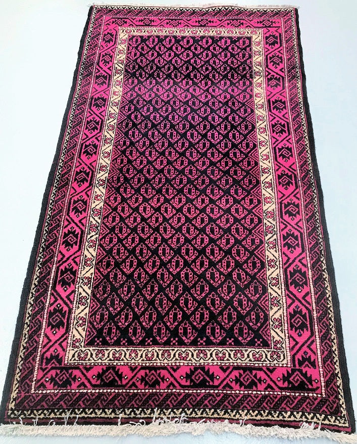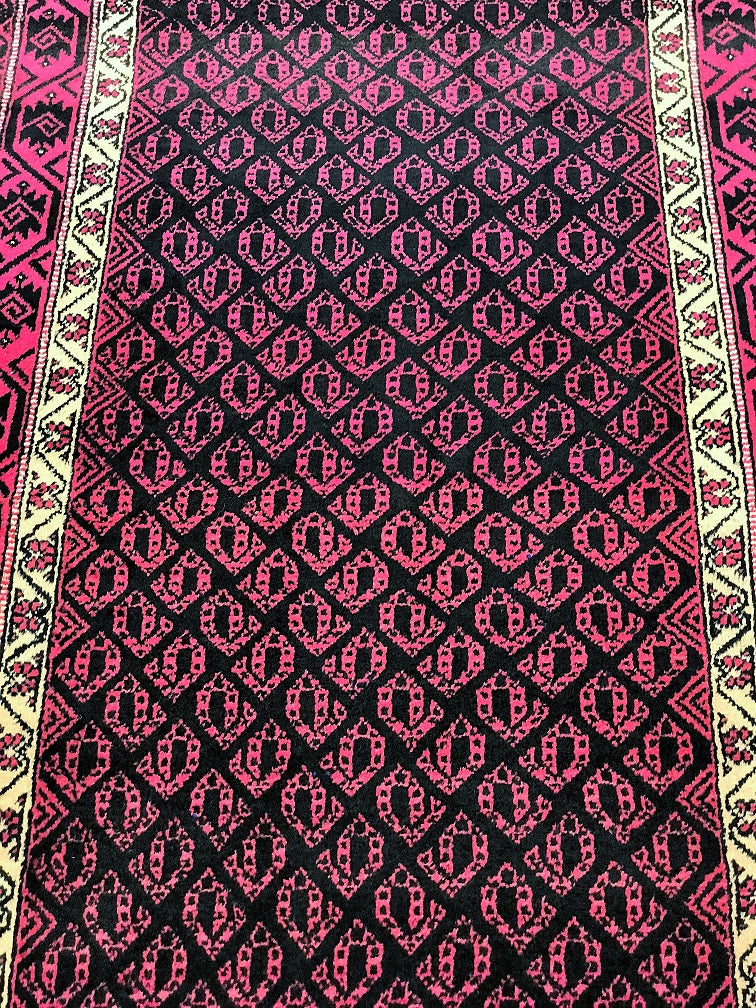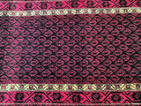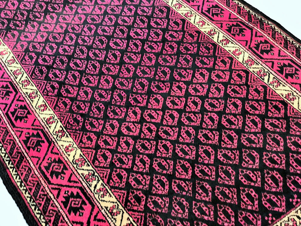 Rare Paisley Design Vintage Persian Tribal Balouchi Rug. Above All It Has Pure Hand Spun Wool Pile On Cotton Base. Pink And Black Tone Dyed Using Traditional Methods.