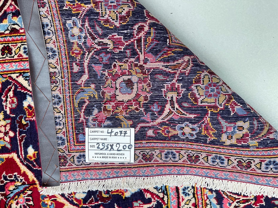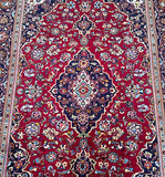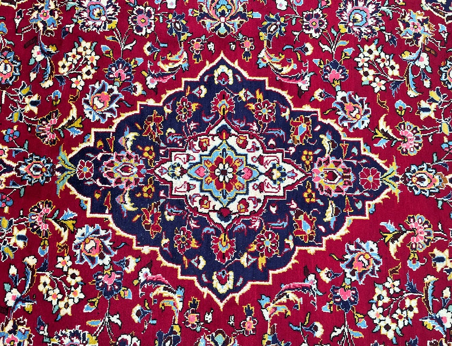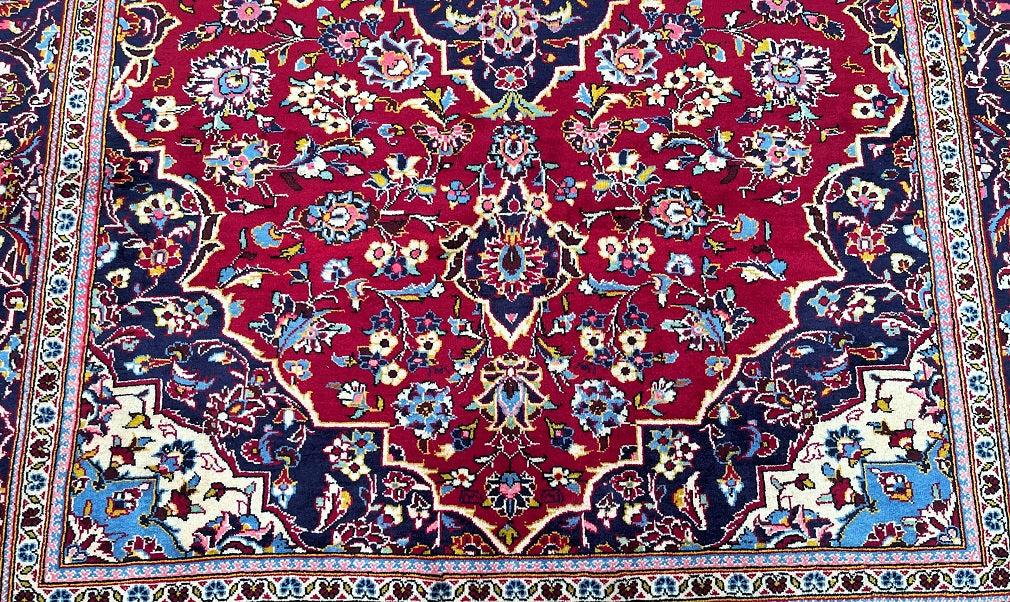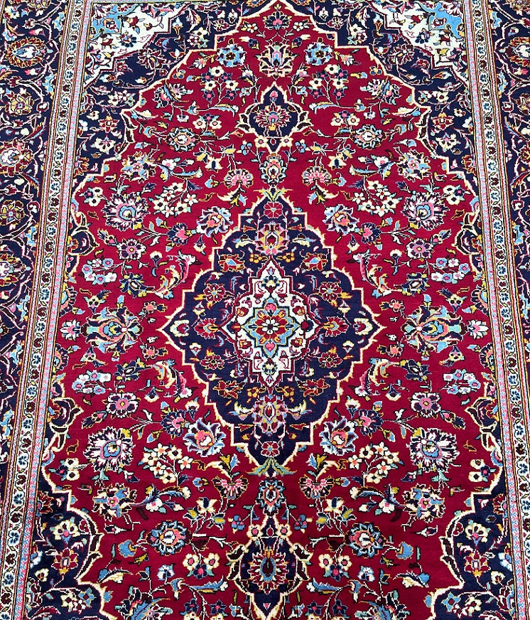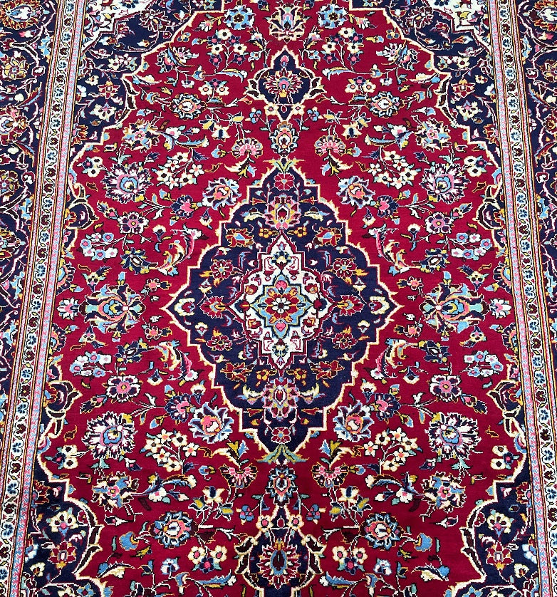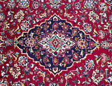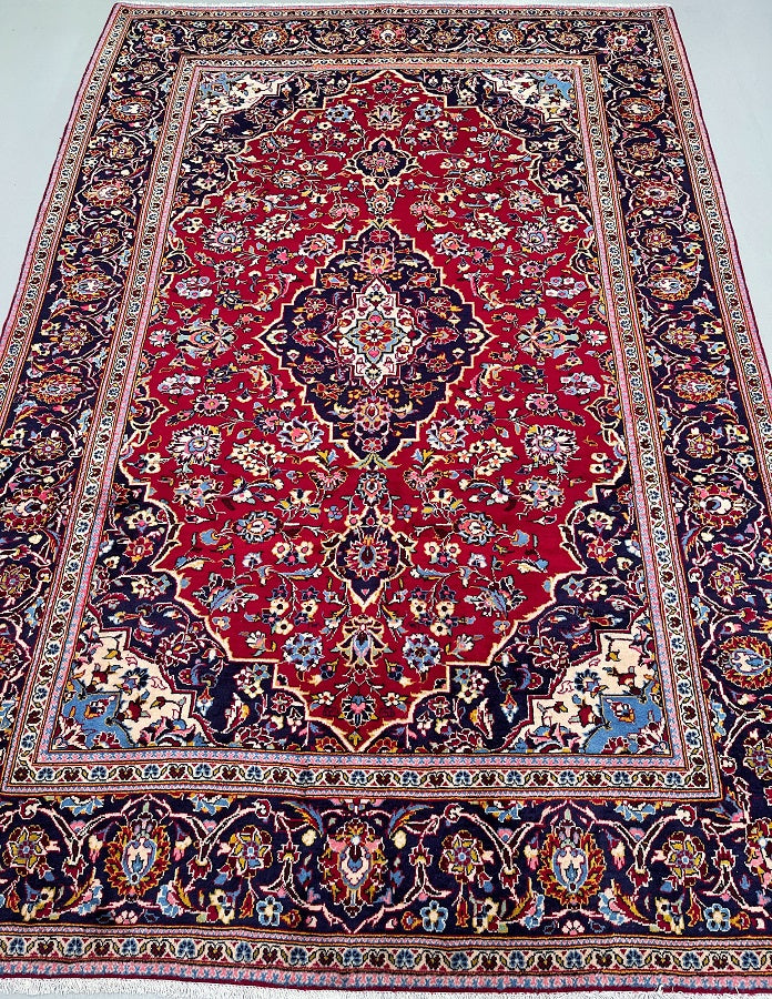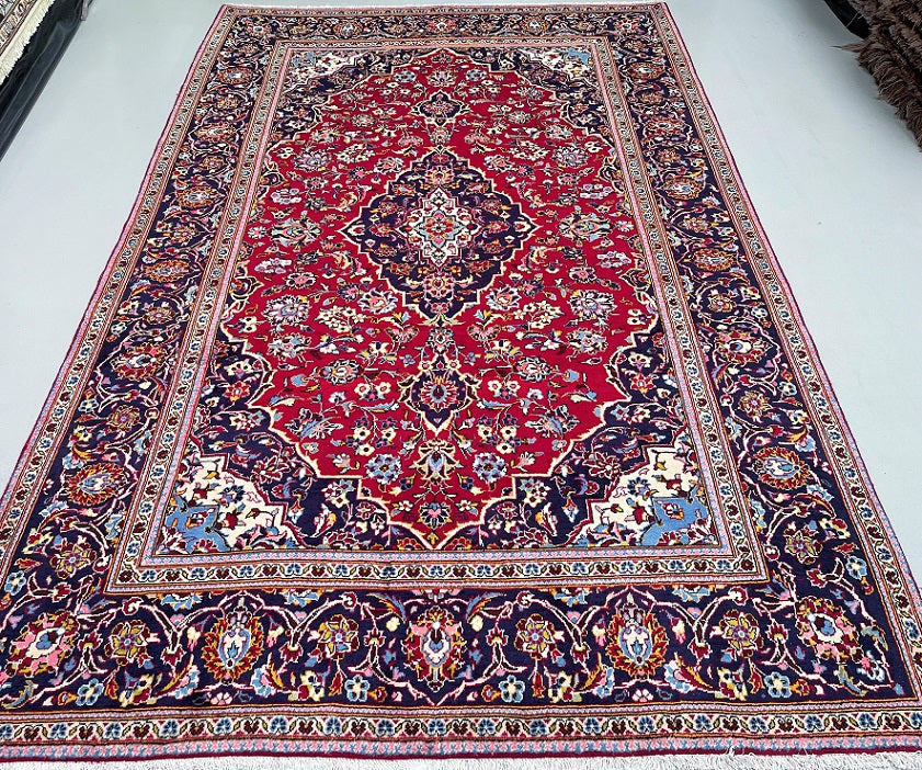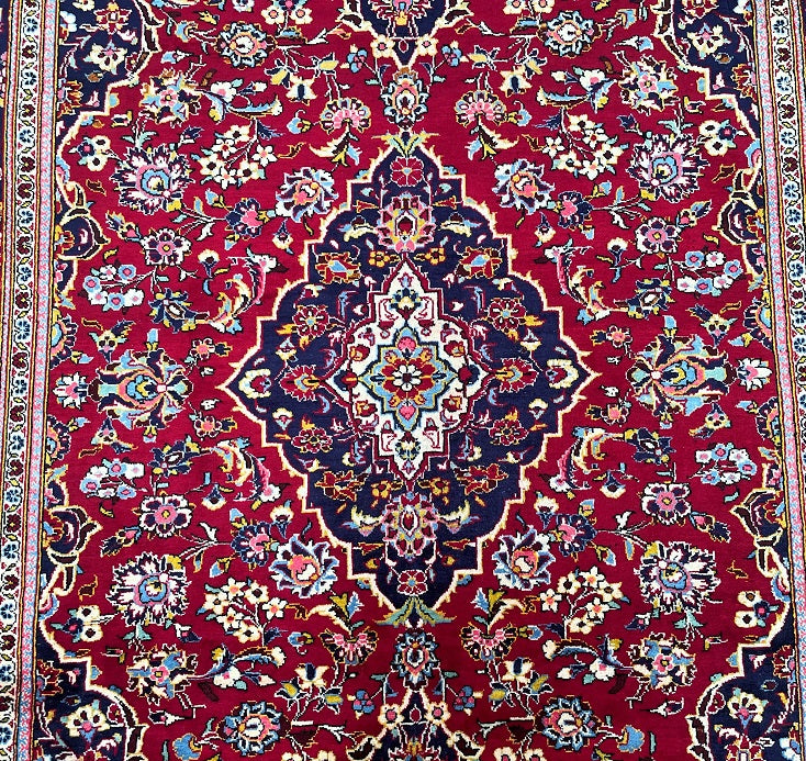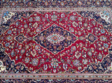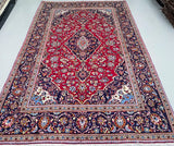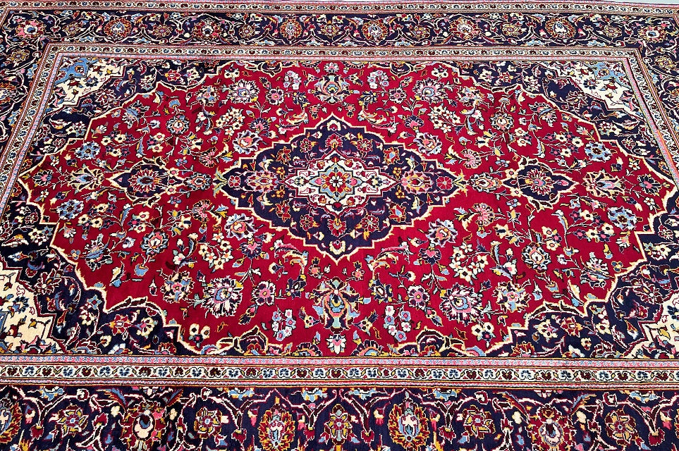 Full Room Size Authentic Handmade Vintage Persian Kashan rug. Above All It Is It Has A Pure Wool Pile on Cotton Base. Traditional Red, Beige And Blue Tones Dyed Using Traditional Methods.