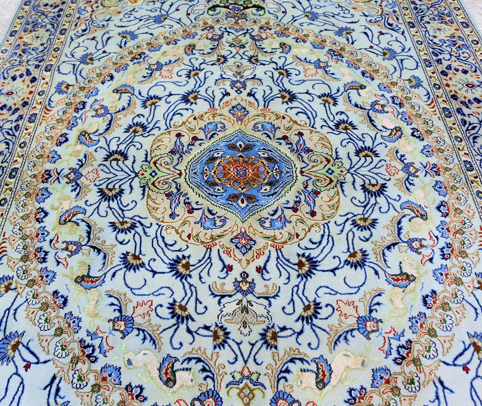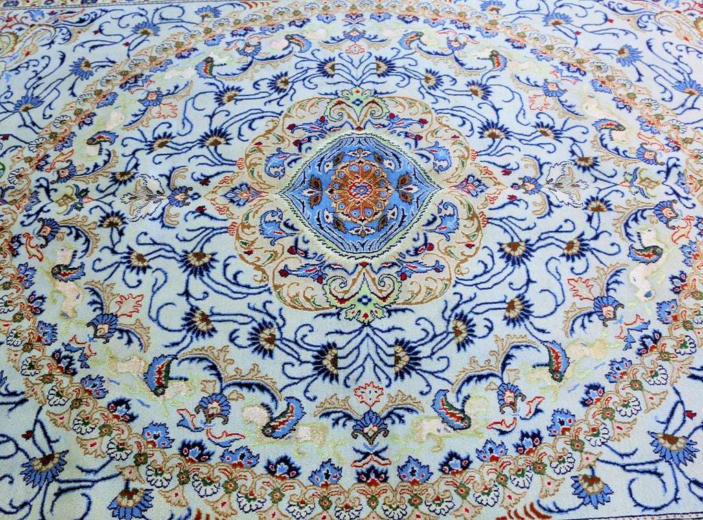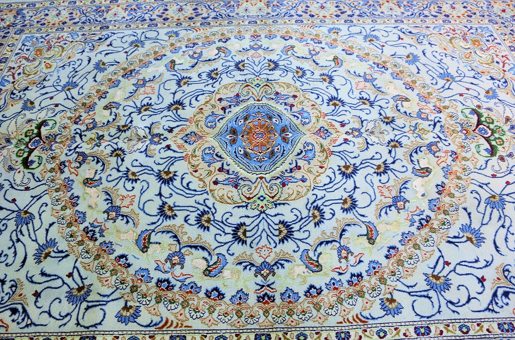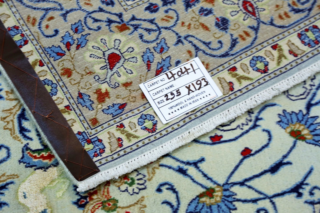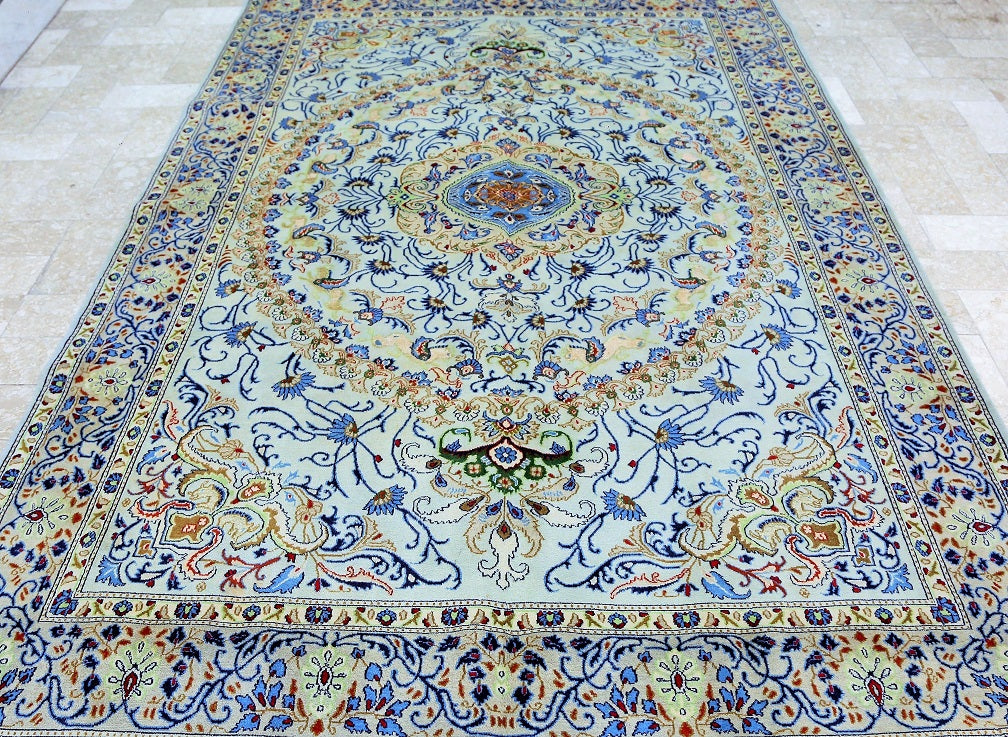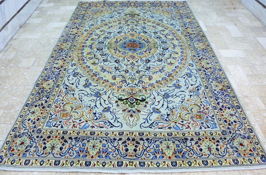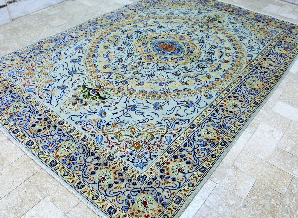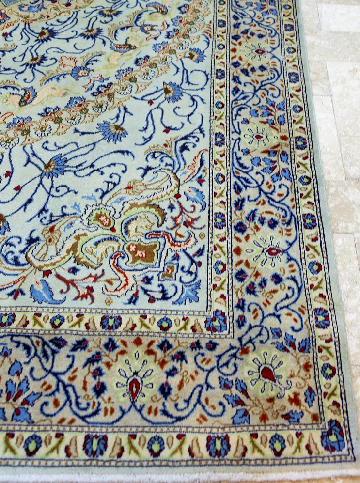 Rare Antique Large Room Size Authentic Persian Mood Rug. Lamb’s Wool and Silk Inlaid Pile On Cotton Base. Pistachio and Blue Tone Dyed Using Traditional Methods.