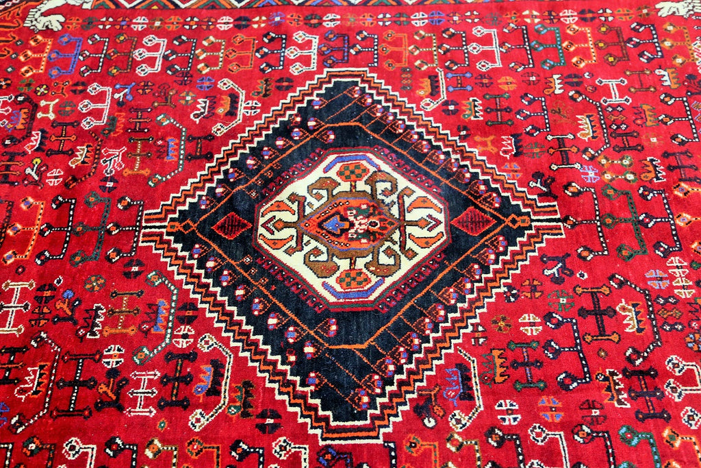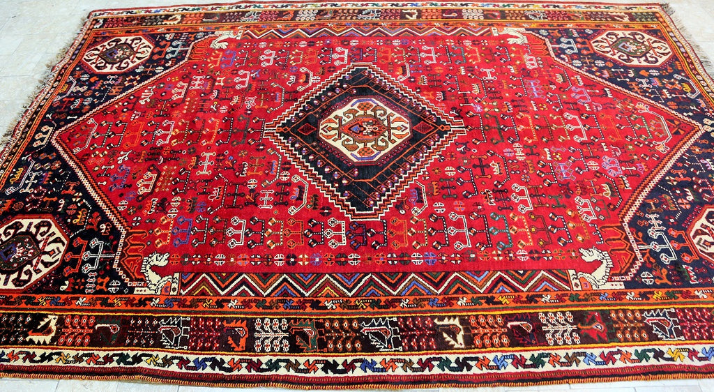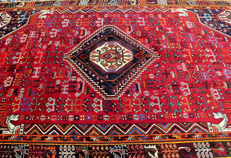 Stunning Vintage Room Size Hand Knotted Persepolis Design Qashghai Shiraz Rug. Above All It Is Hard To Find This Quality Original Handmade In Larger Sizes. Pure Hand Spun Wool Pile On Wool Base. It Also Has A Shiny Red Tone Dyed Using Traditional Methods.