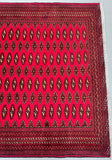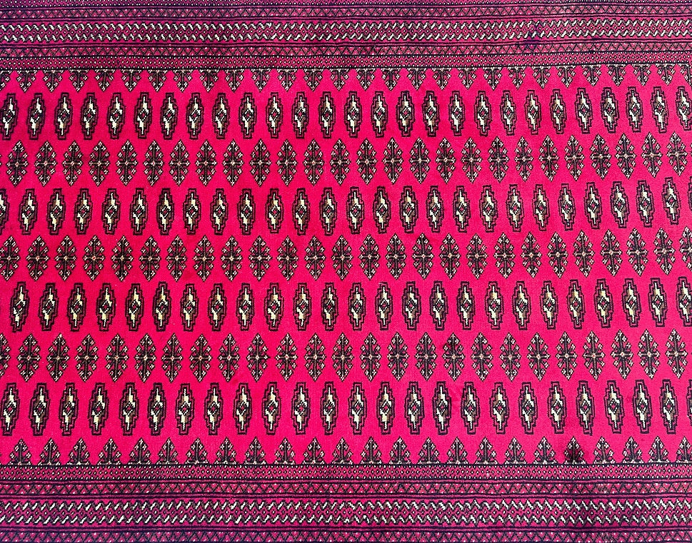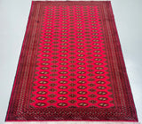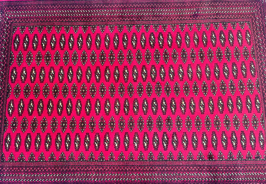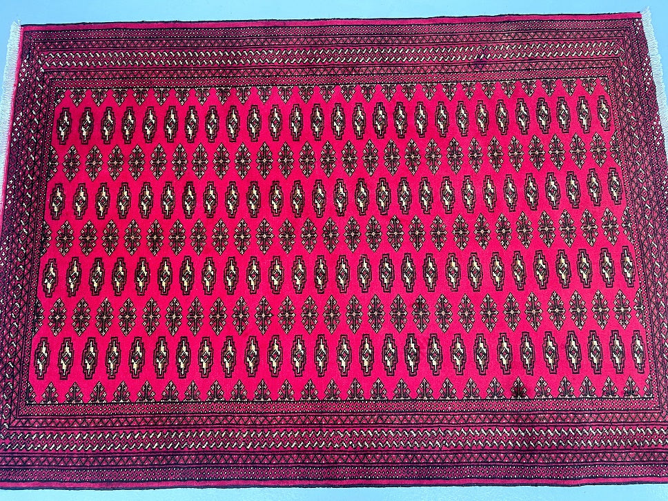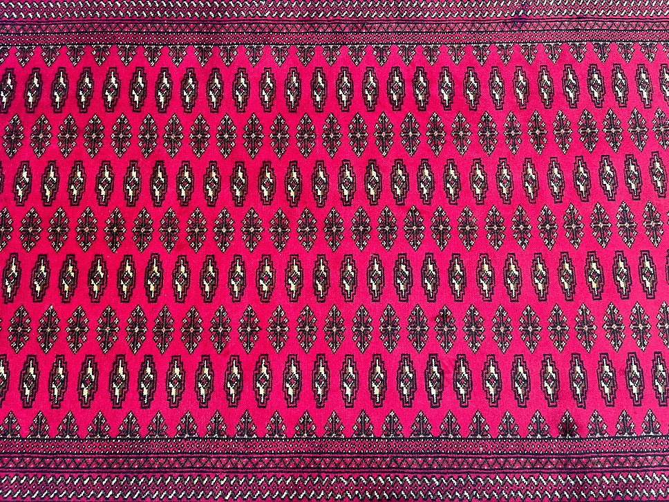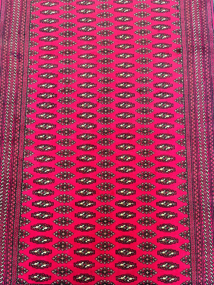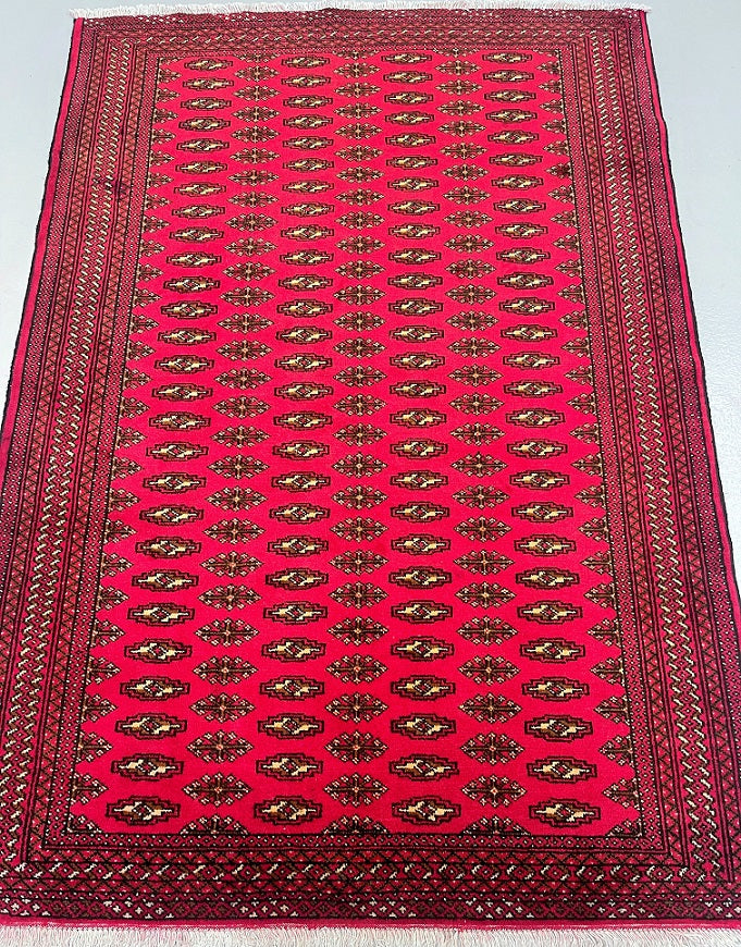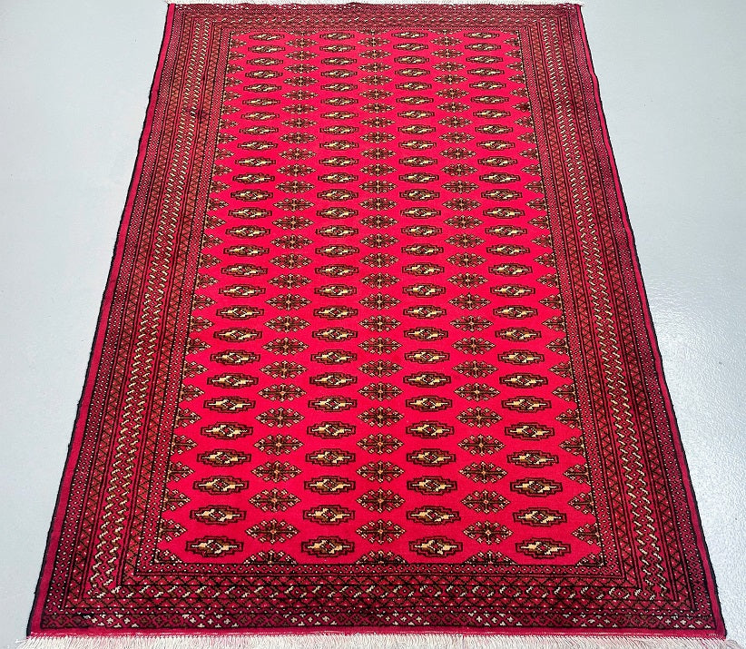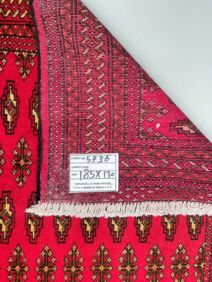 This vintage Persian Turkoman rug, dating back to the 1980s, showcases an authentic handmade tribal Bokhara design. Crafted with utmost care, it features a pure hand-spun wool pile on a wool base. The rug boasts a captivating color palette, with red, beige, black, and brown tones achieved through traditional dyeing methods. Its renowned Bokhara pattern showcases an allover geometric design. The fine workmanship of this rug is evident, as it would have taken a skilled weaver approximately 4 months to complete. Hand-woven in East Persia, this rug measures 185 x 130 cm and holds a gallery replacement value of $1990.