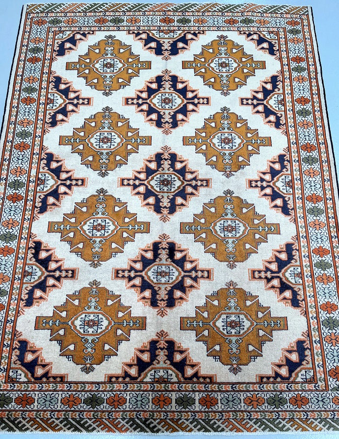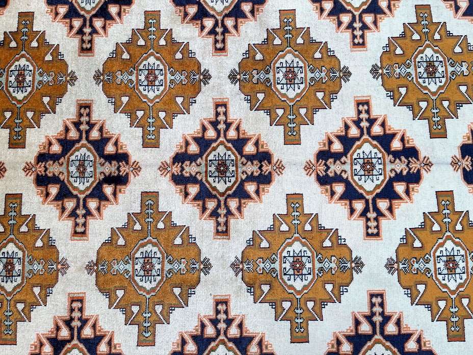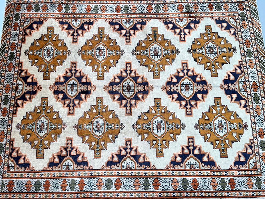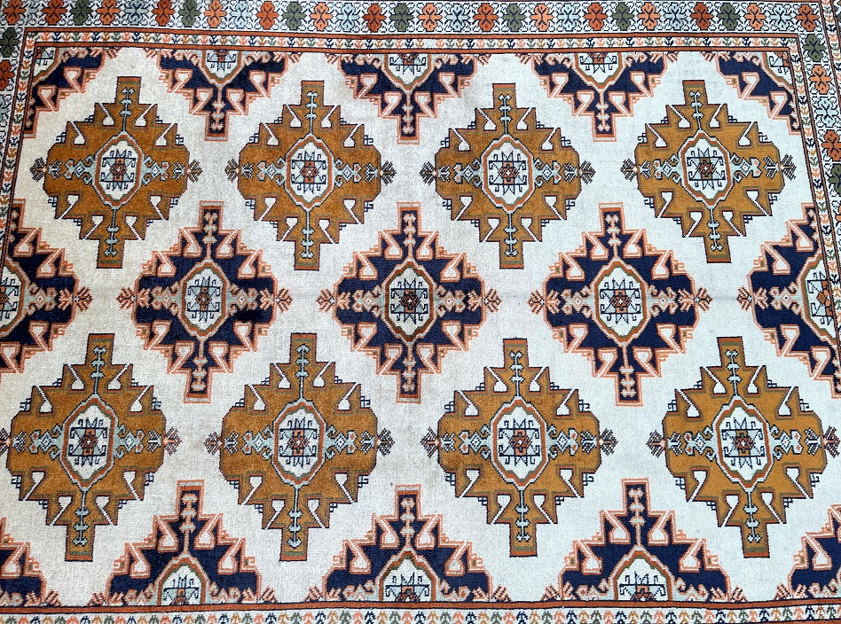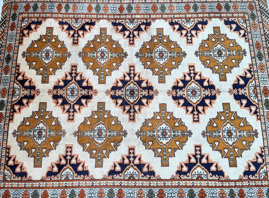 Authentic Handmade Vintage Persian Turkoman Rug Circa 1980’s. Above All It Is Pure Hand Spun Wool Pile On Wool Base. Beige, Orange, Mustard, Green And Blue Tones Dyed Using Traditional Methods.