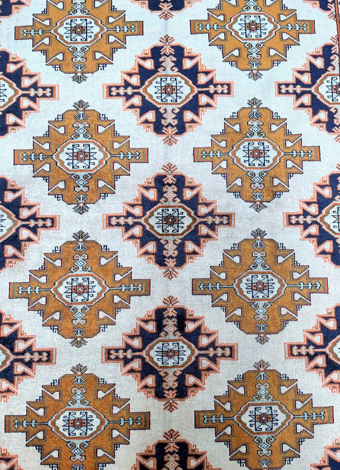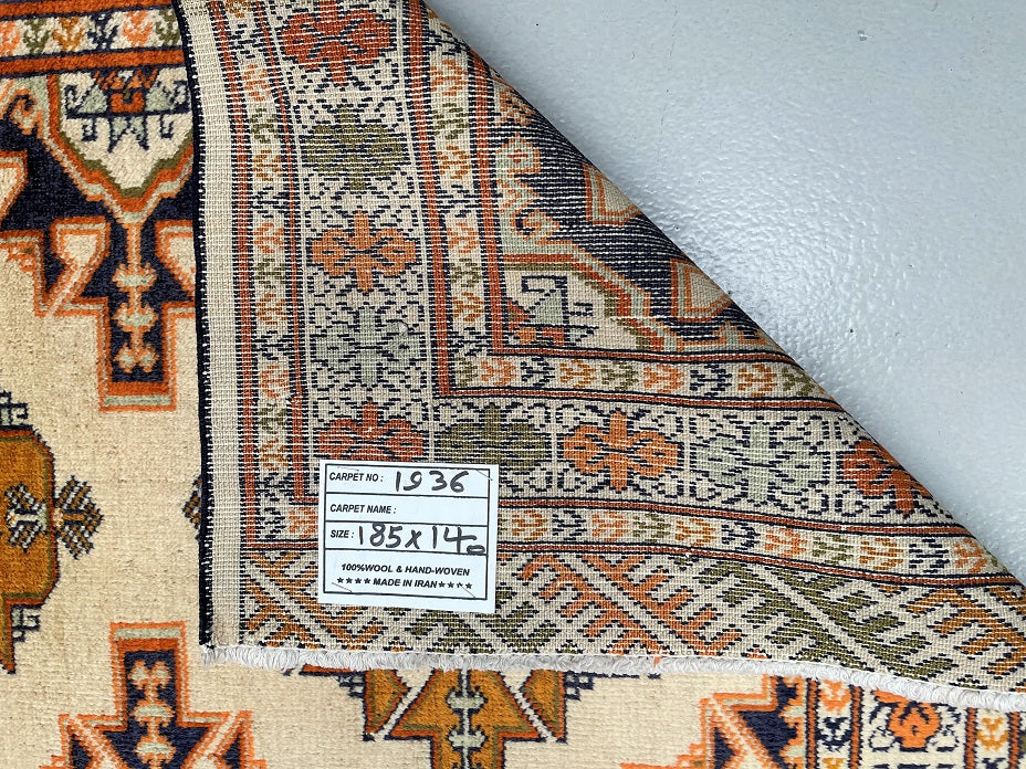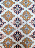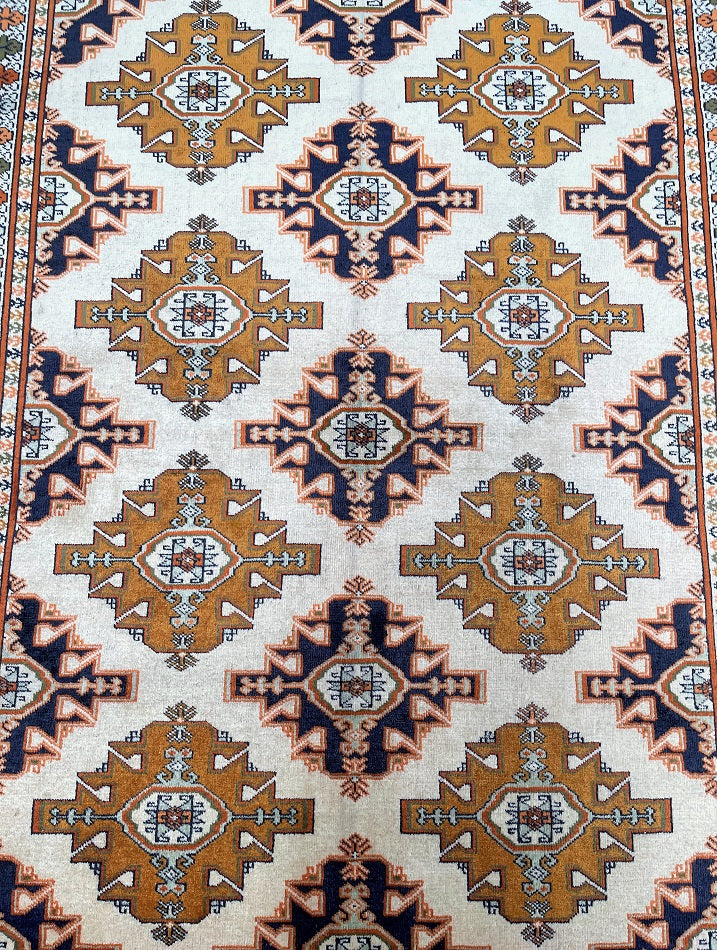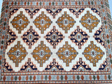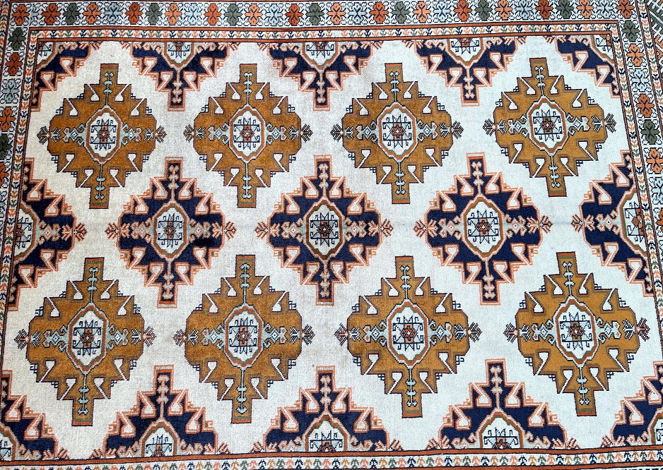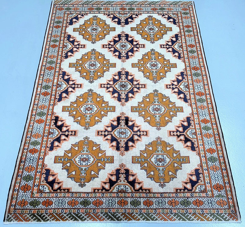 Authentic Handmade Vintage Persian Turkoman Rug Circa 1980’s. Above All It Is Pure Hand Spun Wool Pile On Wool Base. Beige, Orange, Mustard, Green And Blue Tones Dyed Using Traditional Methods.