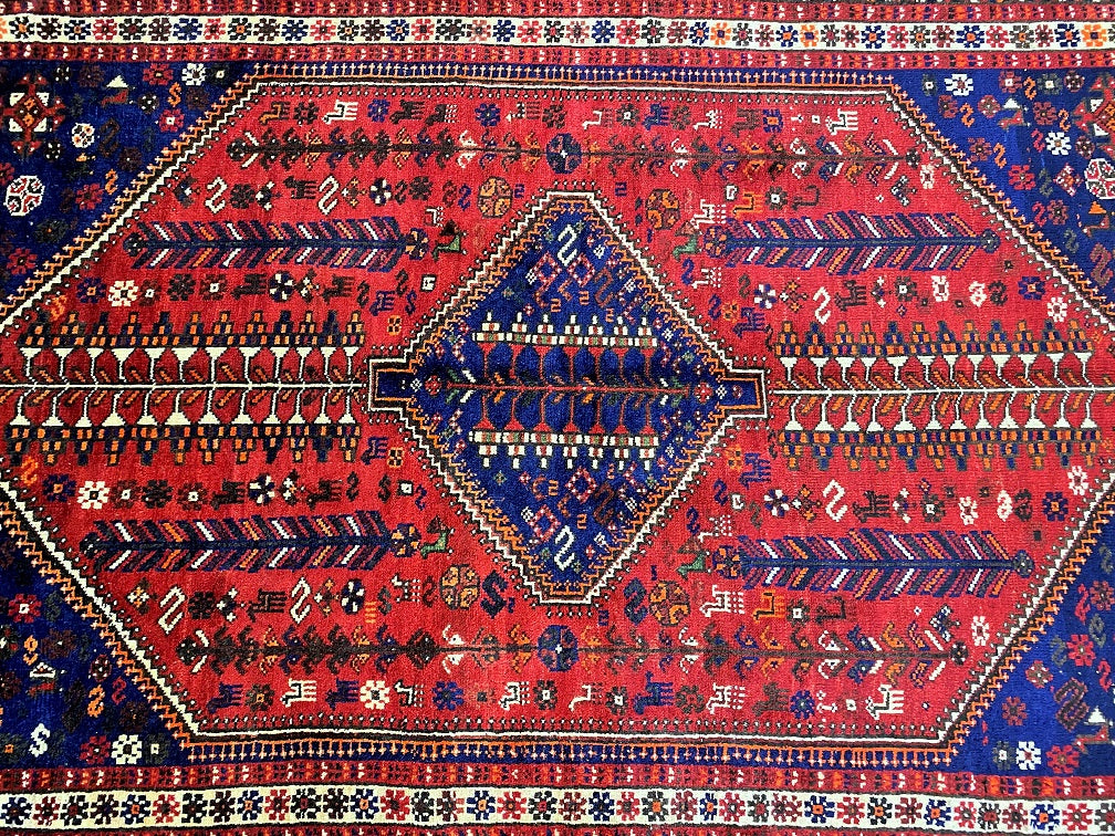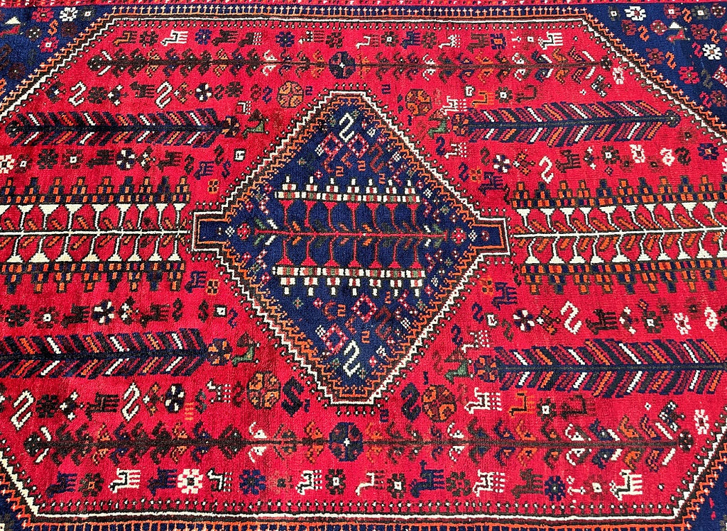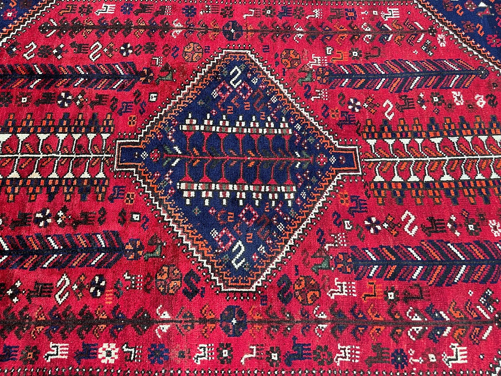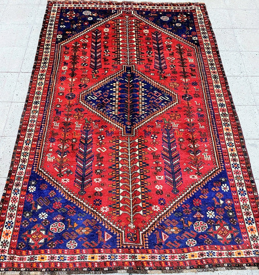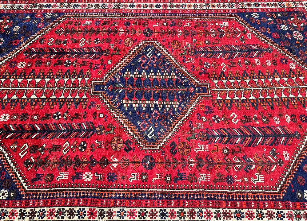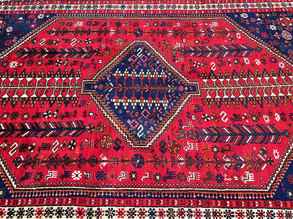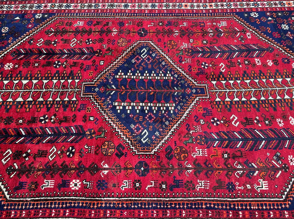 Unique Room Size Handmade Vintage Persian Shiraz Rug. Above All It Has A Pure Hand Spun Wool Pile On Wool Base. Rich Red And Indigo Blue Tone Dyed Using Traditional Methods.