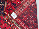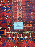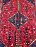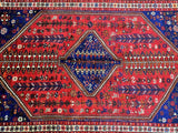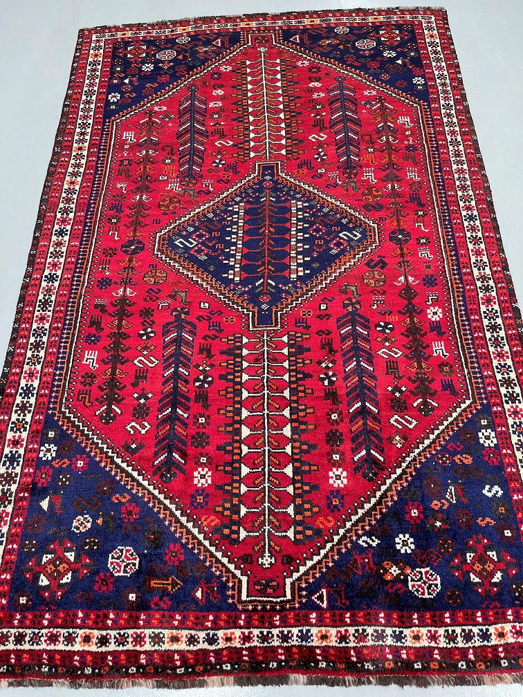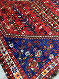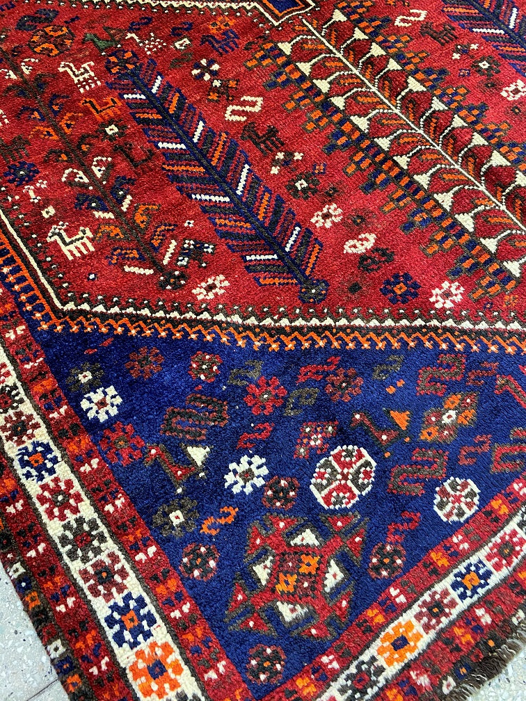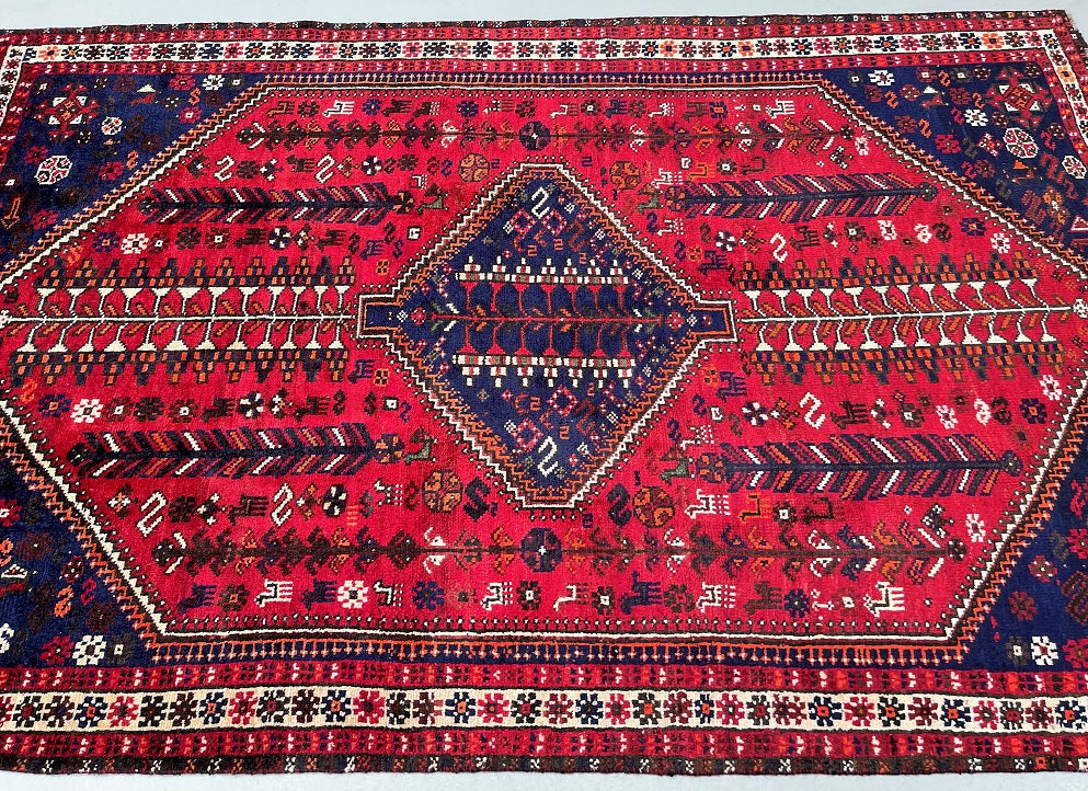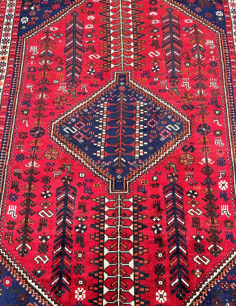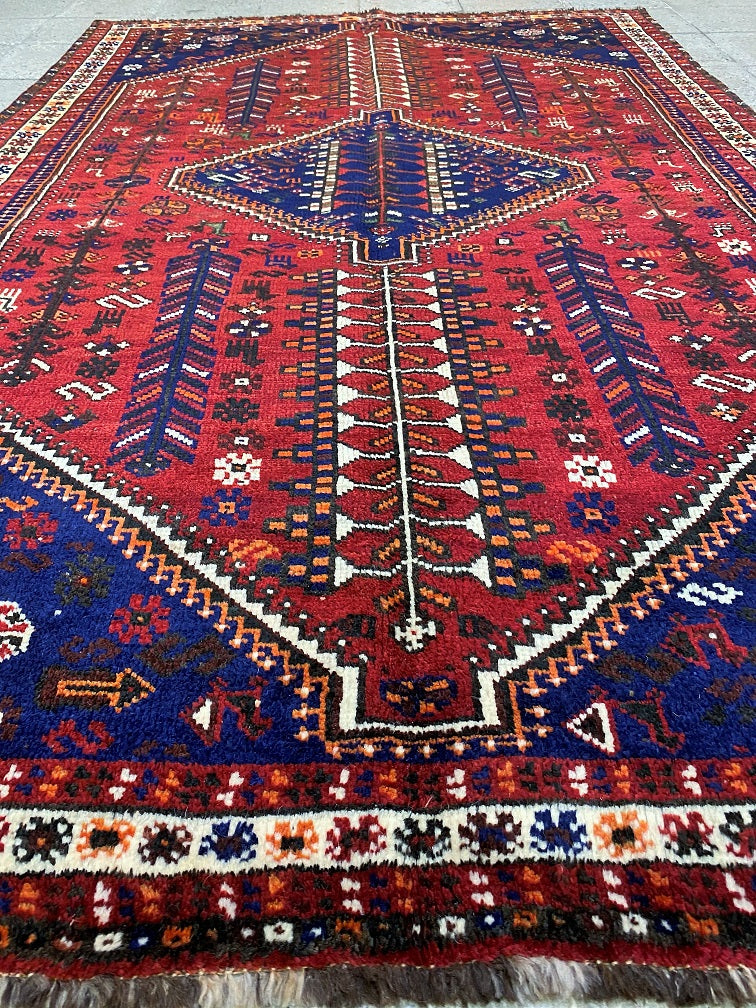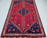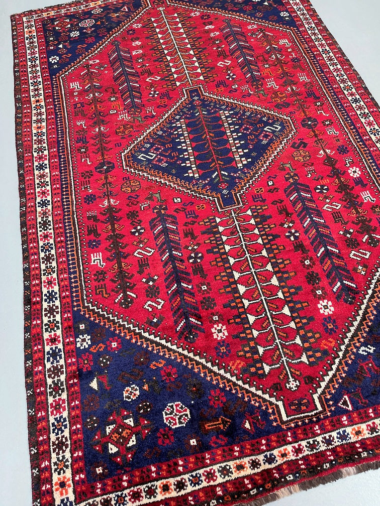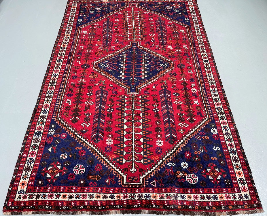 Unique Room Size Handmade Vintage Persian Shiraz Rug. Above All It Has A Pure Hand Spun Wool Pile On Wool Base. Rich Red And Indigo Blue Tone Dyed Using Traditional Methods.